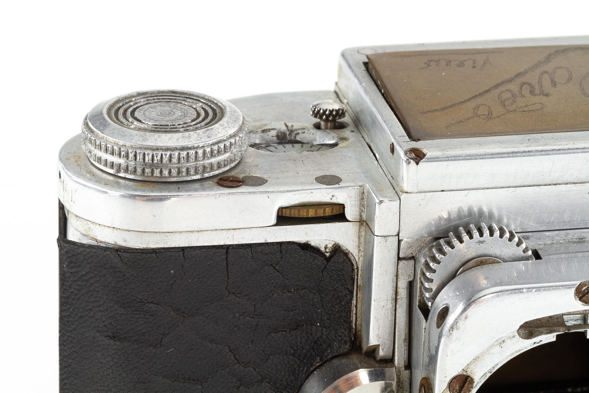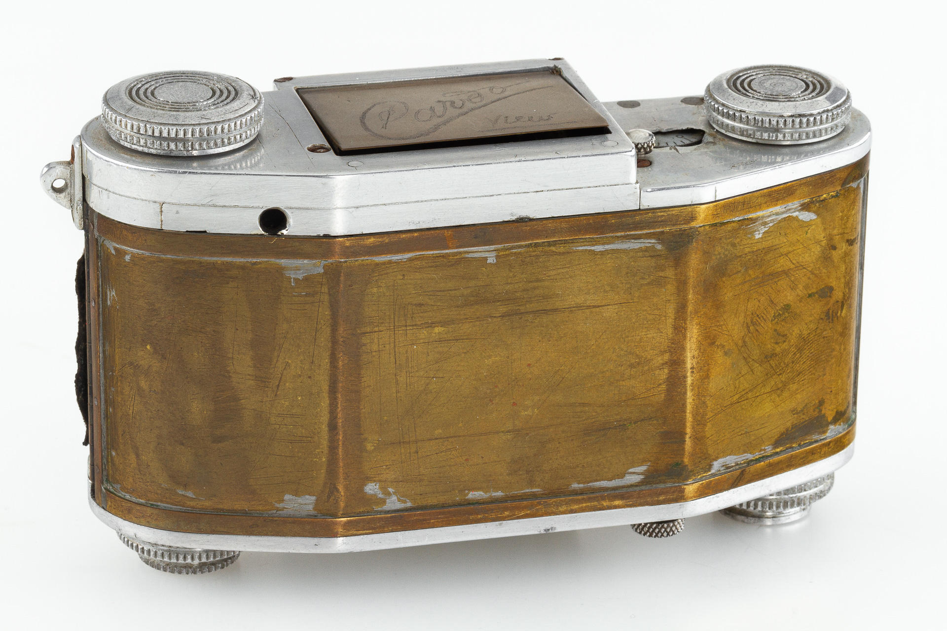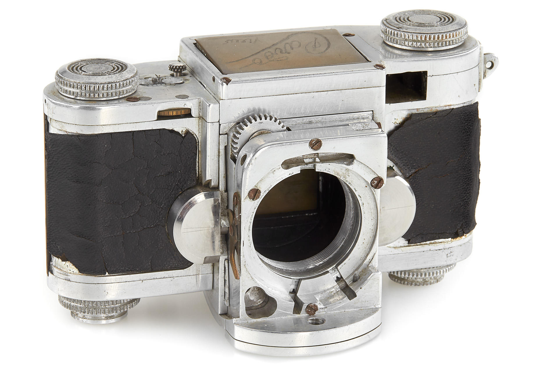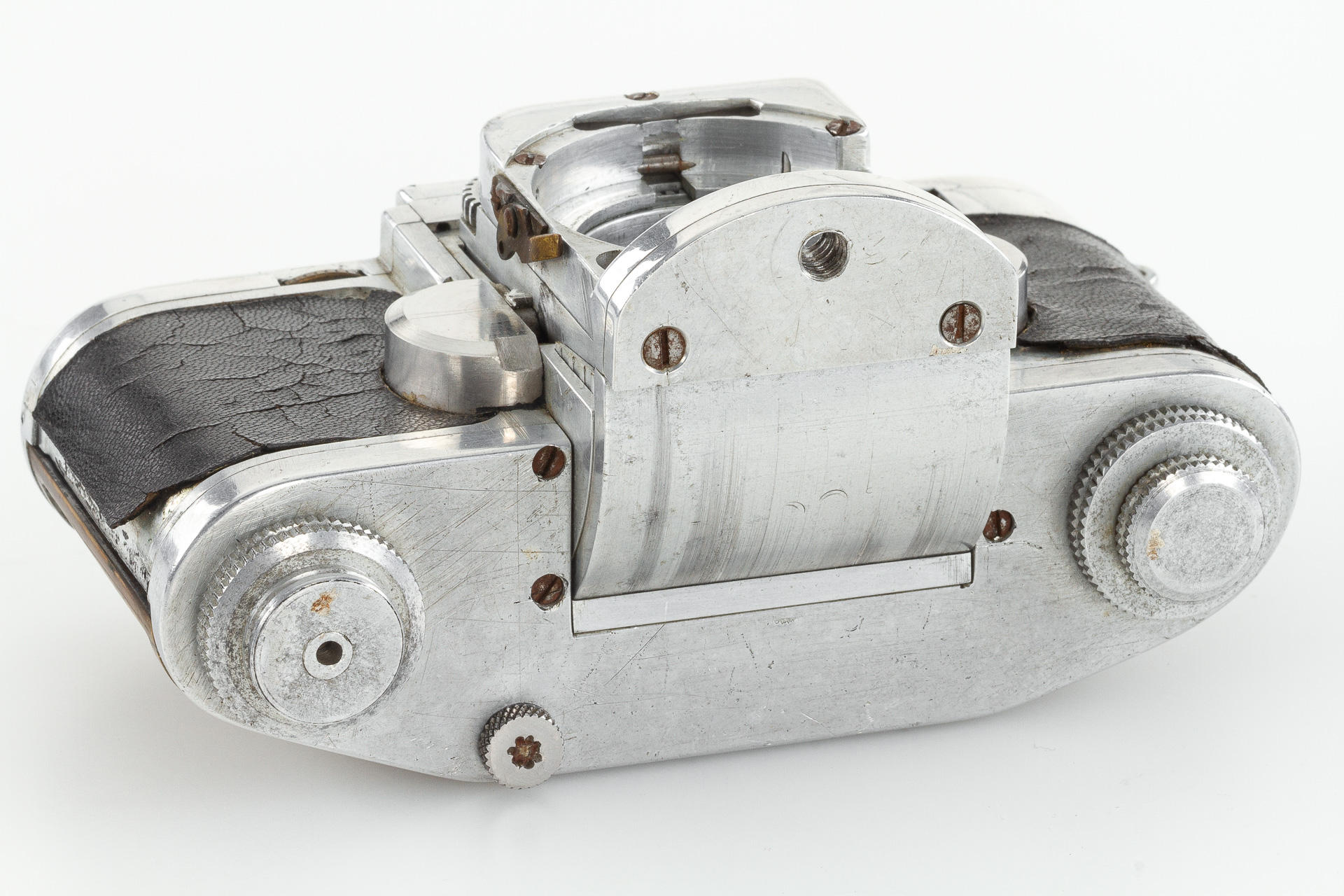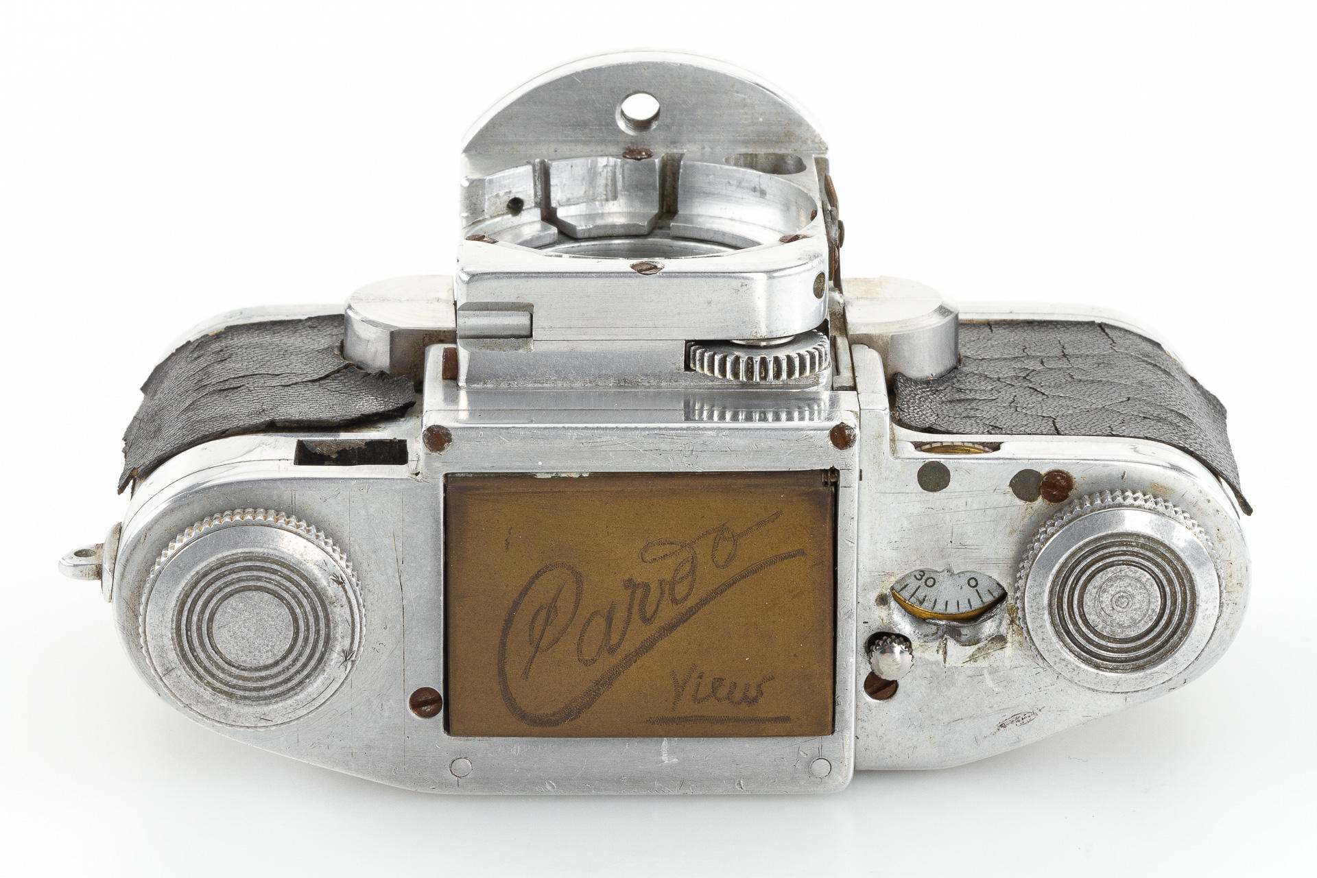 a non-working prototype camera for 25x36mm exposures on 35mm film, unknown maker, a unique focusing system with downwards-swinging camera body with the lens mount attached to a tripod, hand-engraved on the finder cover with 'Cardo View'