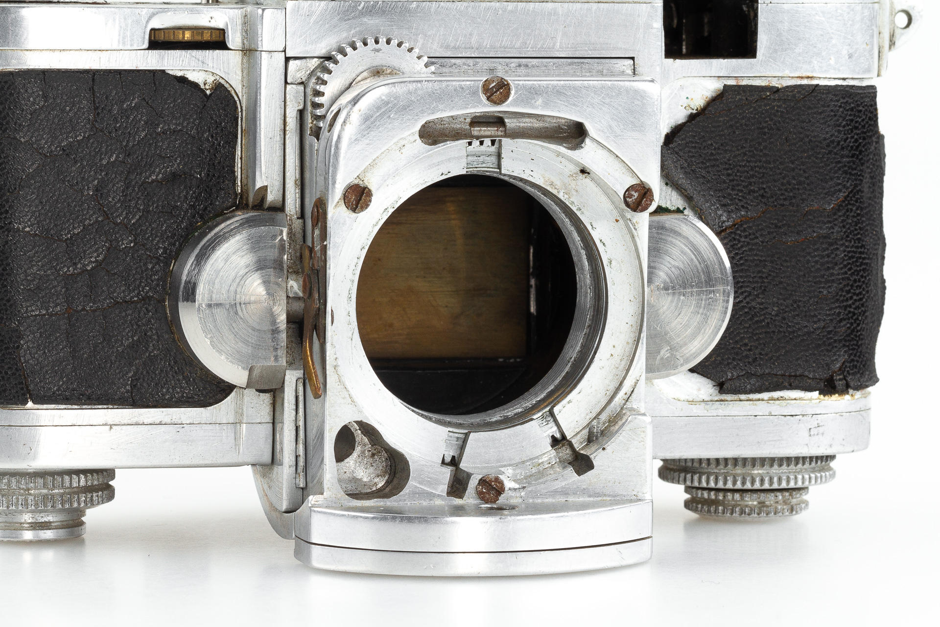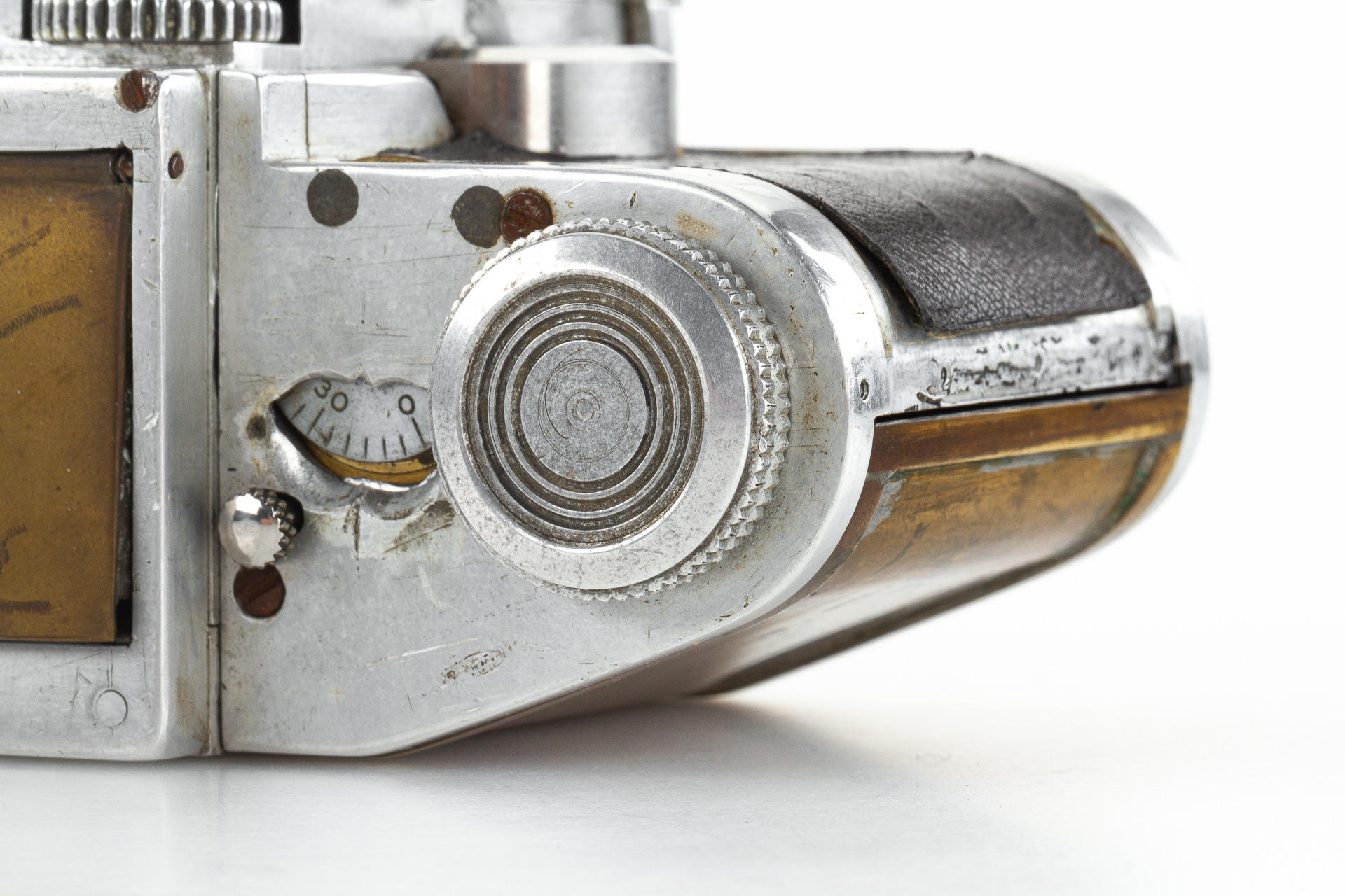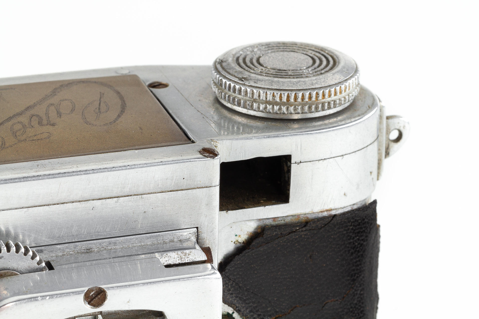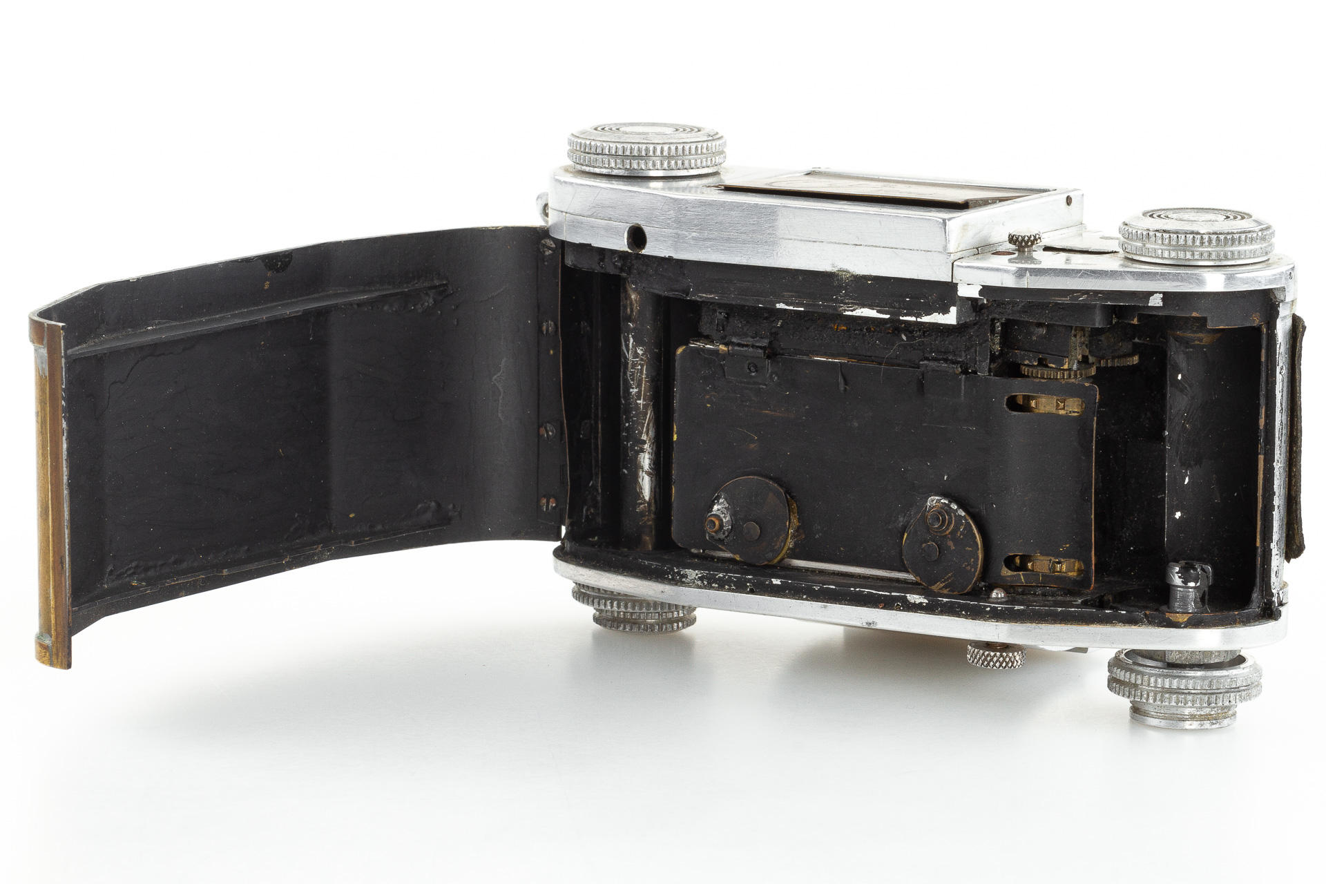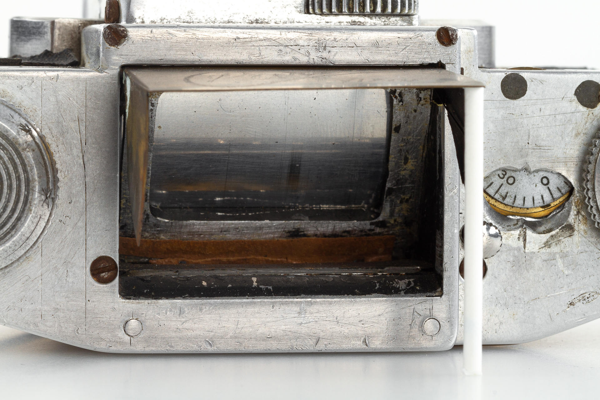 a non-working prototype camera for 25x36mm exposures on 35mm film, unknown maker, a unique focusing system with downwards-swinging camera body with the lens mount attached to a tripod, hand-engraved on the finder cover with 'Cardo View'
