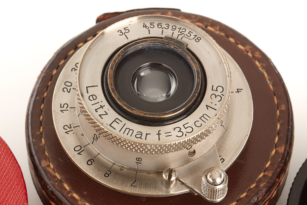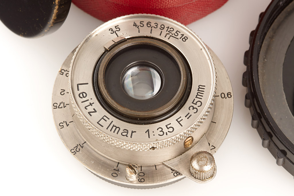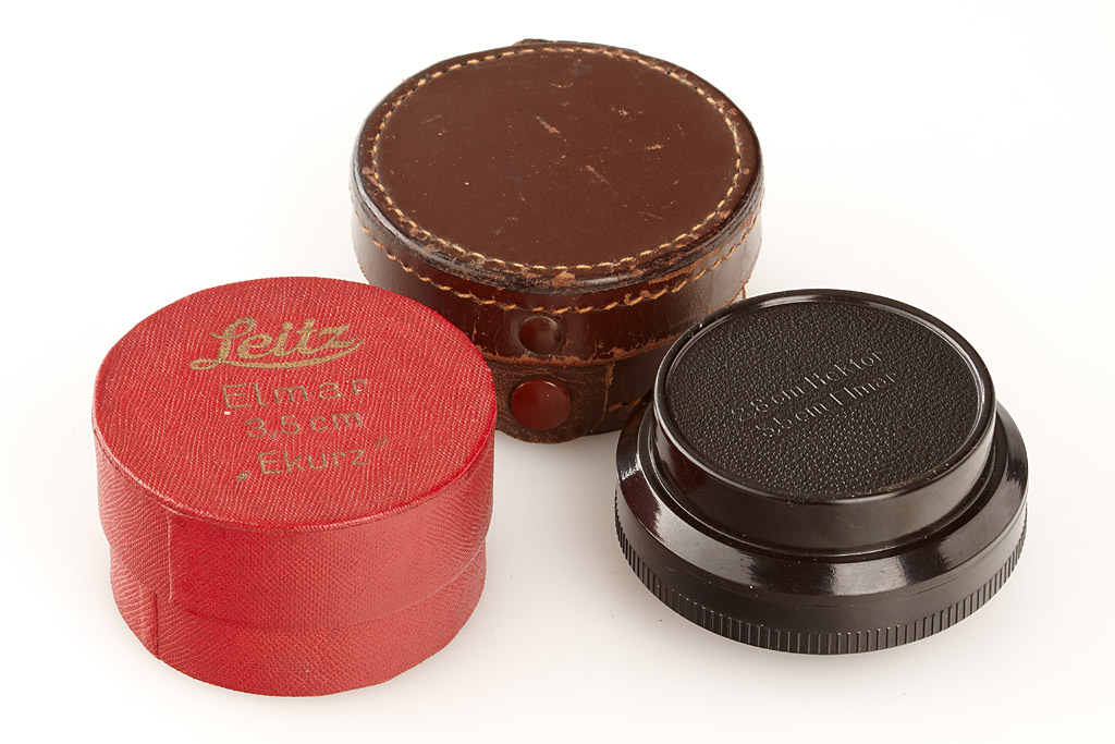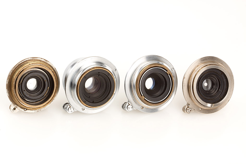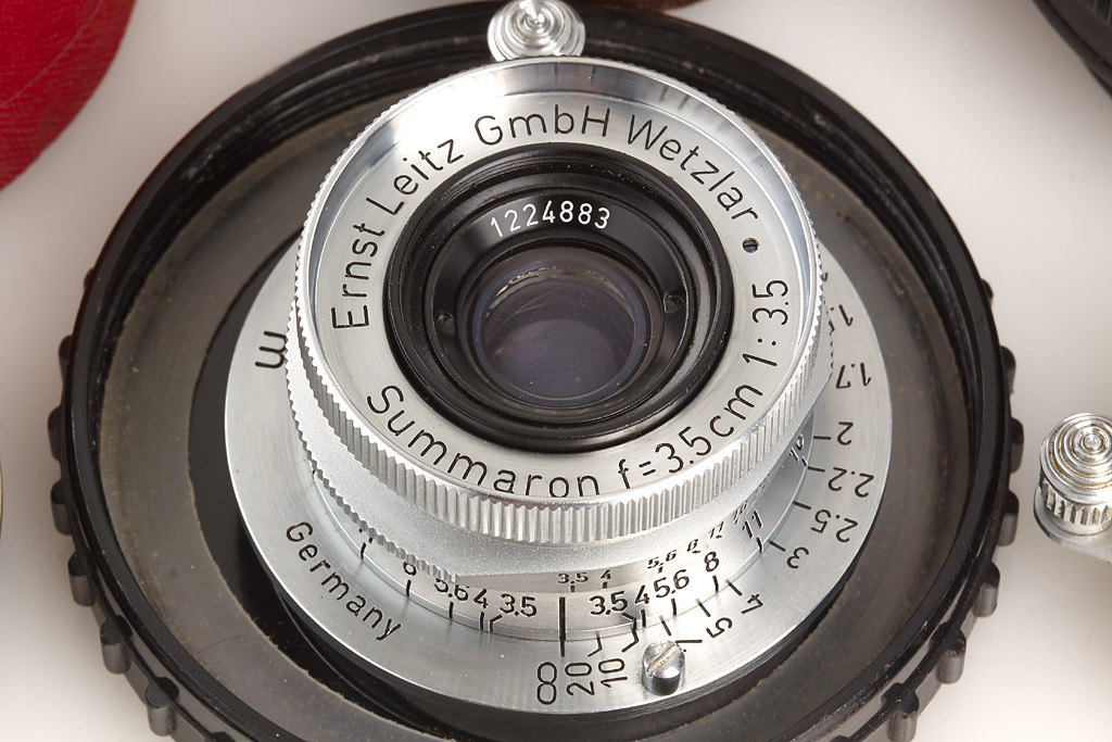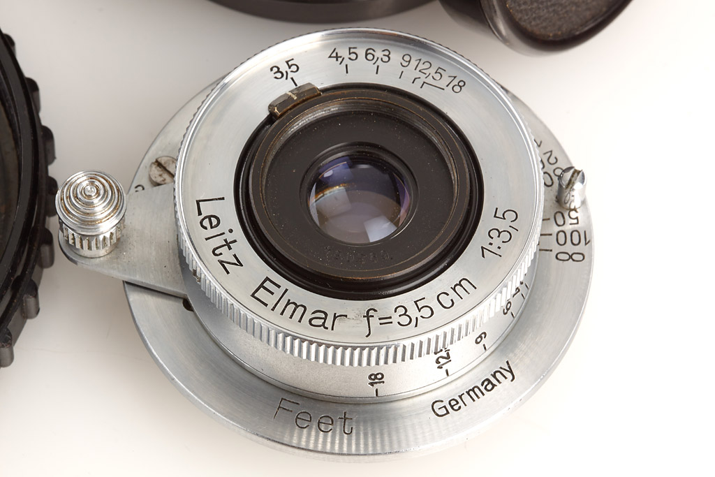 (1) nickel close-focus Elmar 3.5/3.5cm without serial number (Meter scale, caps, red maker's box), (2) nickel close-focus Elmar 3.5/3.5cm without serial number (Feet scale, keeper), (3) late coated post-war chrome Elmar 3.5/3.5cm no.693084 (cap, keeper), (4) A36 Summaron 3.5/3.5cm no.1224883 (cap, keeper) (4)
