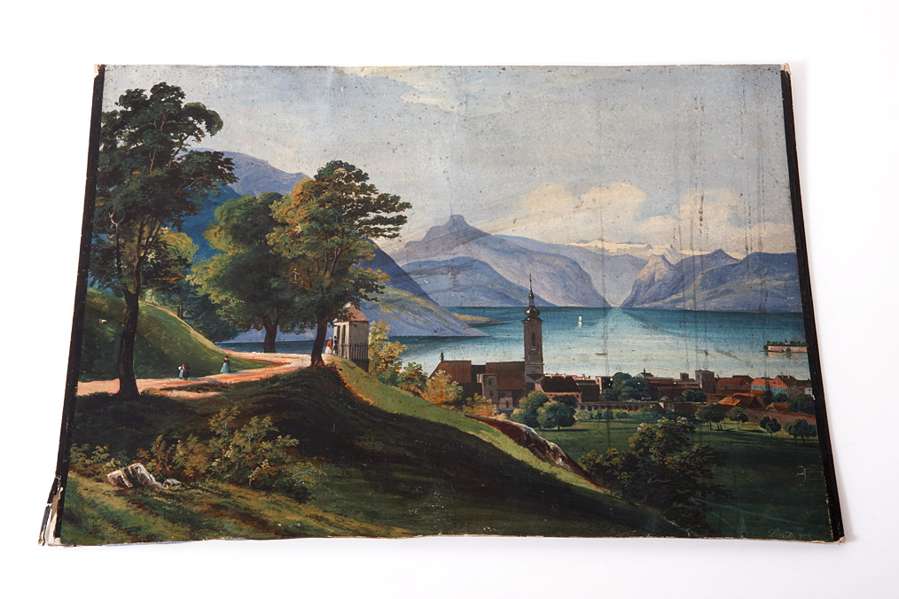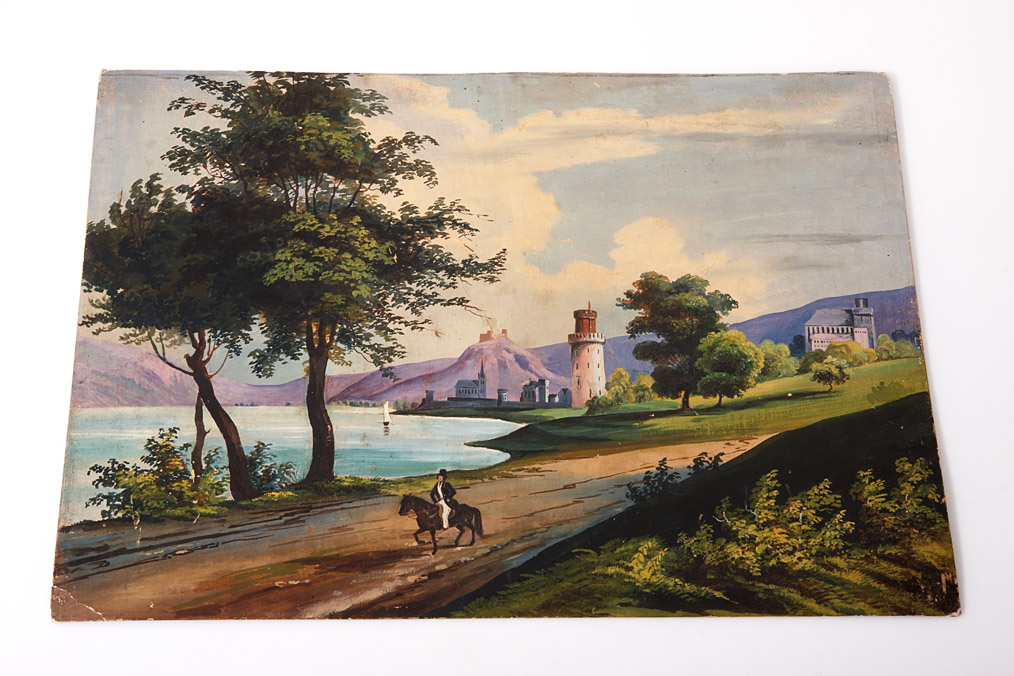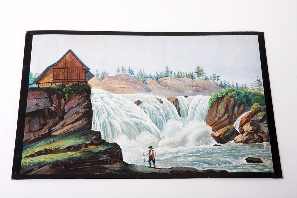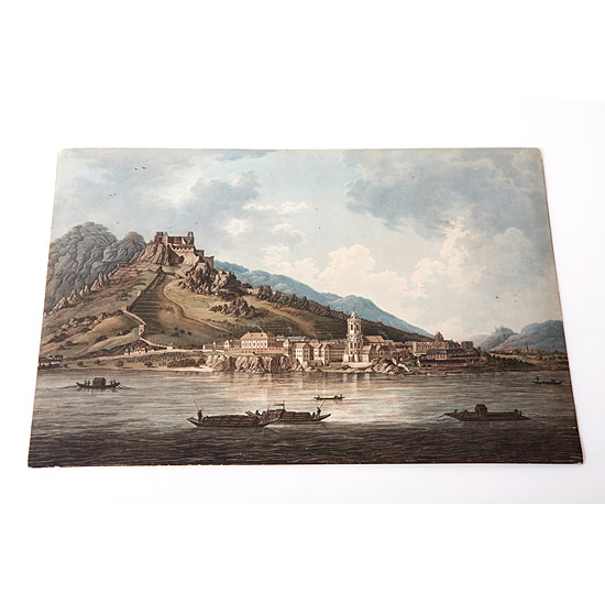 exceptional set of 4 perspective views or 'Vues Optiques’ intended to be used in a peep show, (1) ‘The ancient castle of Durnstein’ (Lower Austria), 60x43xm colour lithography mounted on cardboard printed by the well known Engraver Joseph Constantine Stadler, on the verso a dedication to ‘His Sacred Majesty King George III.’, dated November 21st 1844. Stadler was of German origin and settled in London in the 1780s and, since he specialized in aquatint engraving, became responsible for the successful production of many ambitious topographical works. The print is in perfect condition, (2) Gouache on card board 58x43cm depicting the Village Gmunden in Upper Austria, signed on the right lower corner, dated on the verso September 22nd 1845, the picture needs some cleaning, otherwise in good condition, (3) Gouache on card board 58x43cm entitled ‘Ober Vesel am Rhein’, bright colours and in good condition, (4) unlabeled Gouache on card board 58x39cm showing an Alpine scene with a waterfall, in perfect condition. (4)