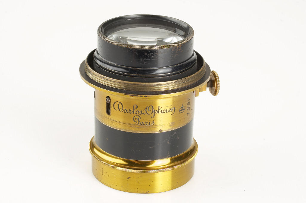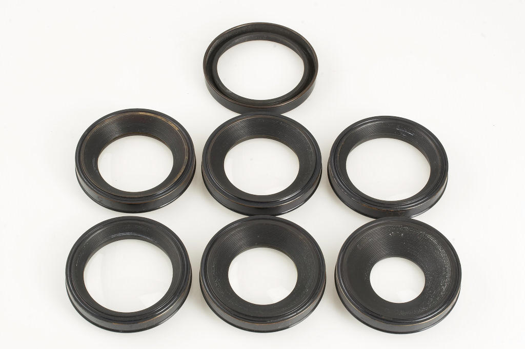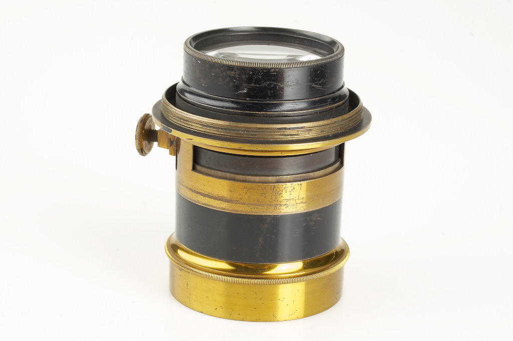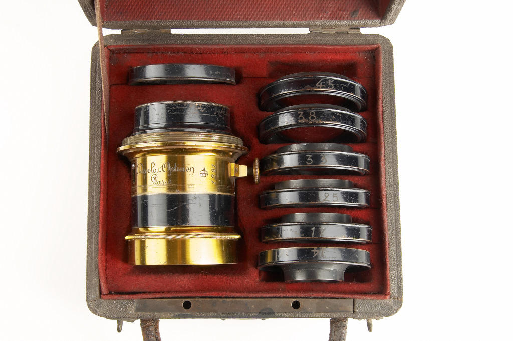 comprising a brass bound lens with front and rear elements that can be interchanged with six other lens elements engraved 14, 17, 25, 33, 38, and 45 to form lenses of various focal lengths. In original leather case. Ex Spira Collection.