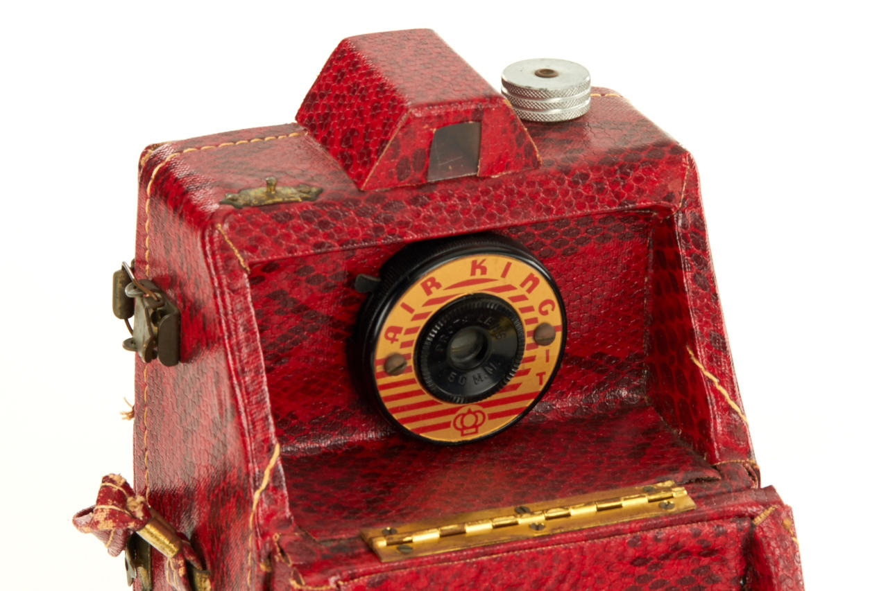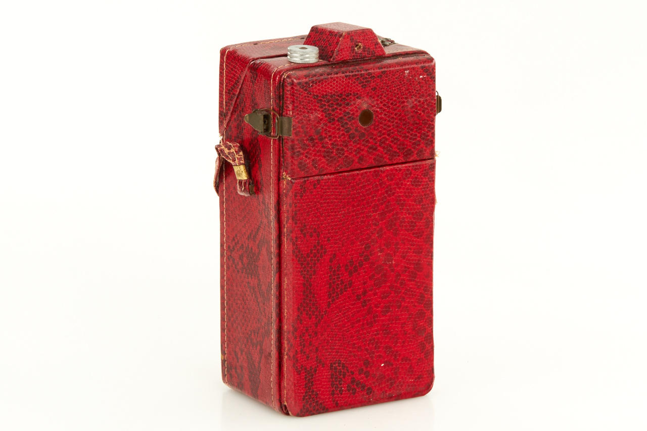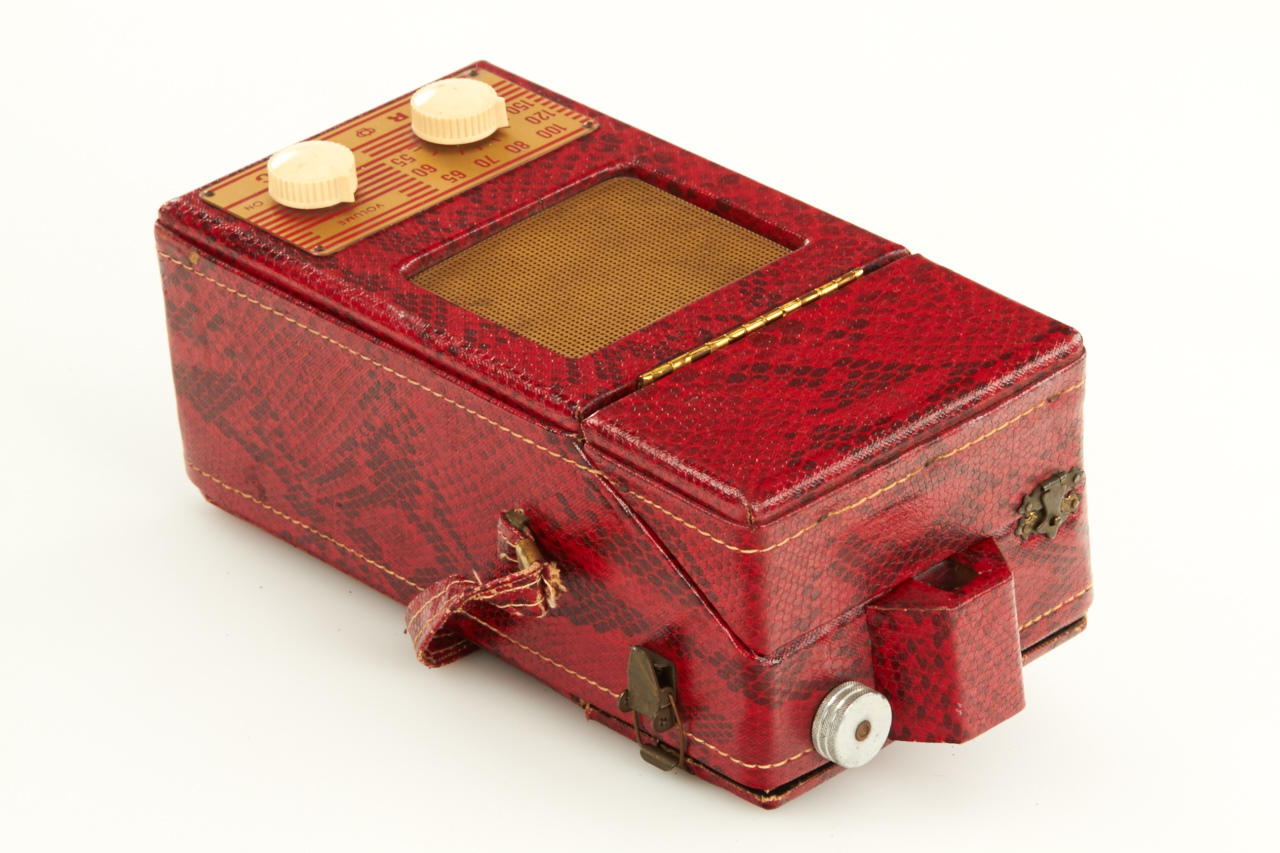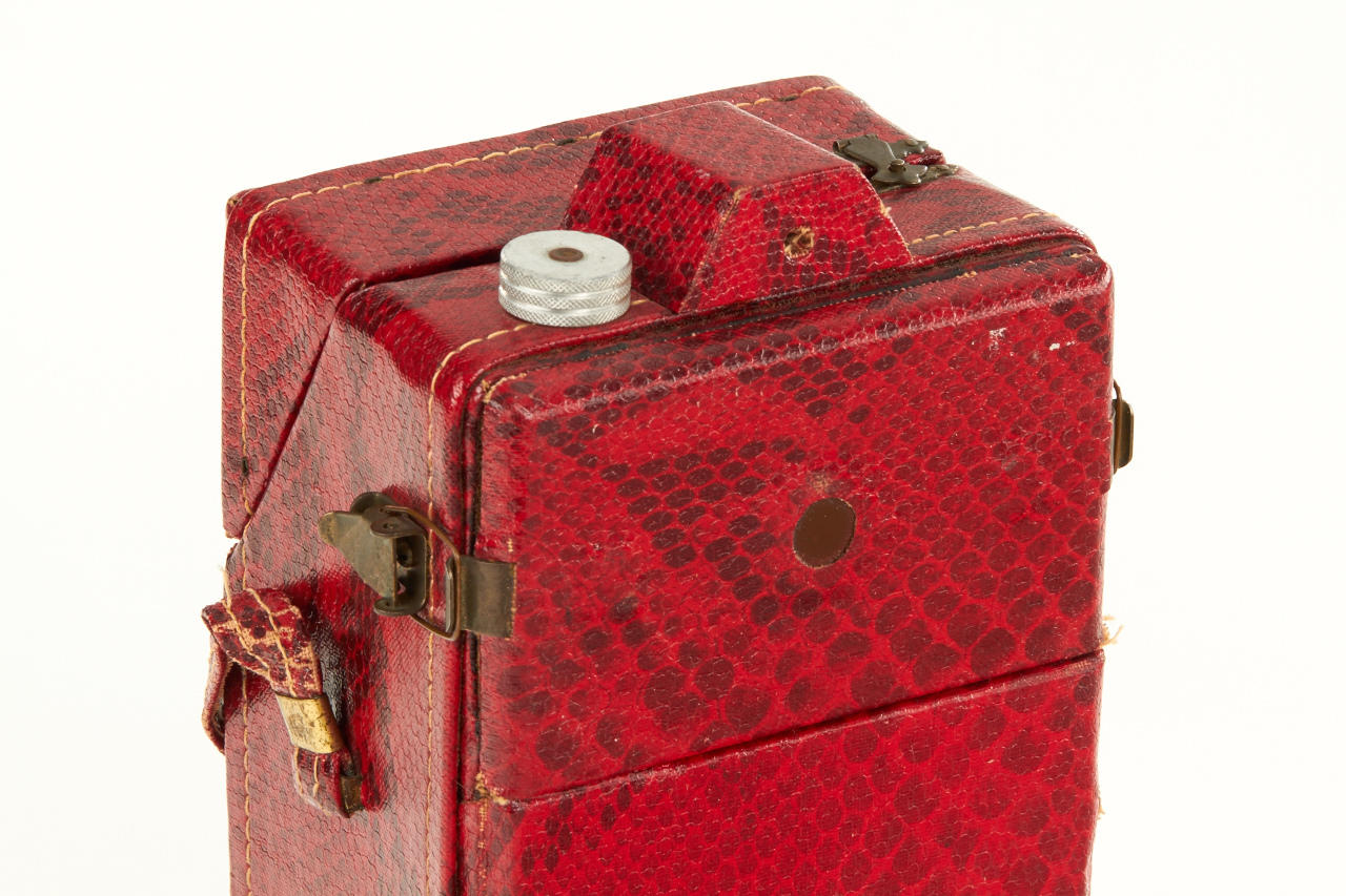 tube radio with concealed camera for 828 film covered in red imitation reptile skin