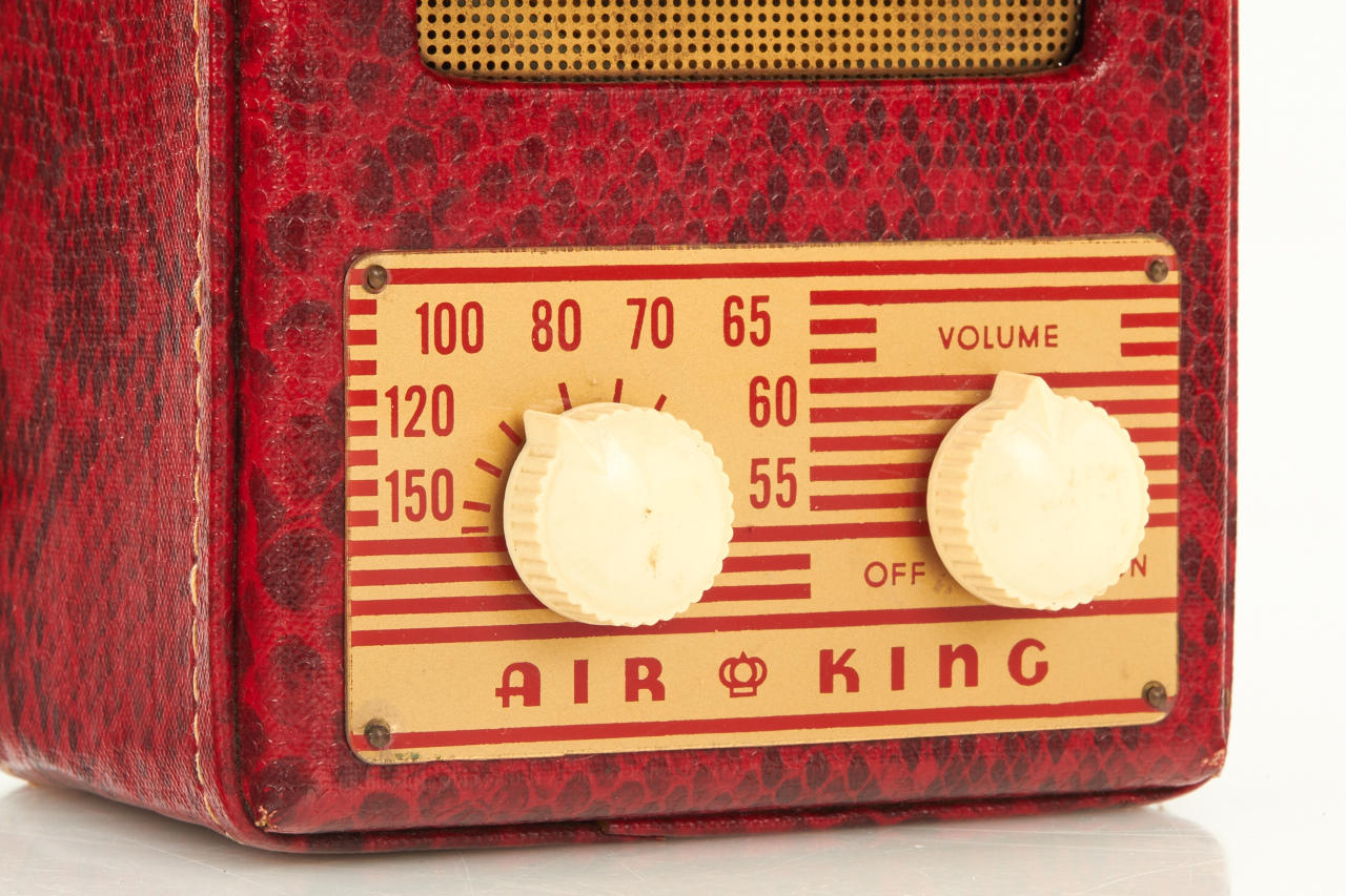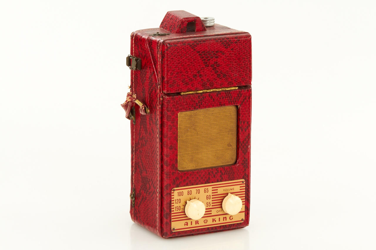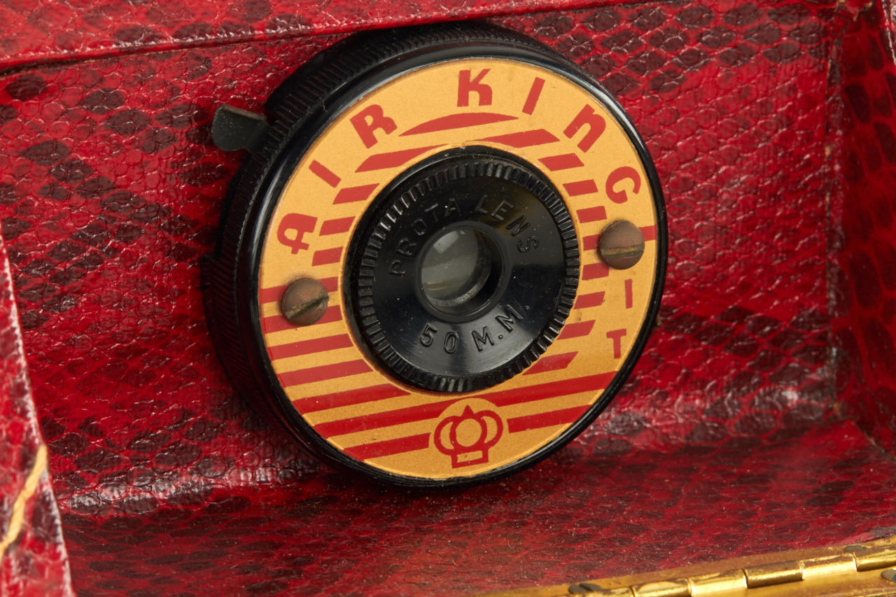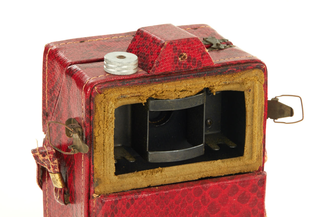 tube radio with concealed camera for 828 film covered in red imitation reptile skin