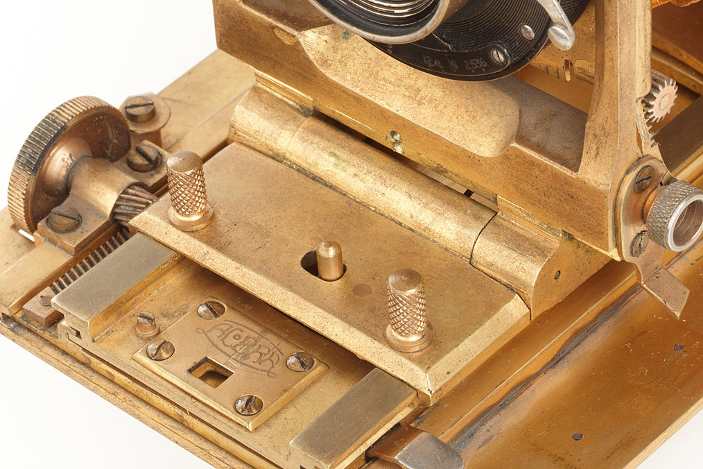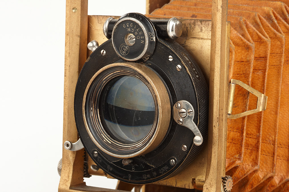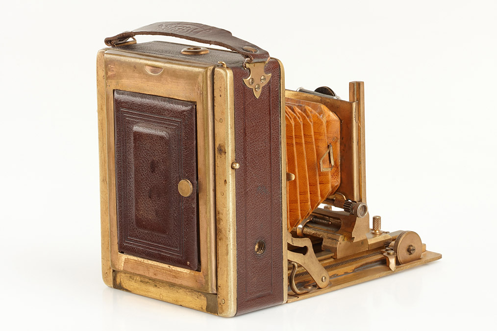 9x12cm Luxus camera, AL-BRA written on strap and on folding bed, very heavy brass camera, brown leather covering and brown bellows, un-named lens in shutter (not working) - almost unknown and very rare