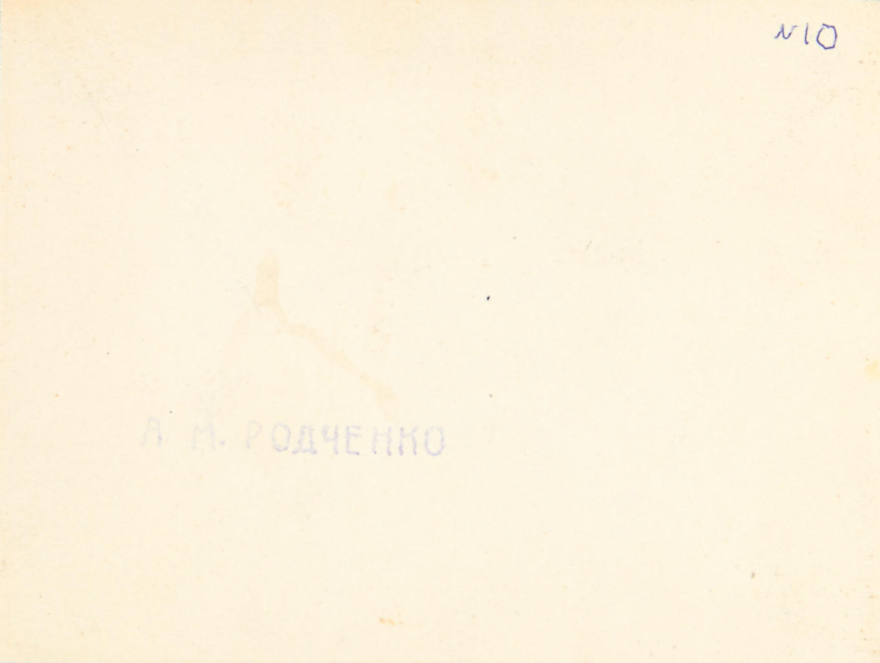 Vintage silver print 8,7 x 11,5 cm Photographer’s stamp on the reverse, the front showing Rodchenko’s crop marks PROVENANCE Acquired directly from the Estate of Alexander Rodchenko, Howard Schickler Fine Art, New York LITERATURE Alexander Lavrentiev, Rodchenko Photography 1924 – 1954, Cologne 1995, p. 87; Evelyn Weiss, Rodschenko. Fotografien 1920 – 1938, Cologne 1978, p. 127.