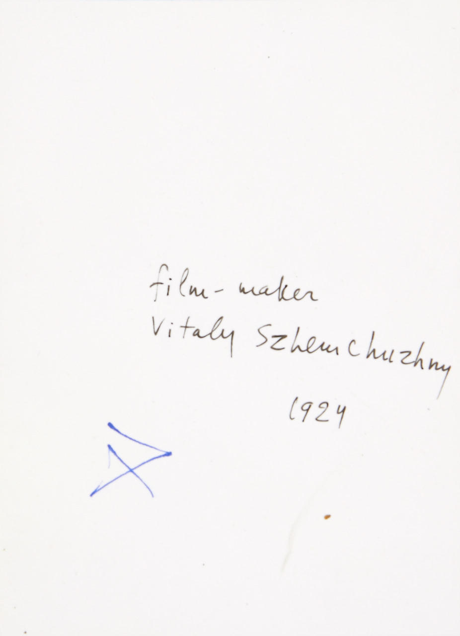 Gelatin silver print, printed in the 1970s 11,7 x 8,7 cm Annotated “Film-maker Vitaly Szhemchuhny. 1924” in an unidentified hand in ink on the reverse PROVENANCE Acquired directly from the Estate of Alexander Rodchenko, Howard Schickler Fine Art, New York LITERATURE Alexander Lavrentiev, Rodchenko Photography 1924–1954, Cologne 1995, p. 85.