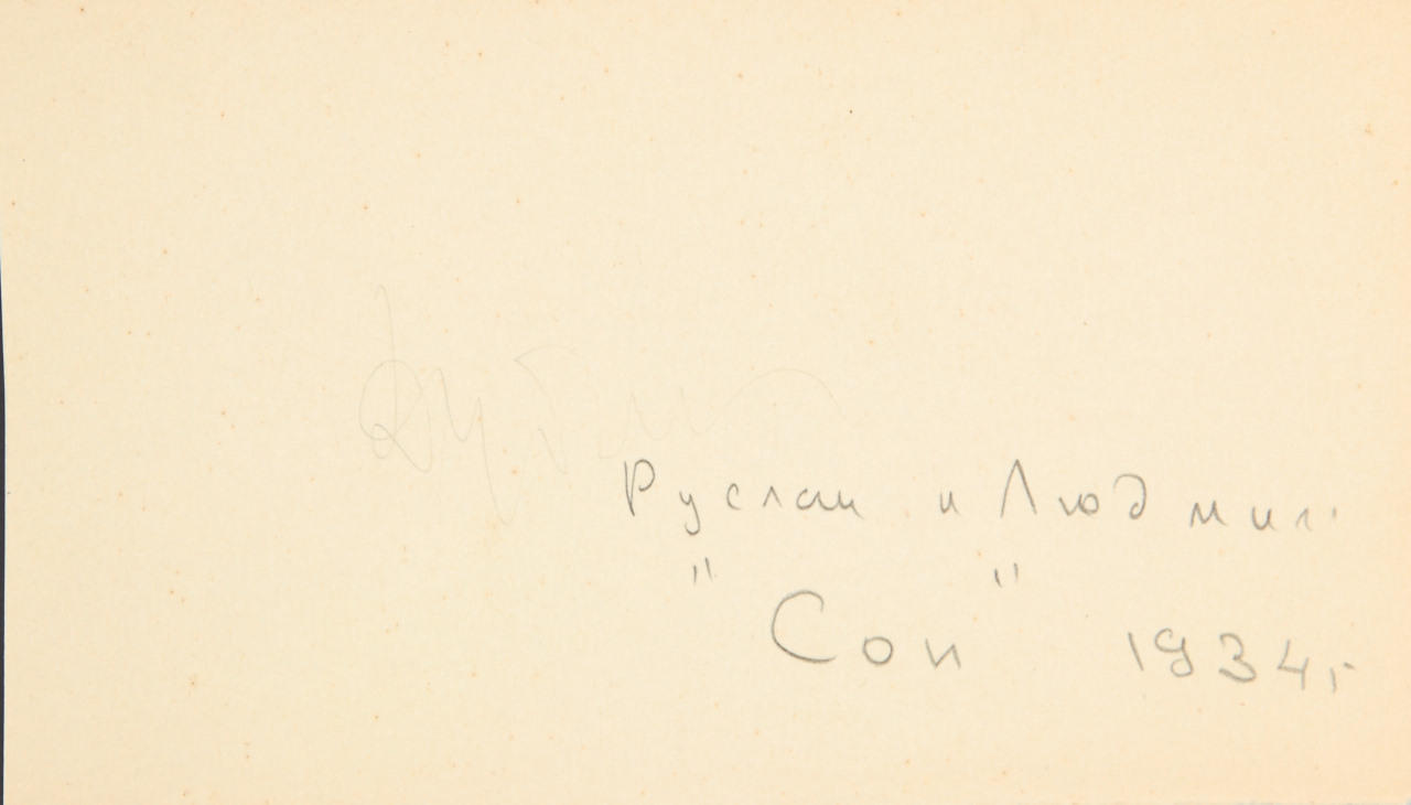 Vintage silver print 8,5 x 15,4 cm Annotated “Ruslan and Ludmila. “The Dream”. 1934” in an unidentified hand in pencil on the reverse PROVENANCE Acquired directly from the Estate of Alexander Rodchenko, Howard Schickler Fine Art, New York LITERATURE Susanne Winkler / Olga Sviblova, Sowjetische Fotografie der 1920er-/1930er Jahre. Von Piktorialismus und Modernismus zum Sozialistischen Realismus, Vienna 2002, p. 146 (the same series); Alexander Lavrentiev, Rodchenko Photography 1924–1954, Cologne 1995, p. 294 (the same series); Evelyn Weiss, Rodschenko. Fotografien 1920–1938, Cologne 1978, p. 159 (the same series); Alexander Lawrentiev / Olga Sviblova, Alexander Rodchenko. Revolution in Photography, Moscow 2008, p. 192 (the same series).