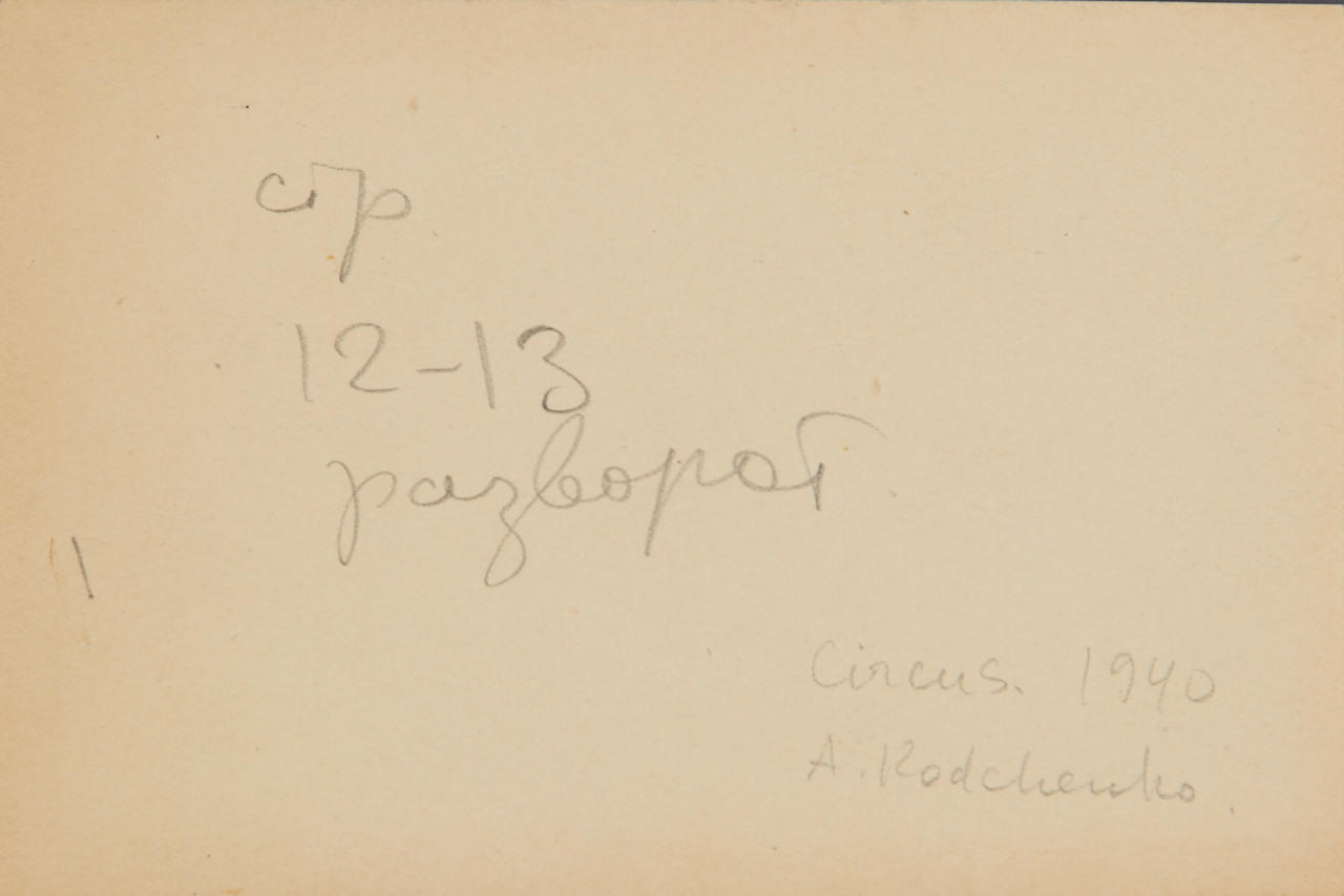 Vintage silver print 9,8 x 14,7 cm Annotated “Page 12-13, double page” in an unidentified hand in pencil on the reverse, annotated “Circus. 1940. A. Rodchenko” in an unidentified hand in pencil on the reverse PROVENANCE Acquired directly from the Estate of Alexander Rodchenko, Howard Schickler Fine Art, New York
