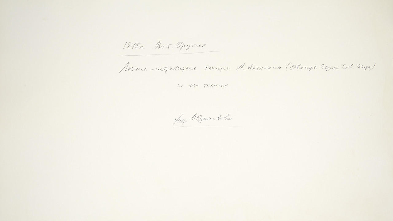 Vintage silver print 28,8 x 50,7 cm Annotated “1945. War friends. Pilot Capitan A. Aleyukhin (Hero of the Soviet Union) and his technician. Photo by A. Stanovov” in an unidentified hand in ink on the reverse PROVENANCE Howard Schickler Fine Art, New York