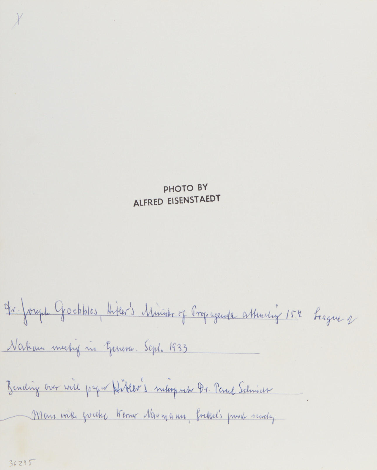 Gelatin silver print, printed in the 1970s 24 x 16,5 cm Signed by the photographer in ink in the margin, extensively titled by Eisenstaedt in ink on the reverse: “Dr. Joseph Goebbels, Hitler's Minister of Propaganda attending 15th League of Nation meeting in Geneva, Sept. 1933. Bending over with paper Hitler's interpreter Dr. Paul Schmidt, man behind Werner Naumann, Goebbel's private secretary”, his “PHOTO BY ALFRED EISENSTAEDT” stamp on the reverse PROVENANCE Eisenstaedt Family Estate LITERATURE Alfred Eisenstaedt, Witness to our Time, New York 1966, p. 63; Monika Faber / Janos Frecot (ed.), Portrait im Aufbruch, Vienna 2005, p. 21.