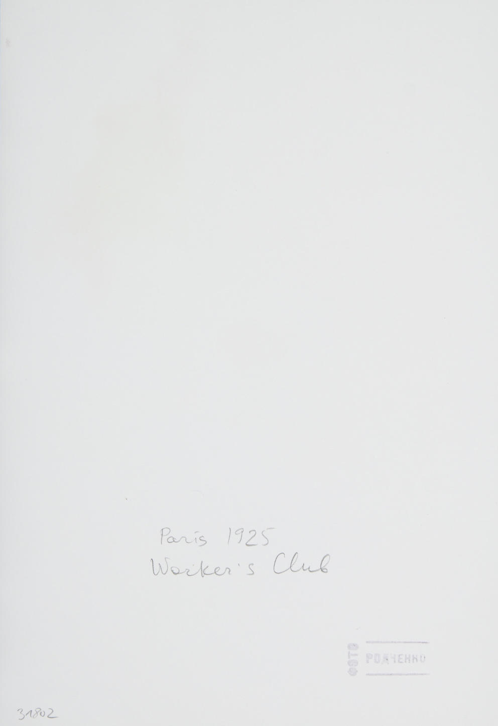 Gelatin silver print, printed in the 1970s 25,4 x 17,4 cm Annotated “Paris 1925. Worker’s Club” in an unidentified hand in pencil on the reverse, photographer’s stamp on the reverse [Rodchenko’s] PROVENANCE Howard Schickler Fine Art, New York LITERATURE Rodtschenko, Stepanova, Die Zukunft ist unser einziges Ziel…, Vienna 1991, p. 182.