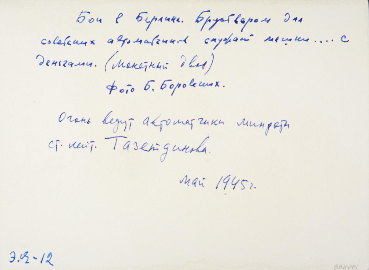 Vintage silver print 17,5 x 12,9 cm Annotated “Fight in Berlin. Bags of money serve as a breastwork for soviet gunners. (Mint)” (Cyrillic) in an unidentified hand in ink on the reverse, annotated “The gunners of Lieutenant Tazetdinov fire. May 1945” (Cyrillic) in another unidentified hand in ink on the reverse PROVENANCE Howard Schickler Fine Art, New York Scharfschützen von Leutnant Tazetdinov verwenden Münz-Säcke als Brüstung / The gunners of Lieutenant Tazetdinov use bags of money as a breastwork