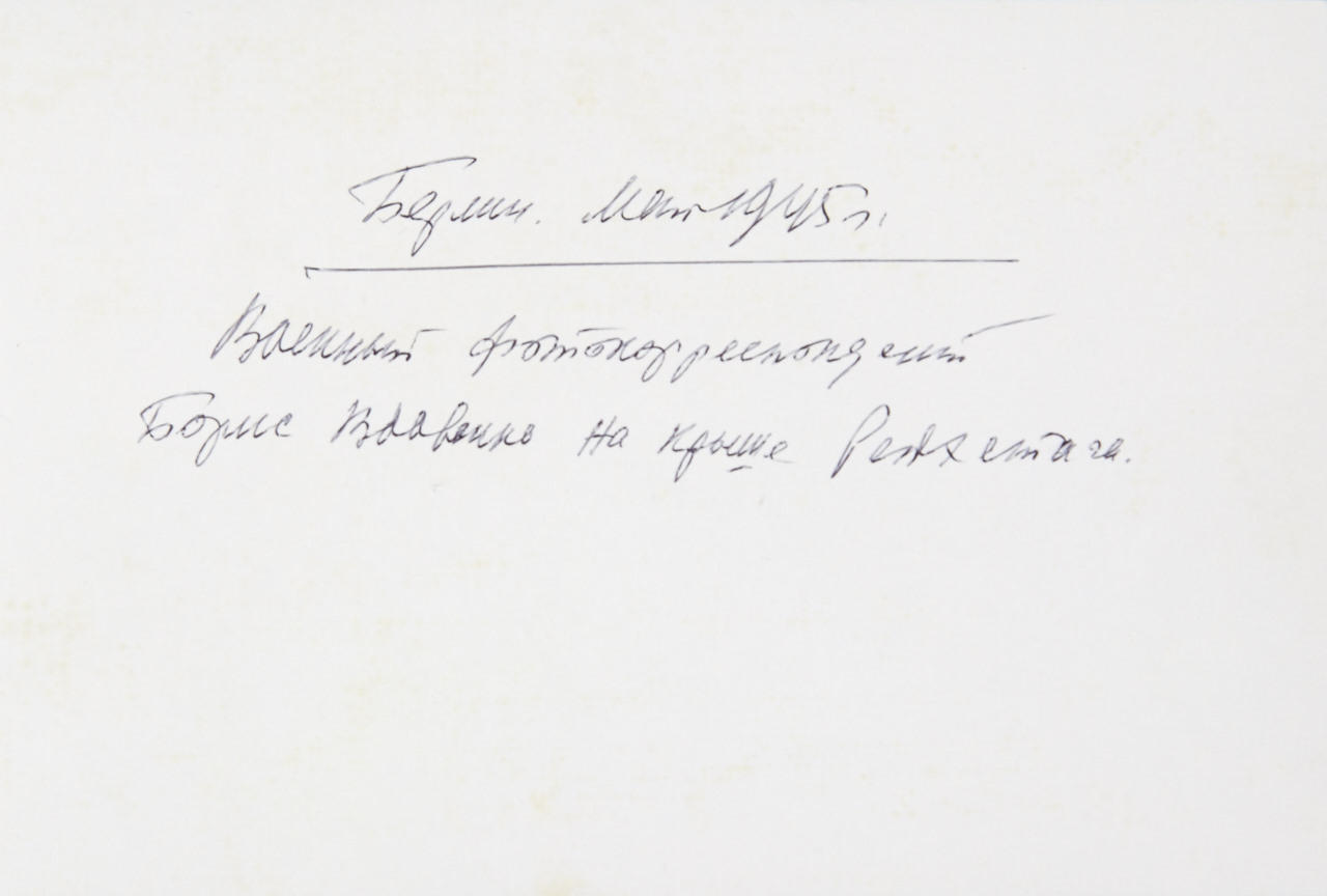 Vintage silver print 11 x 16,3 cm Annotated “Berlin. May 1945. War photographer Boris Vdovienko on the roof of the Reichstag” (Cyrillic) in an unidentified hand in ink on the reverse PROVENANCE Howard Schickler Fine Art, New York