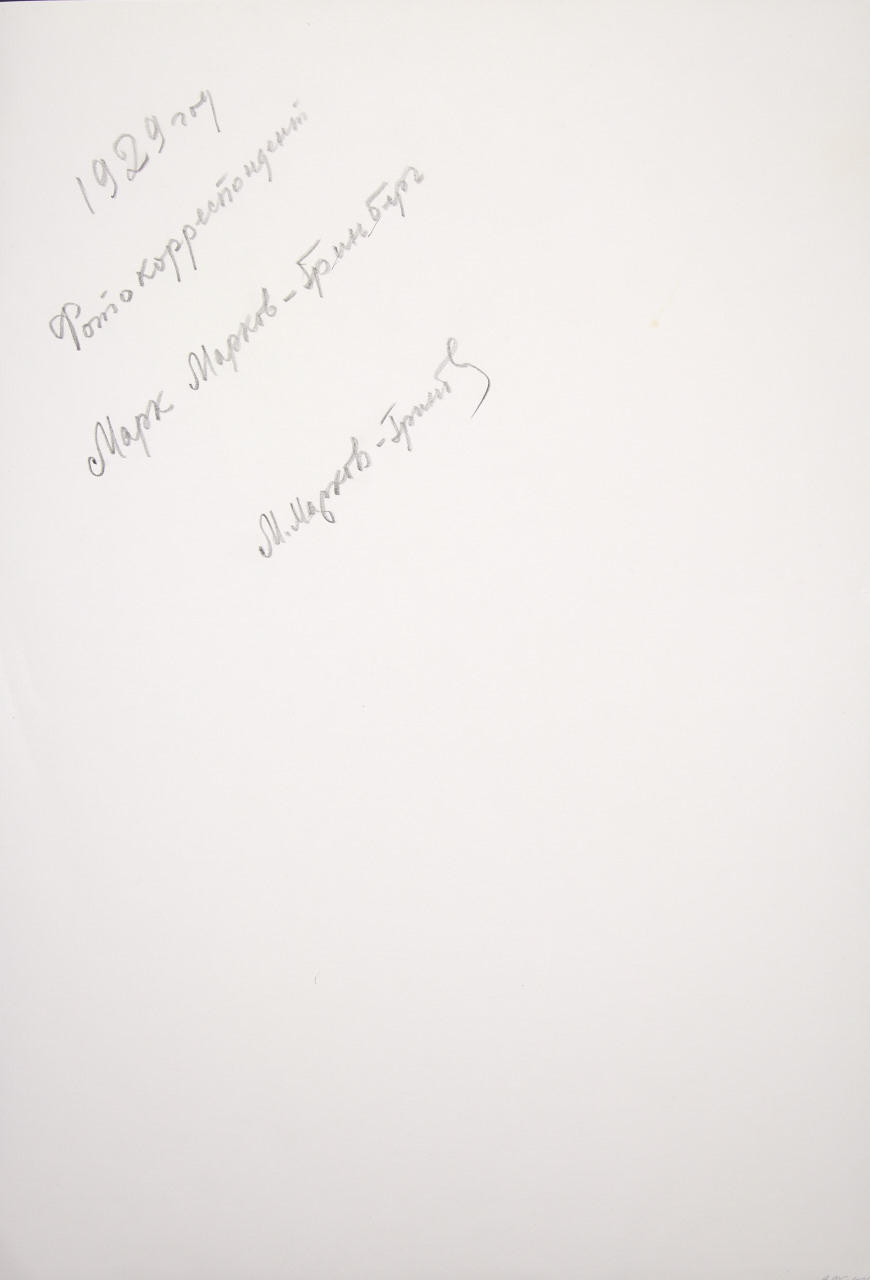 Gelatin silver print, printed in the 1970s 40,6 x 28,1 cm Signed and annotated “1929. Photojournalist, Mark Markov-Grinberg” by Markov-Grinberg in pencil on the reverse PROVENANCE Howard Schickler Fine Art, New York