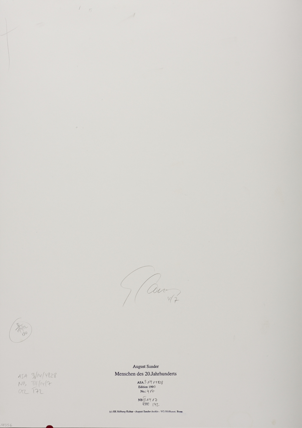Gelatin silver print, printed 1990 by Gerd Sander 57 x 40,5 cm (22.4 x 15.9 in) With the blindstamp “Aug. Sander Köln Lindenthal” lower left, signed and dated by Gerd Sander in pencil on the reverse, stamped “August Sander Menschen des 20. Jahrhunderts [..]” with handwritten captions on the reverse, edition no. 4/7. LITERATURE Gunther Sander (ed.), August Sander, Menschen des 20. Jahrhunderts, Munich 1980, p. 172.