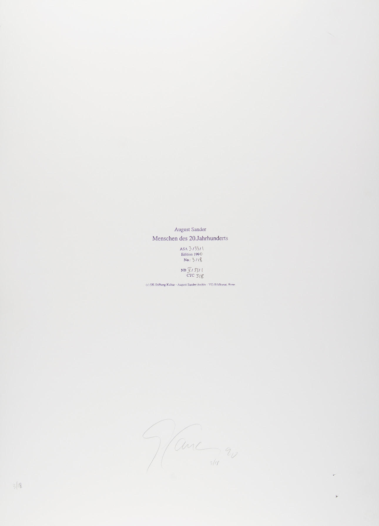 Gelatin silver print, printed in 1990 by Gerd Sander, large format print 58,8 x 43,9 cm (32.1 x 17.3 in) With the “Aug. Sander Köln Lindenthal” blindstamp lower left, signed, dated and numbered by Gerd Sander in pencil on the reverse, edition no. 3/18 PROVENANCE Private Collection, acquired directly from the August Sander Estate LITERATURE Die Photographische Sammlung/SK Stiftung Kultur Köln (ed.), August Sander. Menschen des 20. Jahrhunderts, Munich 2002, p. 571. (Gruppe V/33 “Die Künstler - Maler und Bildhauer”)