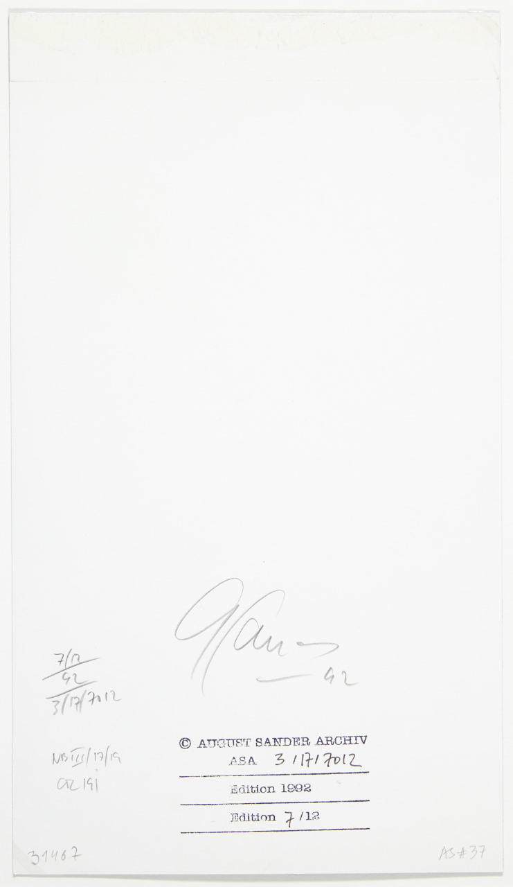 Gelatin silver print, printed in 1992 by Gerd Sander 26 x 14,7 cm With the “Aug. Sander Köln Lindenthal” blindstamp lower left, signed by Gerd Sander in pencil on the reverse, archive stamp with handwritten ed. no. and date on the reverse, edition no. 7/12 LITERATURE August Sander, Menschen des 20. Jahrhunderts, Munich 2010, p. 333.