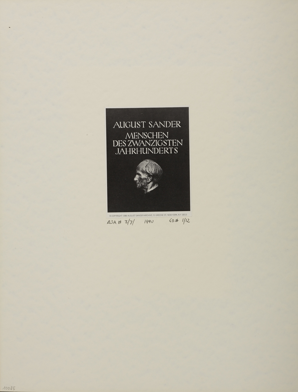Gelatin silver print, printed 1990 25,8 x 18,9 cm (10.2 x 7.4 in) With the blindstamp “Aug. Sander Köln Lindenthal” lower left, signed and dated by Gerd Sander with pencil on the reverse, stamped “© August Sander Archive ASA #3/7/ [handwritten] 1990 Ed. # 1[handwritten]/12”, edition no. 1/12 LITERATURE Susanne Lange, Gabriele Conrath-Scholl, Gerd Sander (ed.), August Sander. Menschen des 20. Jahrhunderts. Band I Der Bauer. Munich 2002, p. 269.