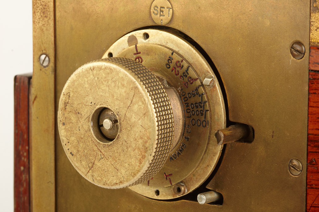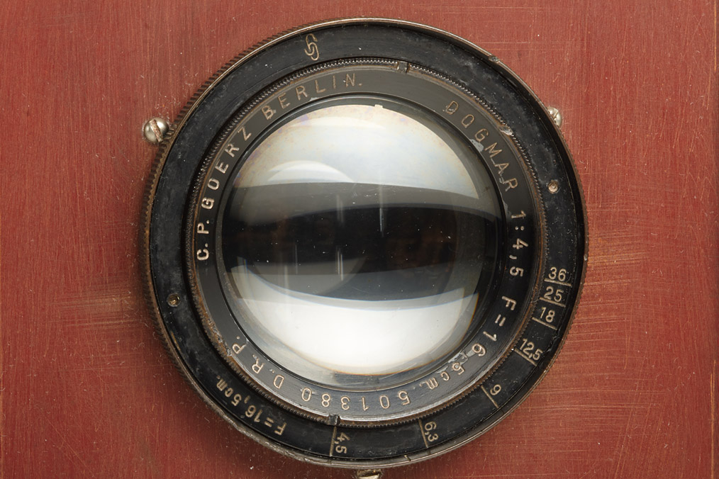 9x12cm, rare tropical version, teakwood body with brass fittings, brown leather bellows, finder hood marked 'DE LUXE MODEL', with Dogmar 4.5/16.5cm no.501380, focal plane shutter (needs service), film holder