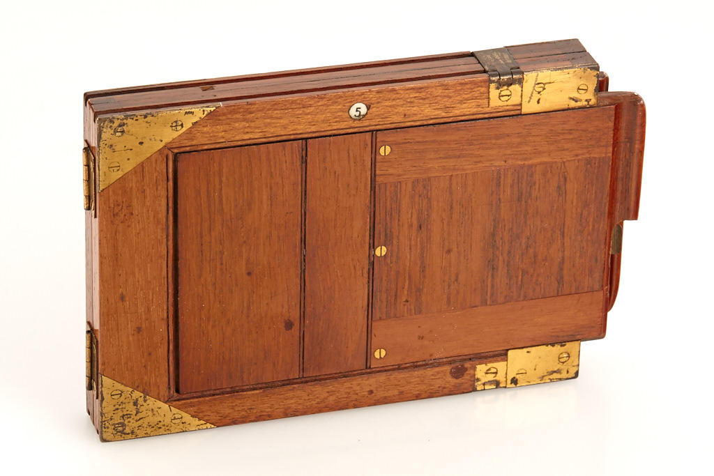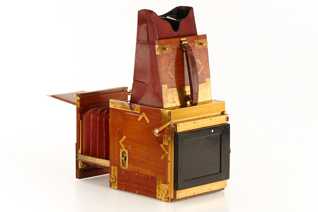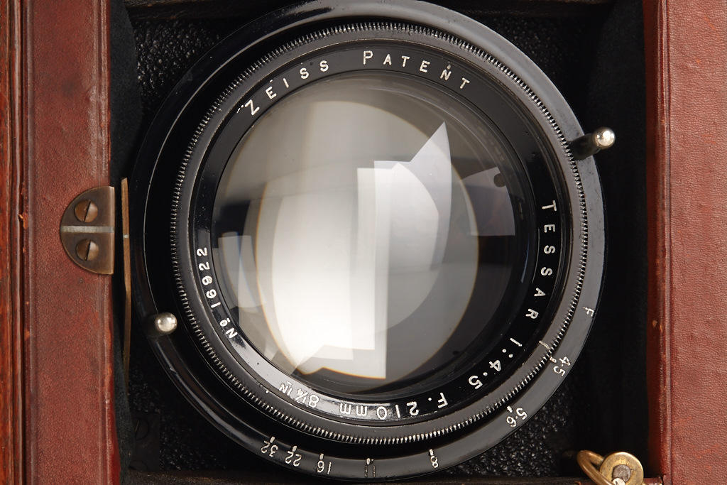 4x5", rare tropical version, teakwood body with brass fittings, brown leather bellows, finder hood marked 'DE LUXE MODEL', with Tessar 4.5/210mm no.16922, focal plane shutter (needs service), black double film holder