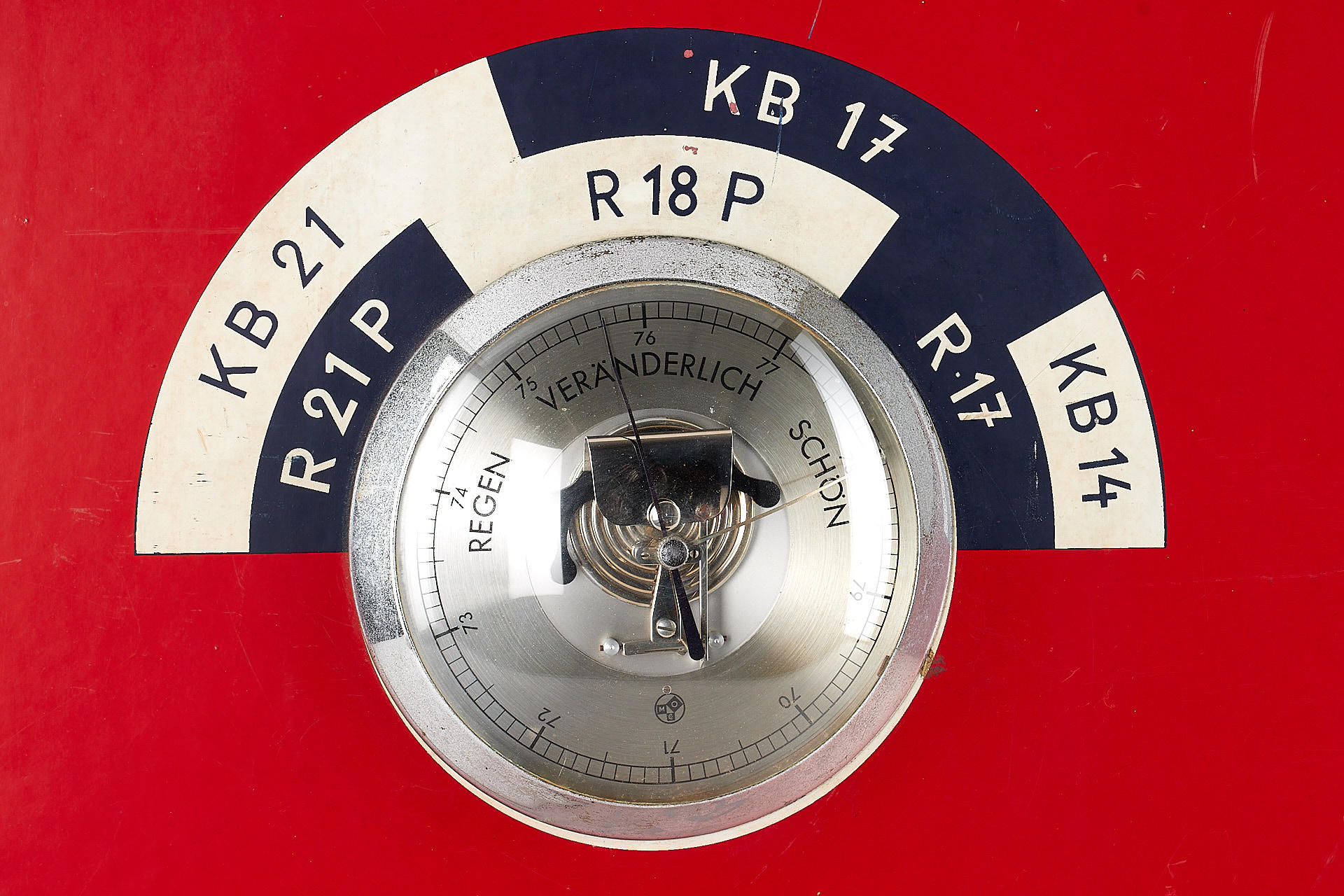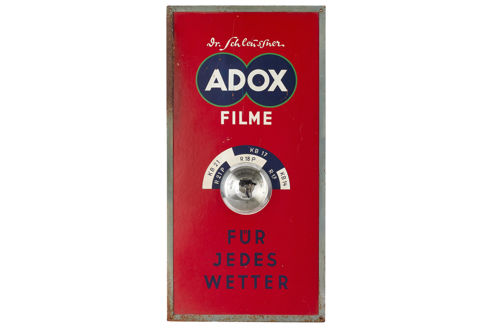 rare German advertising sign with working barometer, for Dr. Schleüssner Adox films, painted plywood mounted in 50 x 100cm metal frame, in very good condition, with inscription 'für jedes Wetter' (for any weather)
