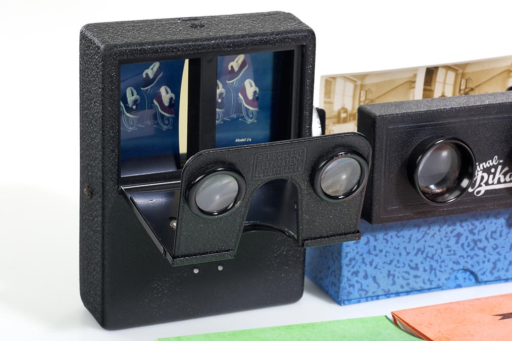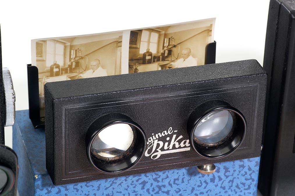 exceptional selection of three German advertising viewers, (1) ‘Pendoplast’ Stuttgart , black painted metal body, adjustable focus, for stereoscopic transparencies on uncut roll film, with a very nice reel of promotion images for the German EKAHA Schnellhefter company from around 1930, (2) a later model of the ‘Pendoplast’ viewer labelled Beez-Patent from around 1950, black 'hammered' finish, ingenious transport mechanism, with a advertisement series on colour transparencies showing shoes, (3) simple collapsible viewer branded for the BIKA pharmaceutical company in Stuttgart, the left lens is cracked, otherwise in nice condition, comes together with three series of promotional images showing the production, herbal plants and models of the human body, every series with envelop and description in German. (3)