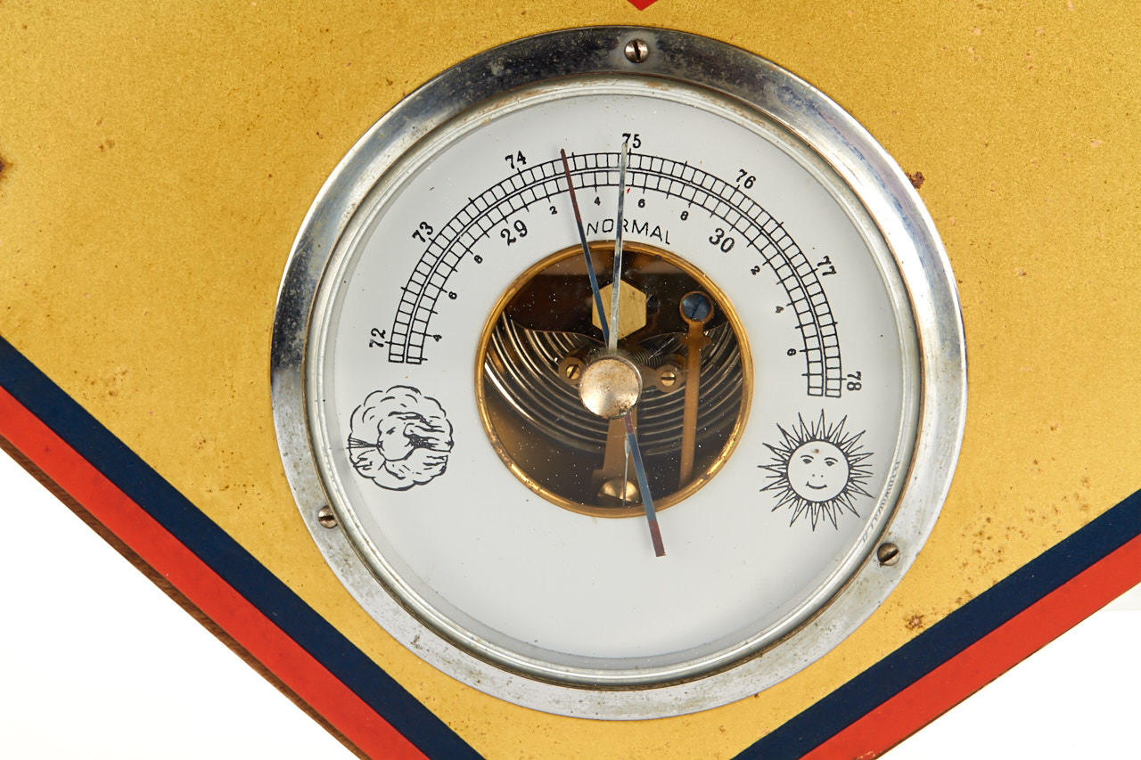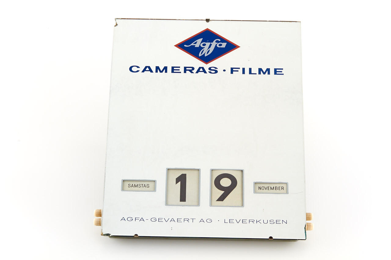 very well preserved Agfa flag 47x68cm, with rhomboidal wooden Barometer c.22x29cm (cond. B, working), 25x109cm Agfacolor glass sign (cond. B/C), and attractive 24x34cm mirror with built-in perpetual calendar
