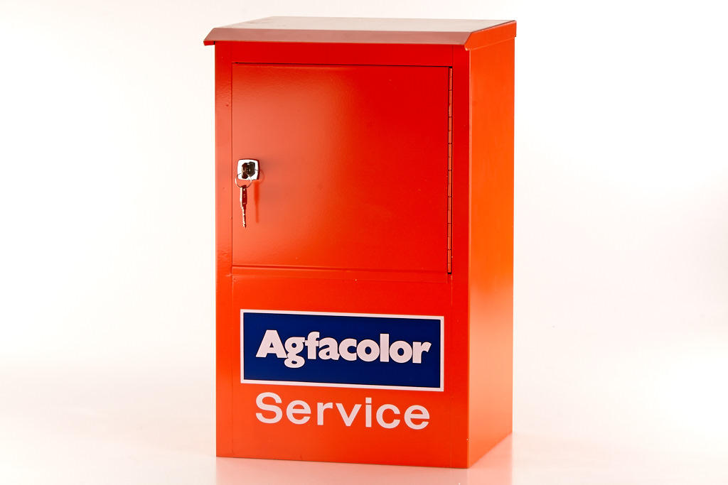 (1) Service box in almost mint condition, with locking key, 25 x 30 x 50cm, (2) Agfa pennant 85x65cm (2)