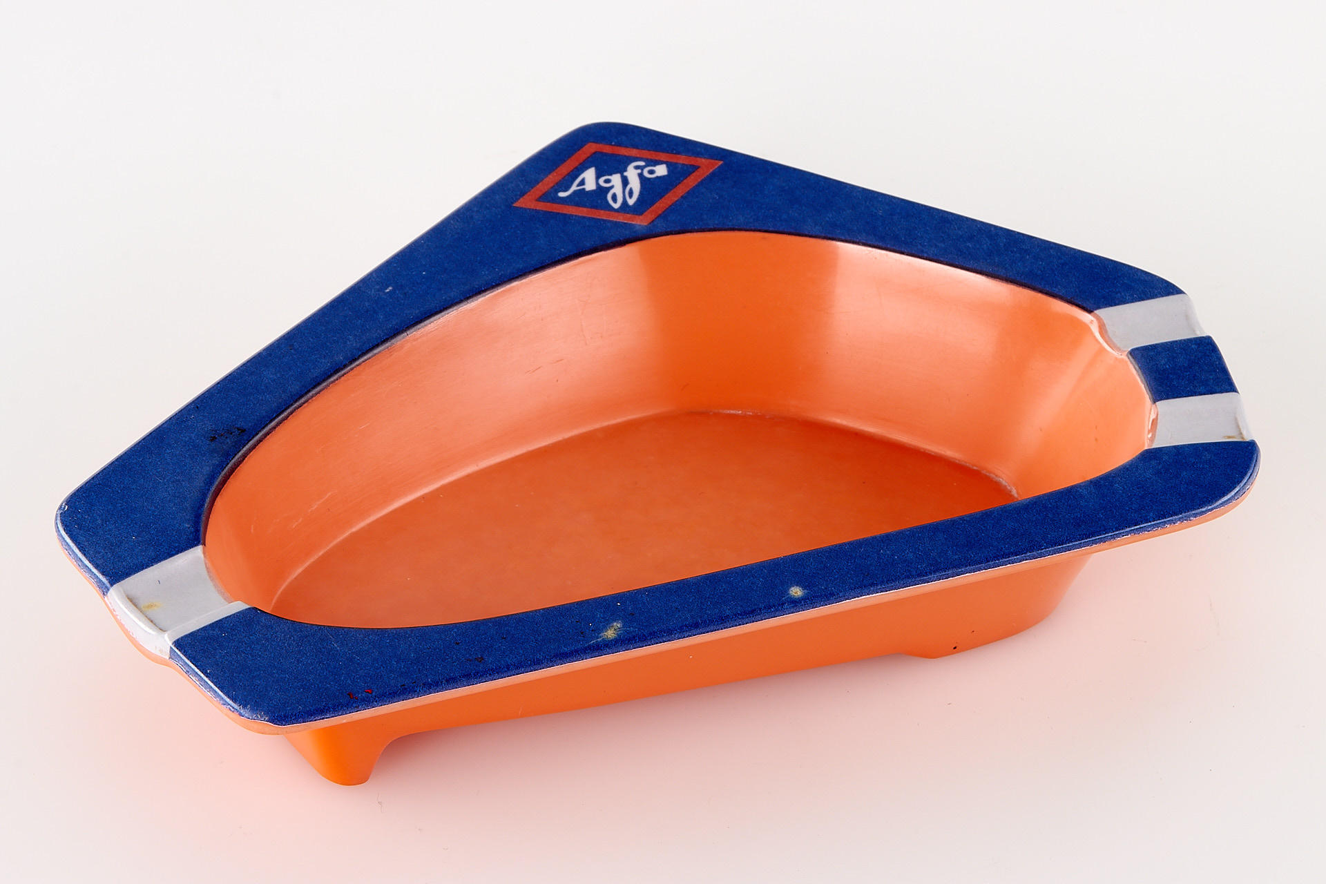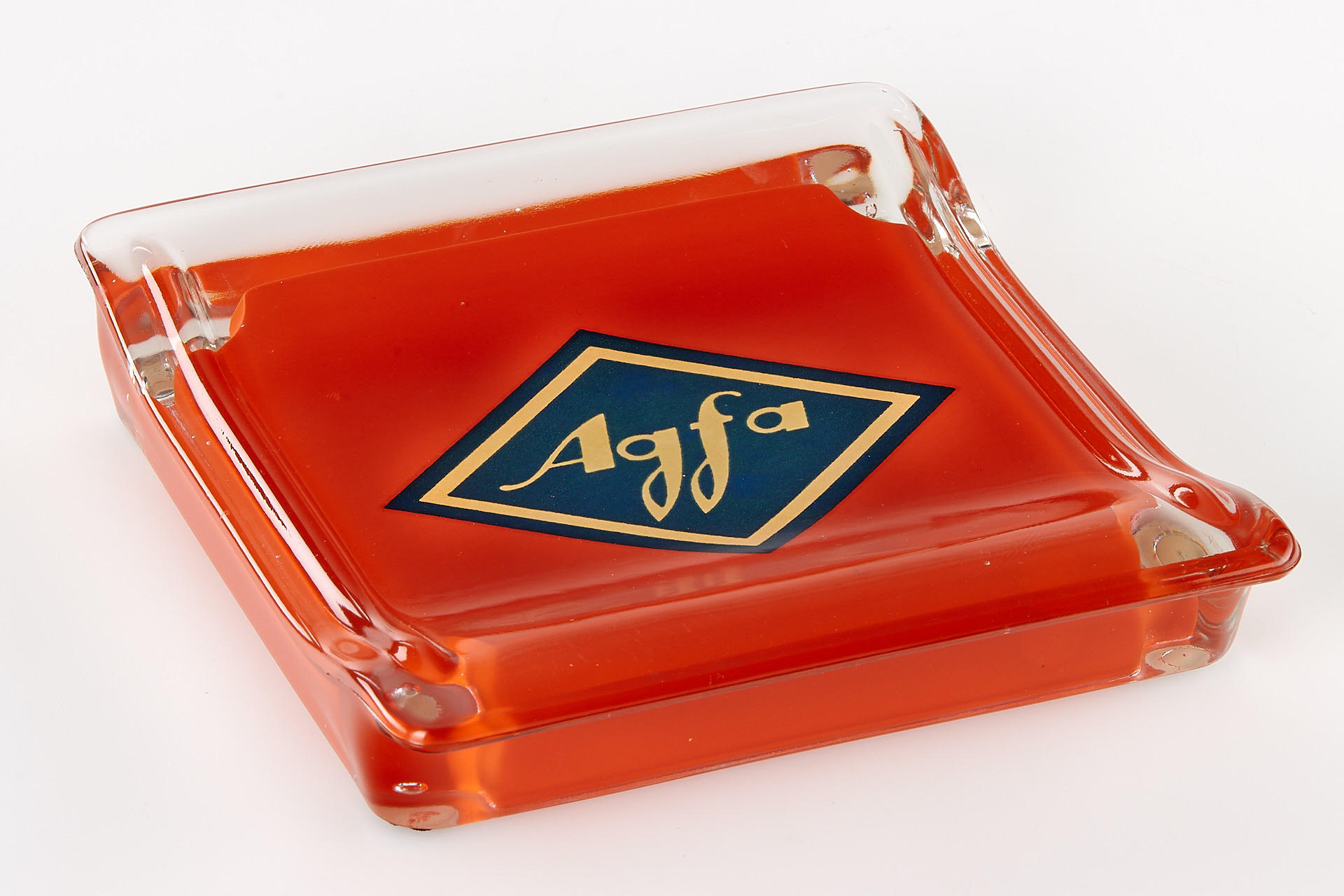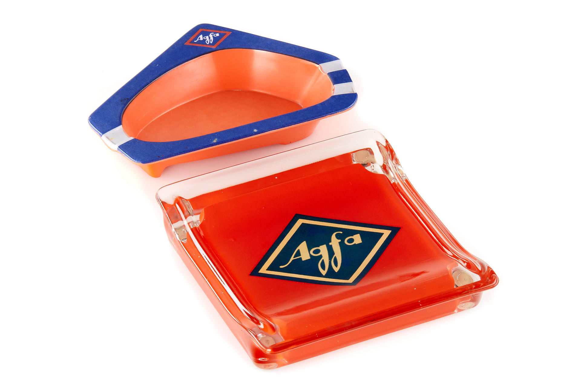 Very nice Agfa advertising resin ashtray (20 x 14 x 4cm) and painted glass change counter tray (19 x 18cm)