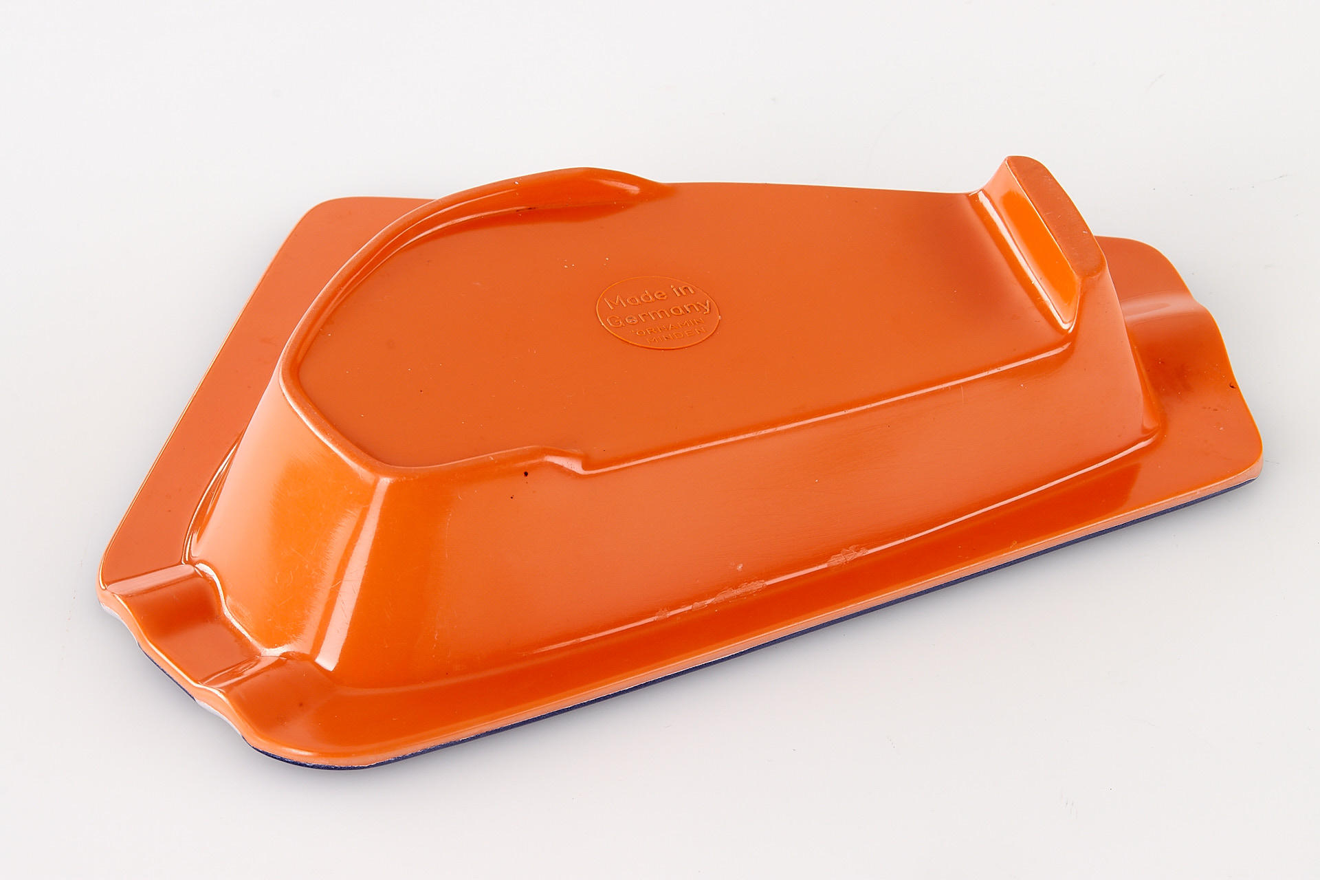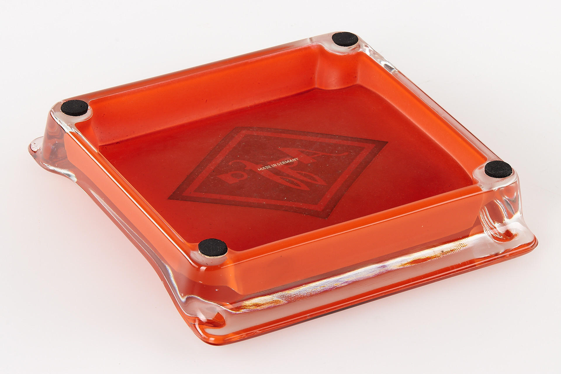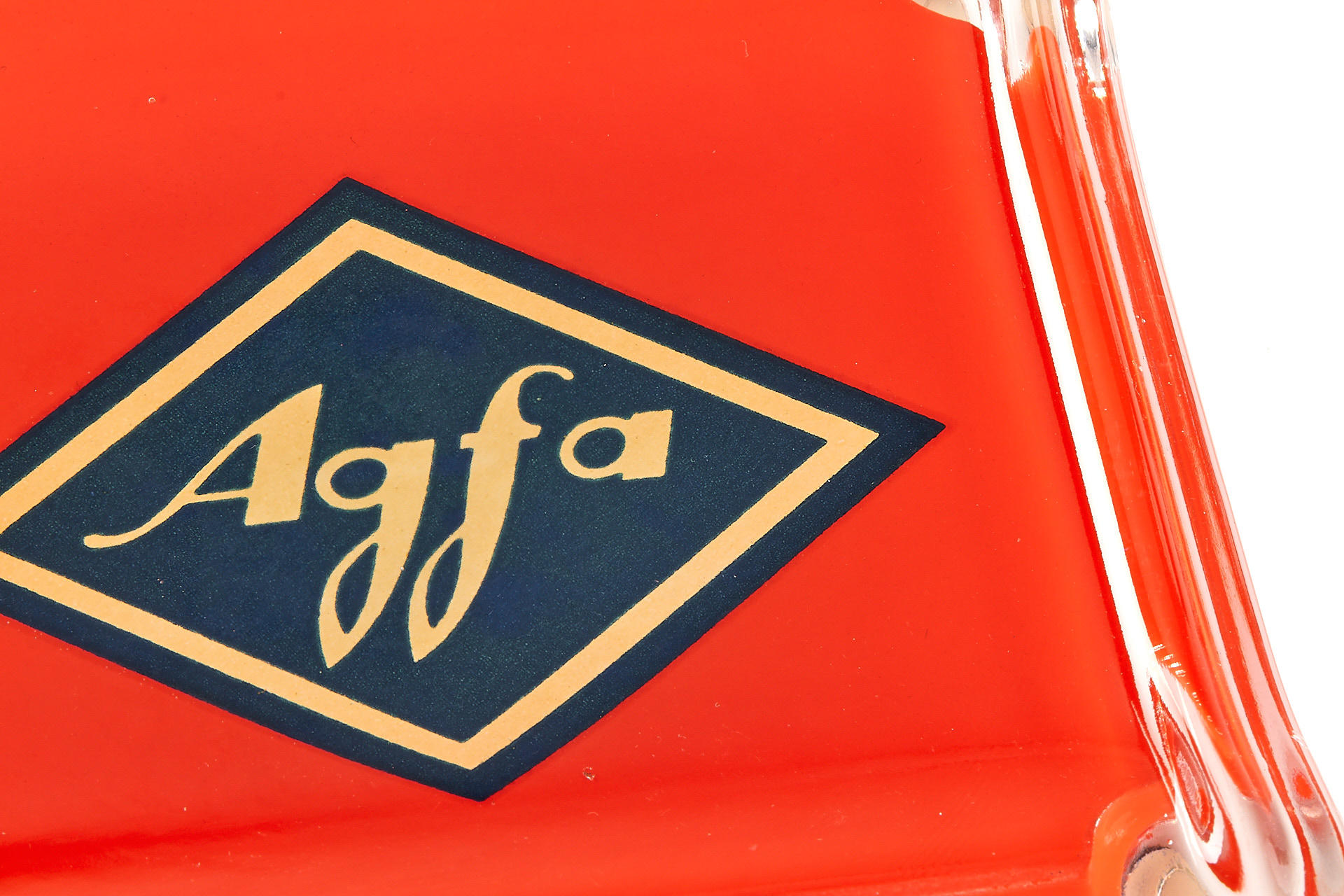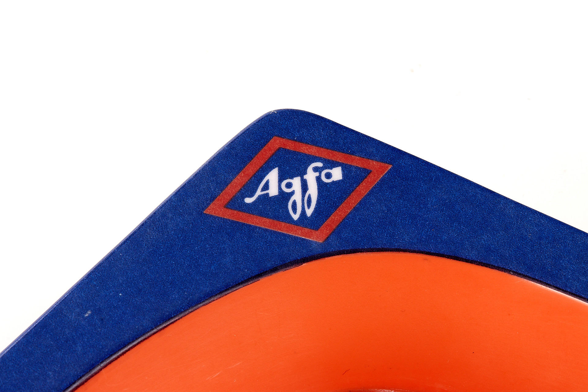 Very nice Agfa advertising resin ashtray (20 x 14 x 4cm) and painted glass change counter tray (19 x 18cm)