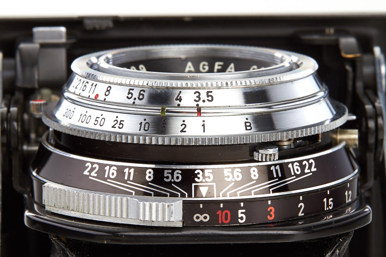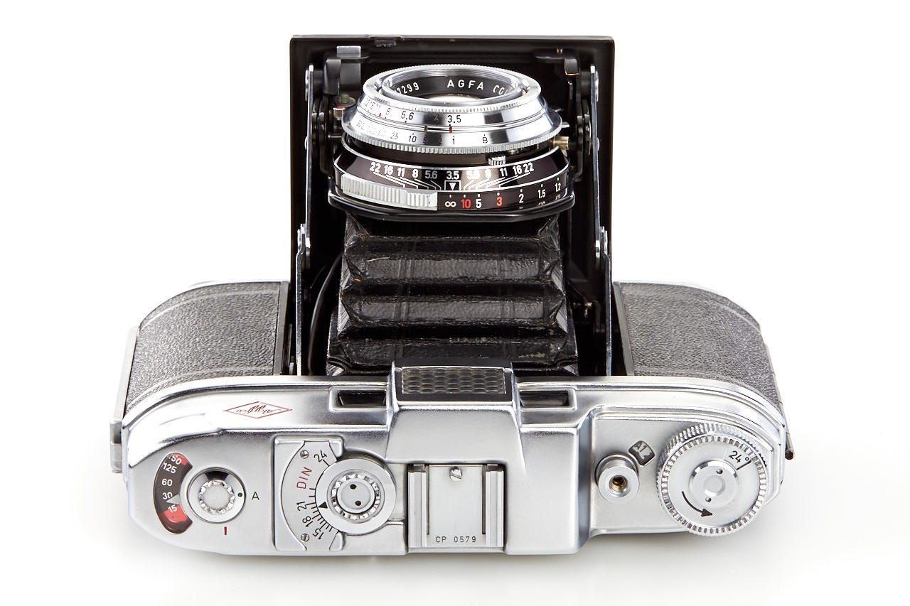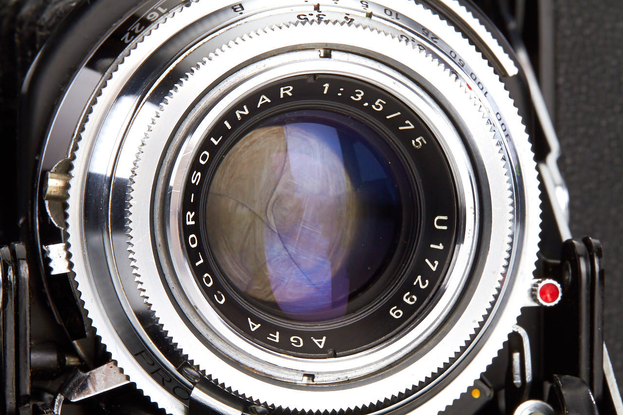 very rare folding rangefinder camera for 6x6cm exposures on 120 film, with Color-Solinar 3.5/75mm no.U17299, in beautiful almost mint condition