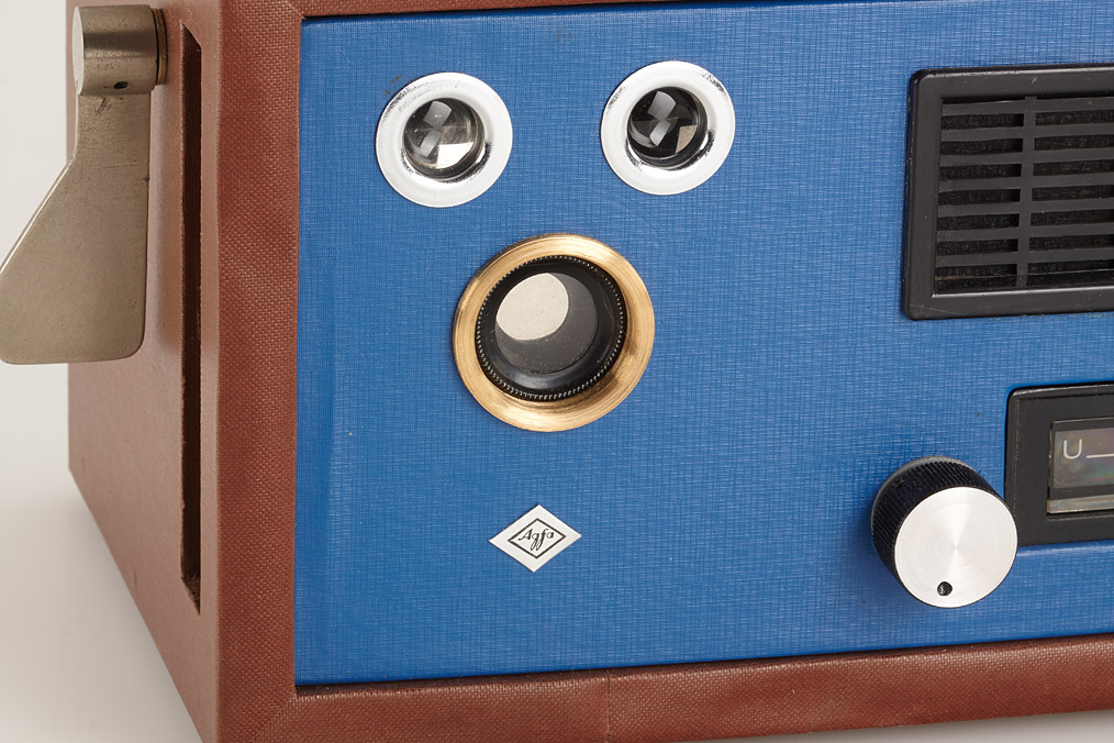 very well custom made conversion of an Agfa Box camera built into a transistor radio, blue front panel, brown covering with chrome handle, fully working with antenna and AC adapter
