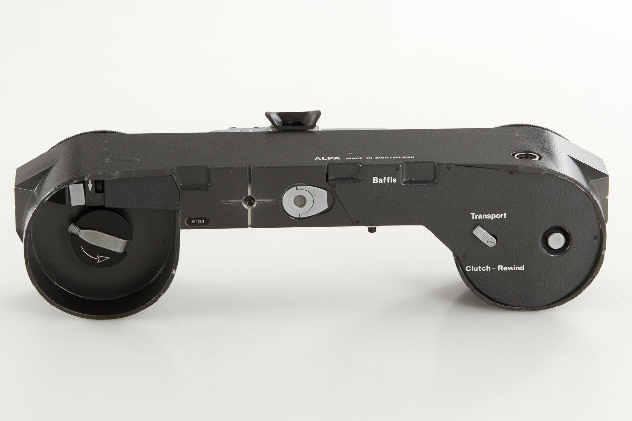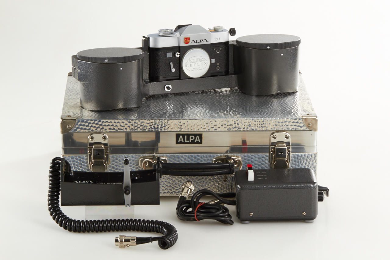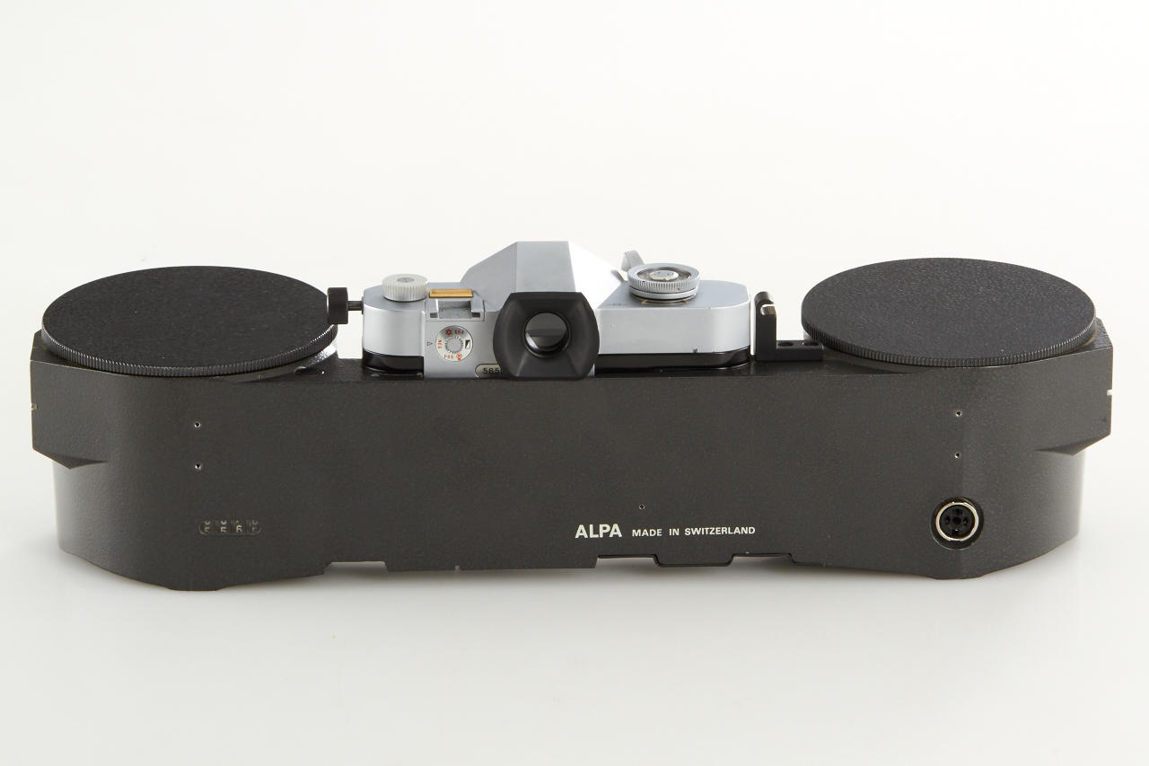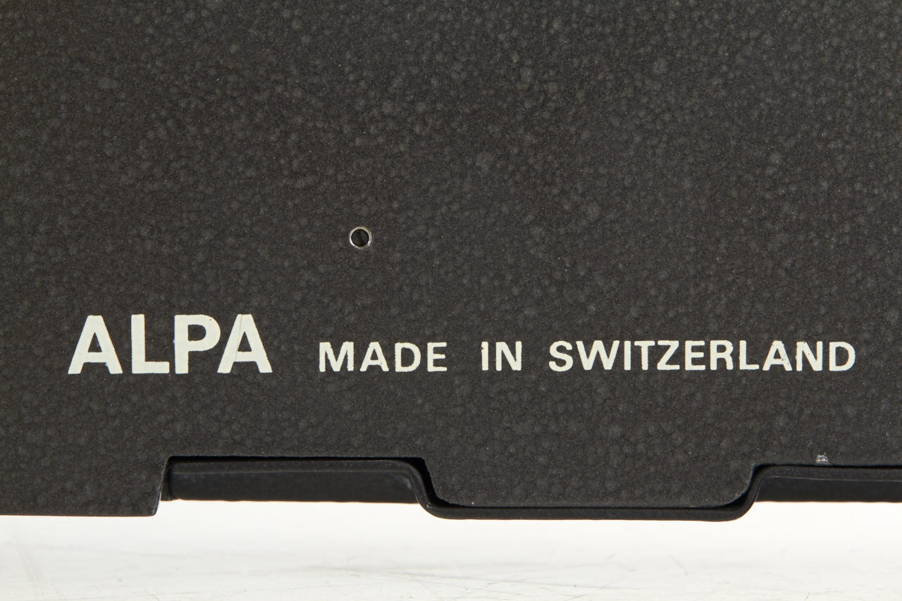 extremely rare Alpa camera, only approximately 20 units produced, in very good condition, with rare alpado 100ft bulk-film magazine no.6103 for 750 exposures, inclusive normal film back, tenmotor tensioning motor, combifo ac adapter and connection cables, all in aluminium case