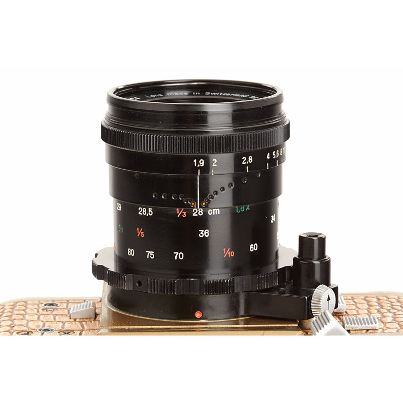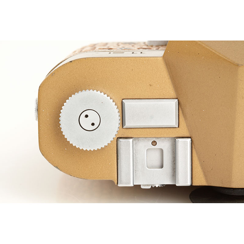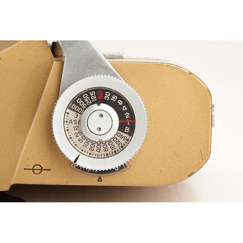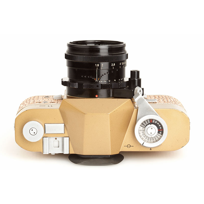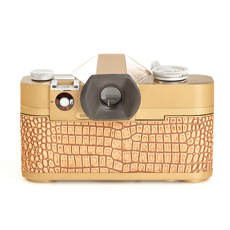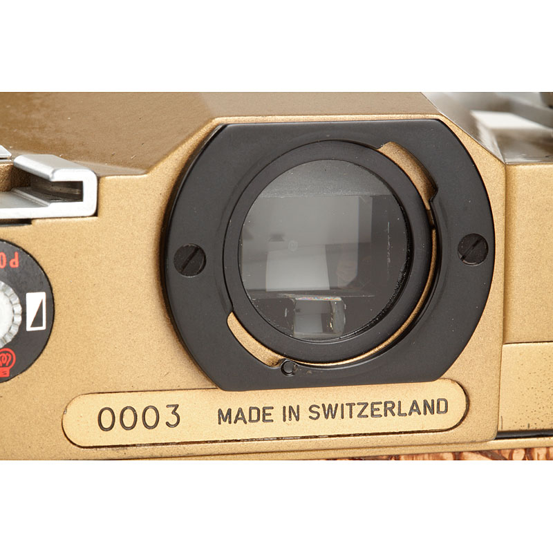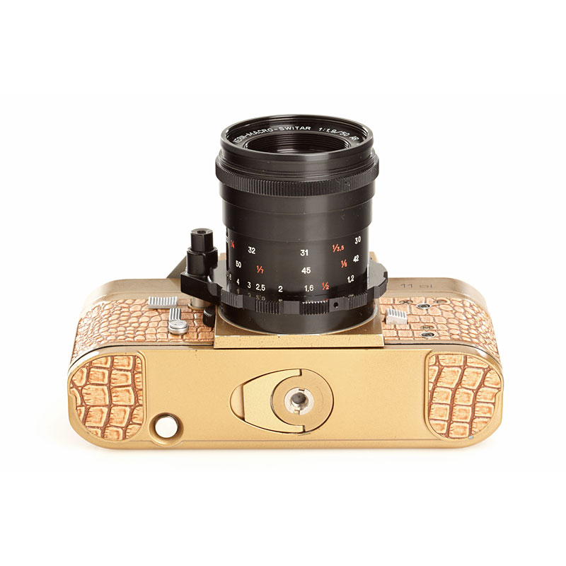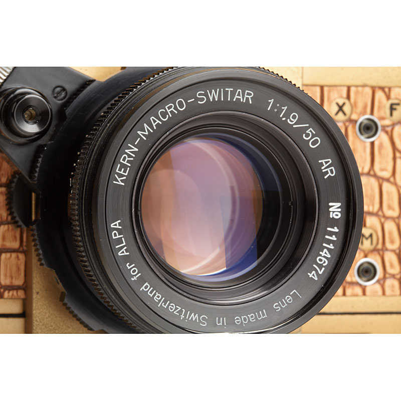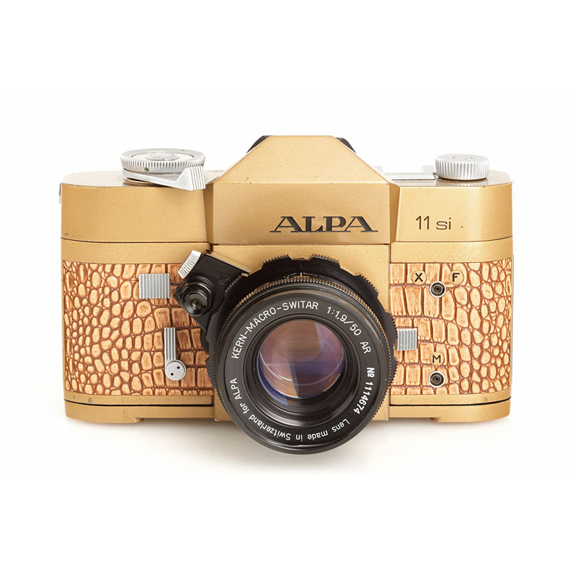 possibly unique Alpa in gold painted finish (like the 10d) and gainè crocodile maroon covering, in very fine original and good working condition with matching all-black Kern Macro-Switar AR 1.9/50mm no.1114674 (cap), guarantee card, instructions and red maker's box with both matching numbers (code GOLDSILMAT, the gold plated edition of 160 pieces had the code GOLDSILBODY), made by special order or as a presentation camera