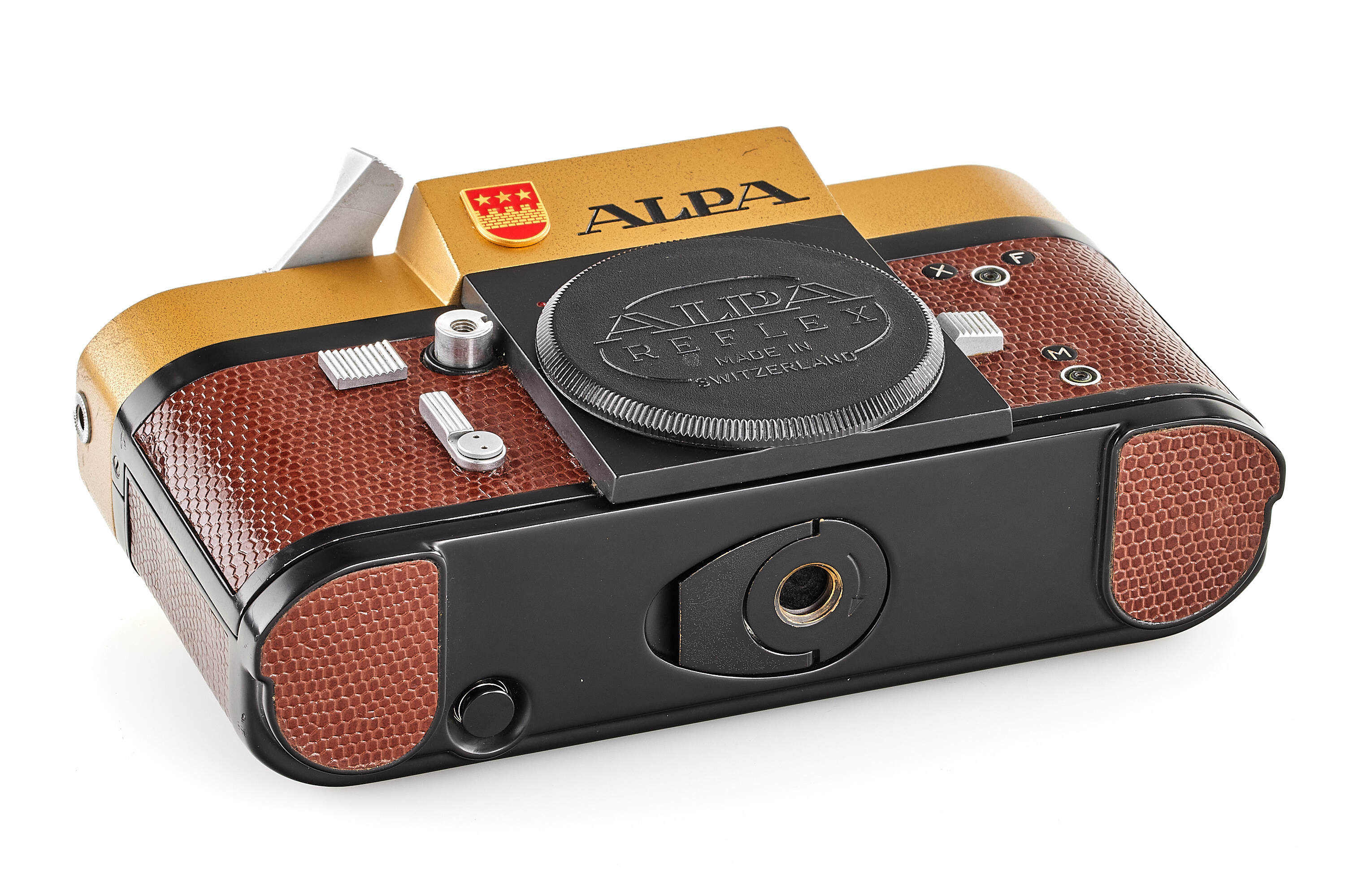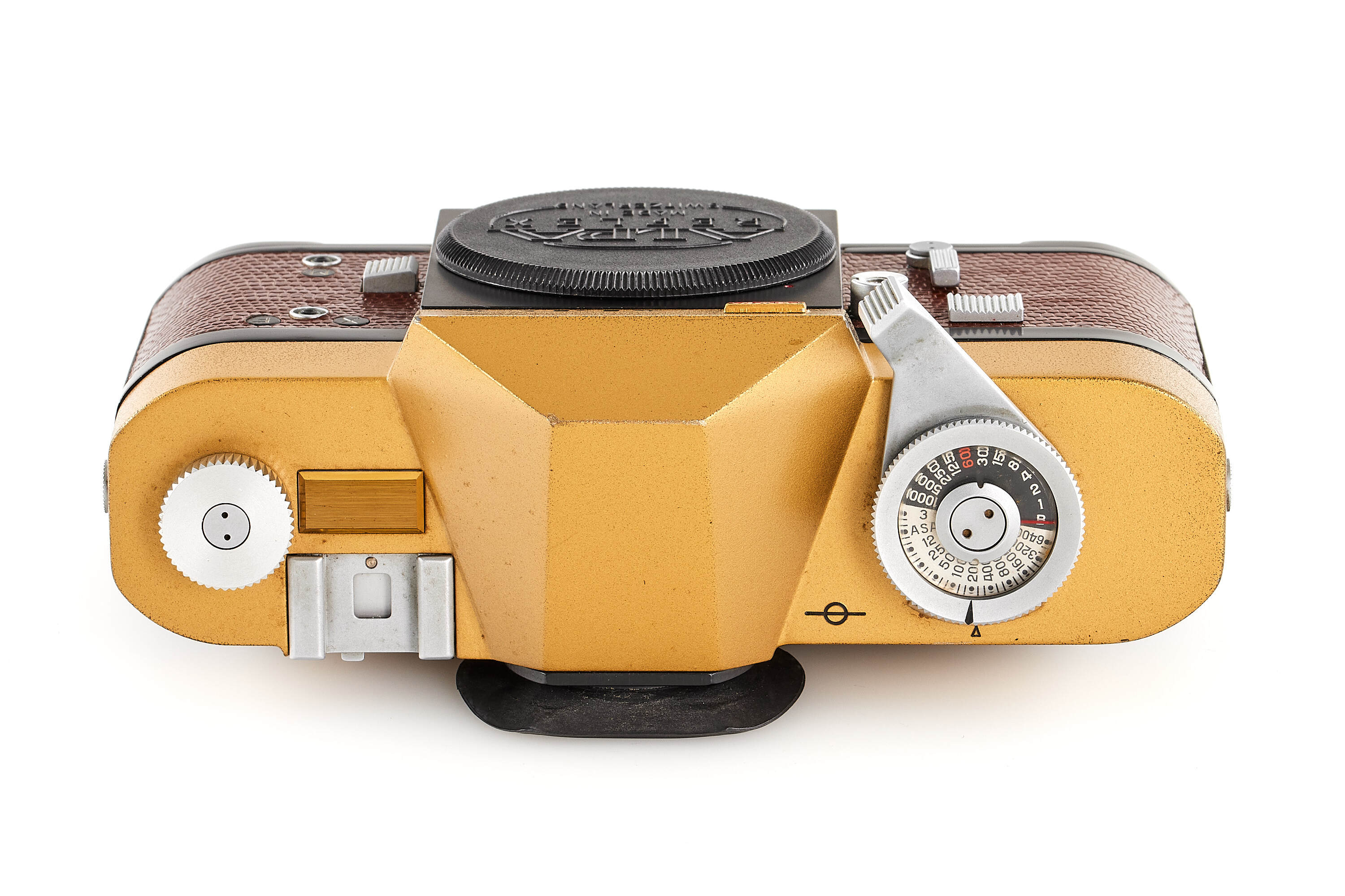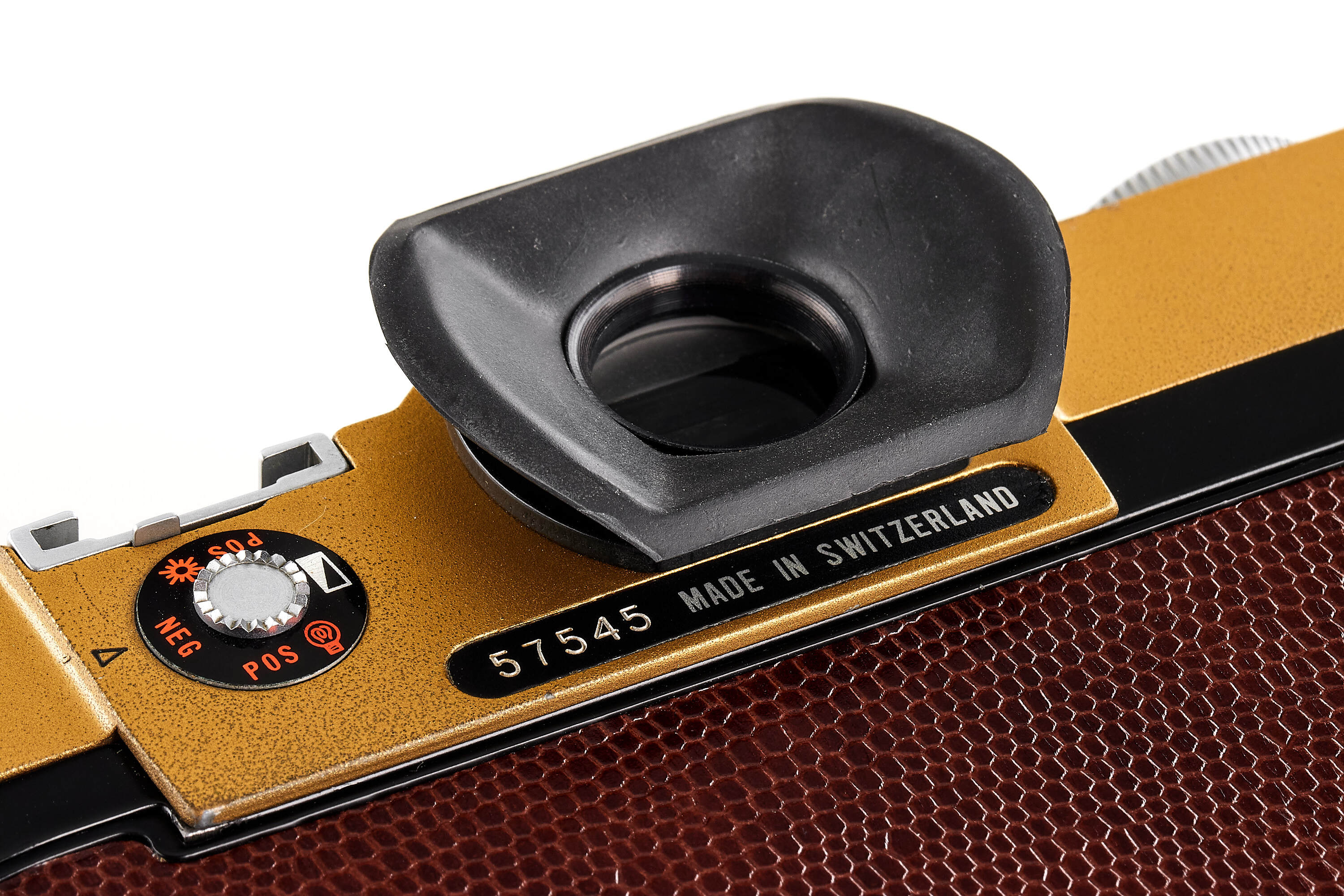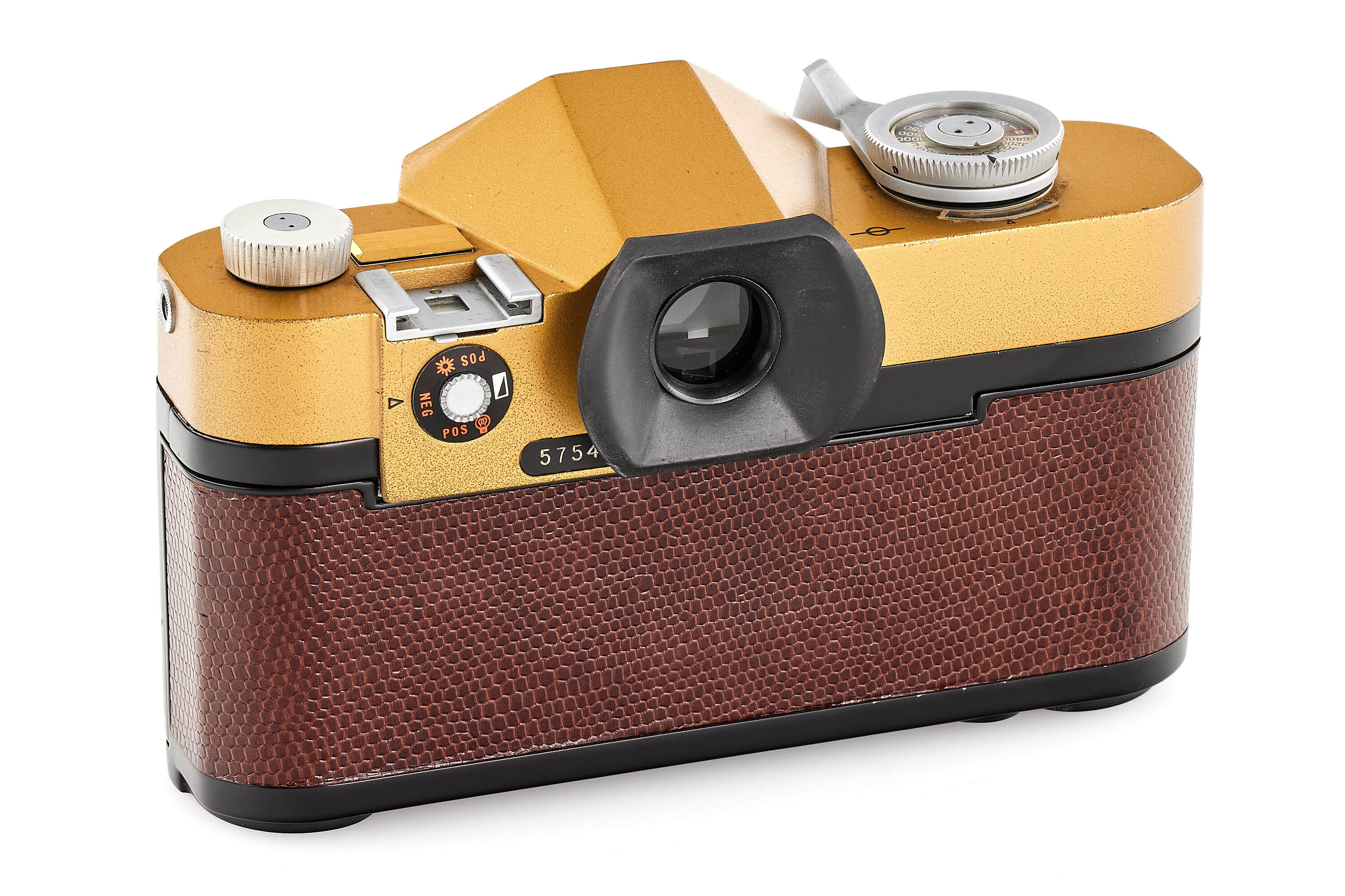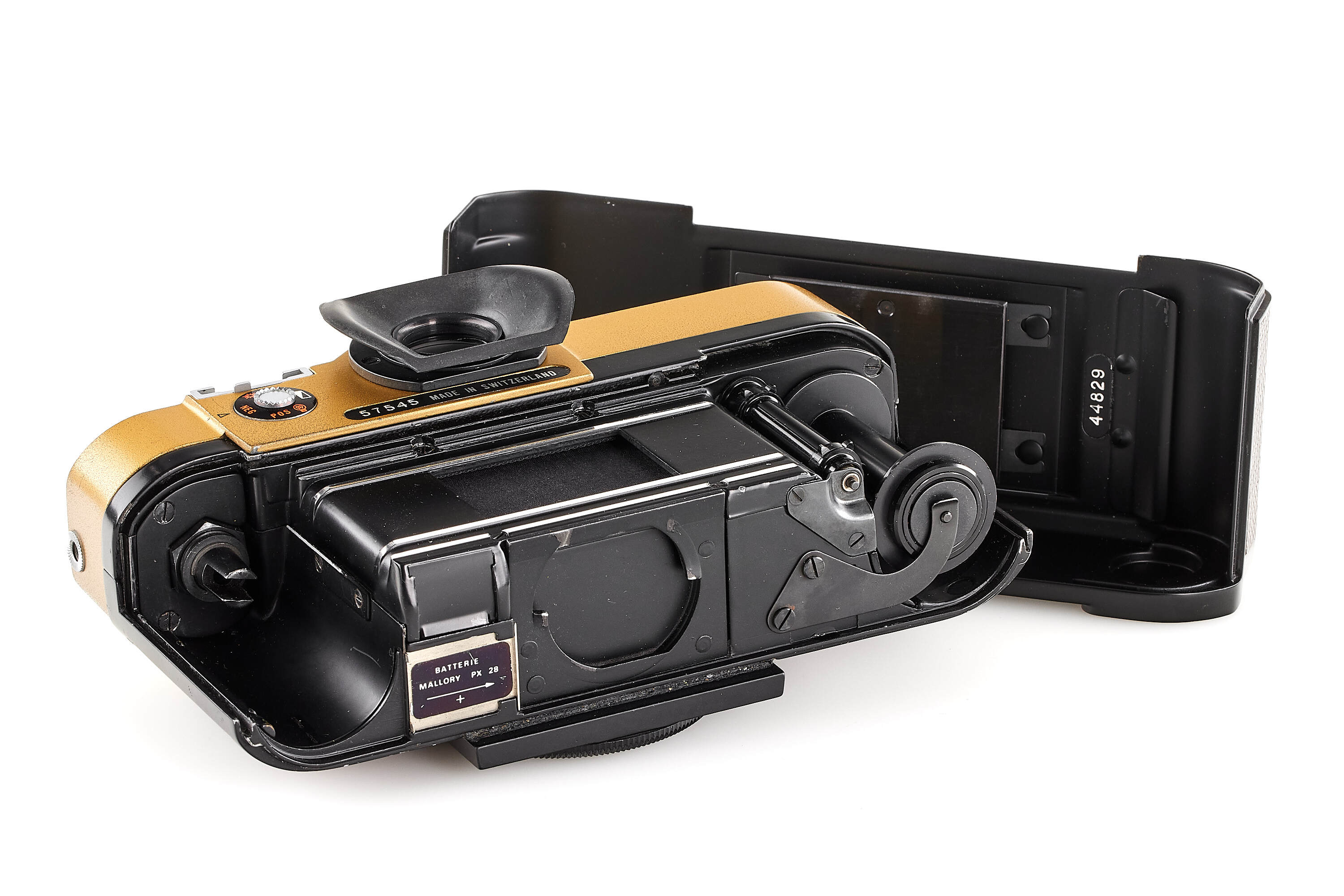 Very interesting, unknown gold version, in very good condition and working order, note the absence of camera model on the front, brown snake pattern leather cover, back attachment with another serial number (no.44829), with body cap.
