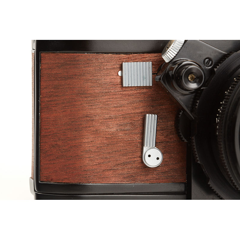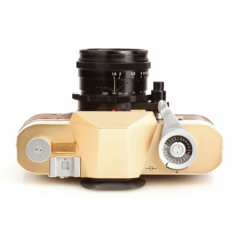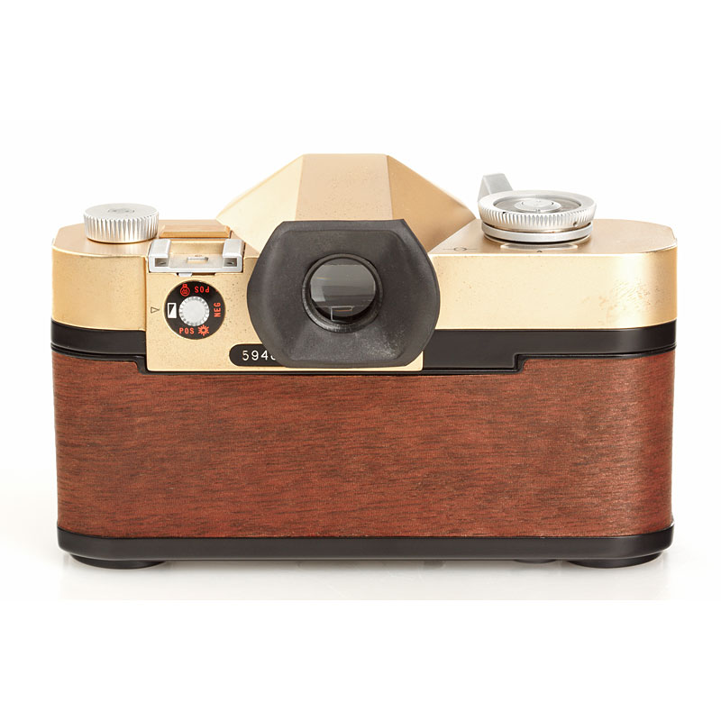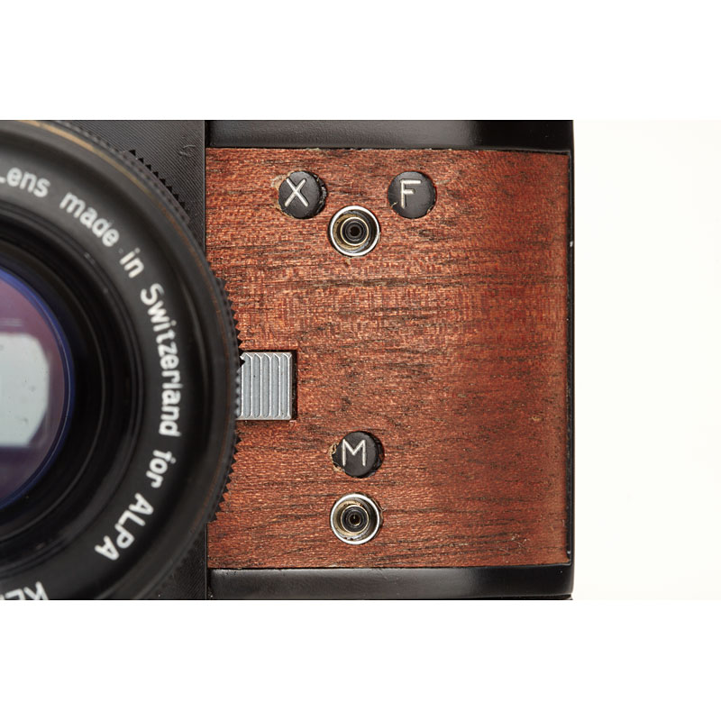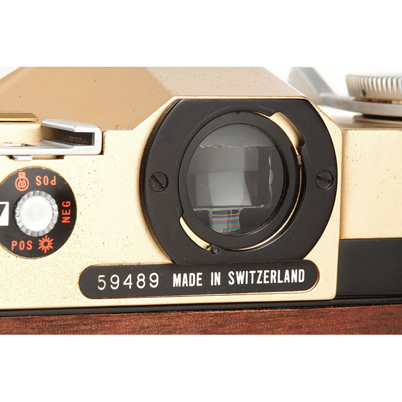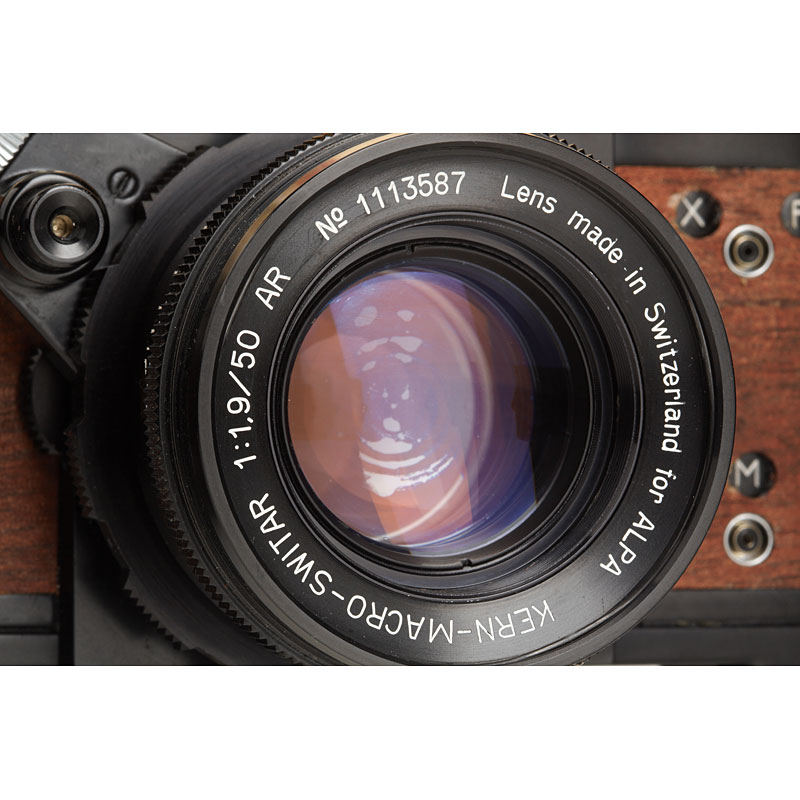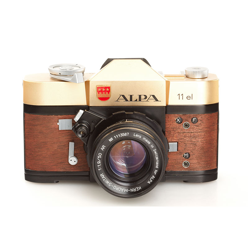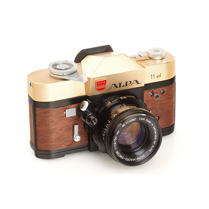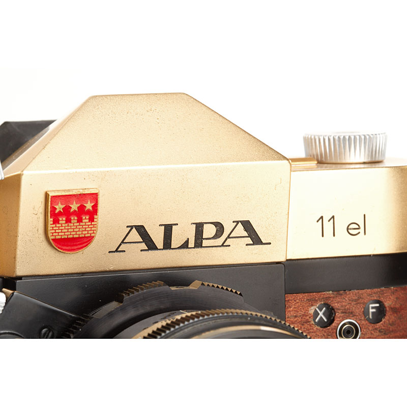 possibly unique Alpa 11el in gold painted finish (similar to 10d Gold Edition) and mahogany veneer covering, in very fine original and good working condition with matching all-black Kern Macro-Switar AR 1.9/50mm no.1113587 (UV filter, hood, cap), case, two filters (in boxes), instructions and red maker's box - made by special order or as a presentation camera