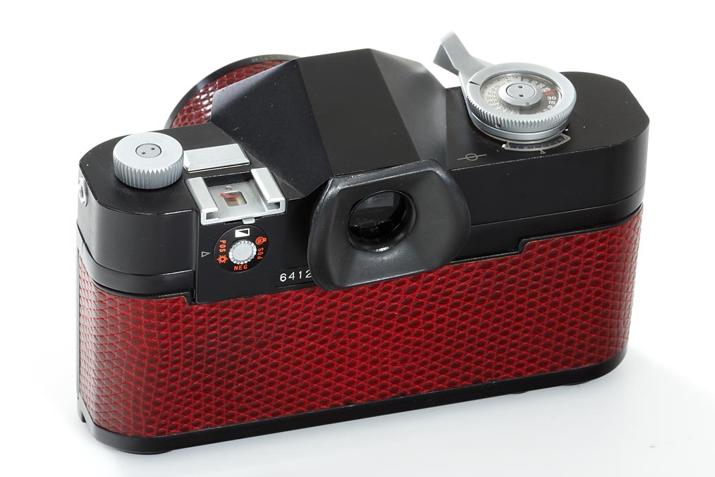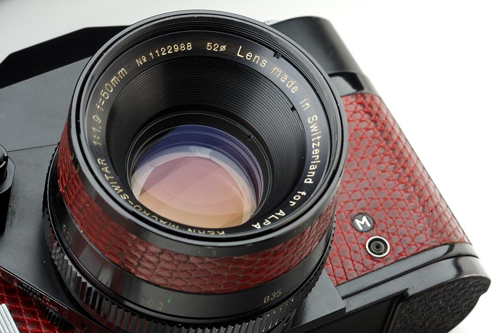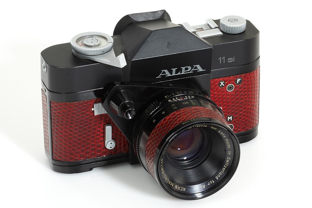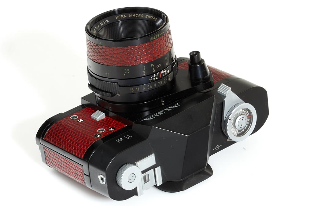 extremely rare, original black anodised Alpa 11si with red leather covering, Canon screen, late Kern Macro-Switar 1,9/50mm no.1122988 with red leather covering, original metal cap and lens hood with special adapter, rare red Alpa presentation box