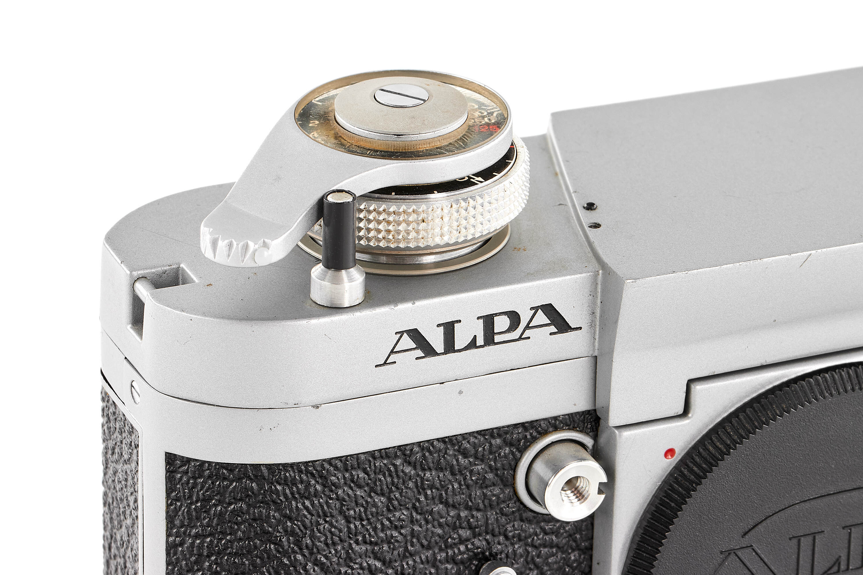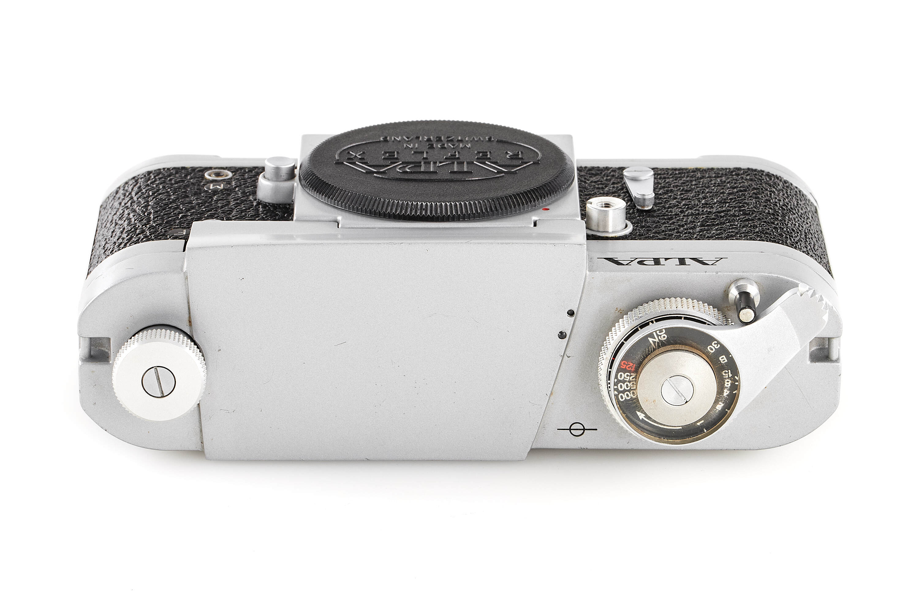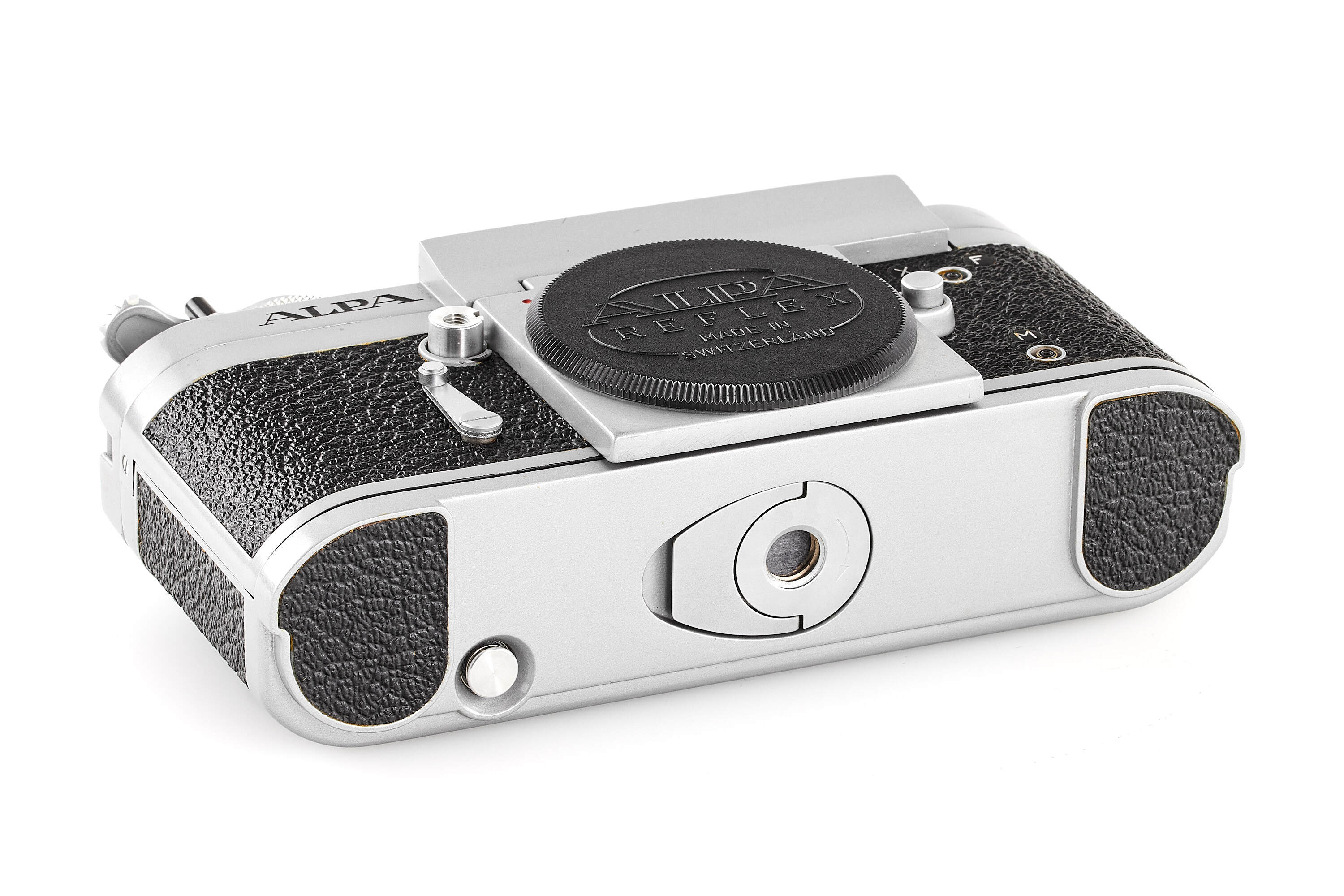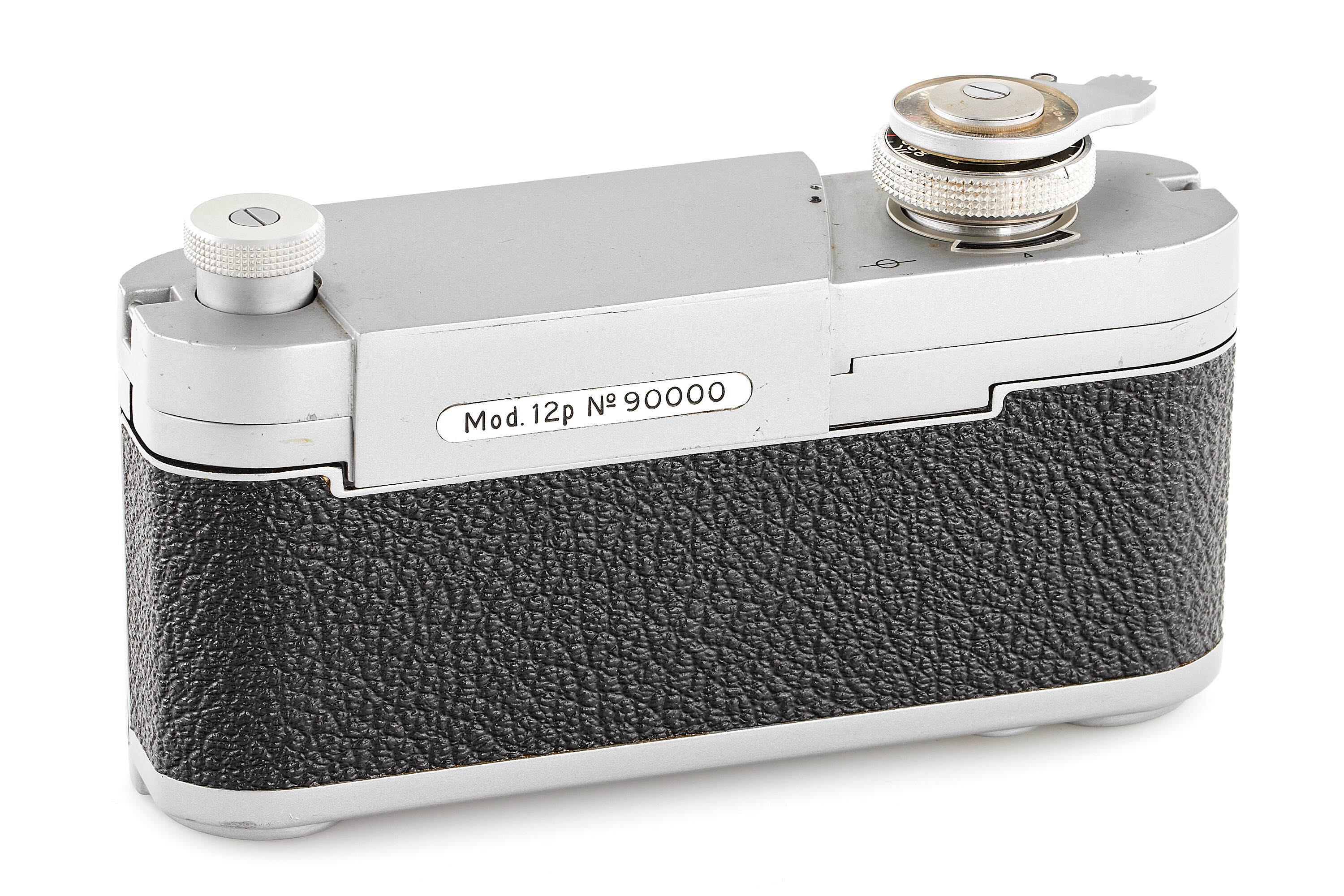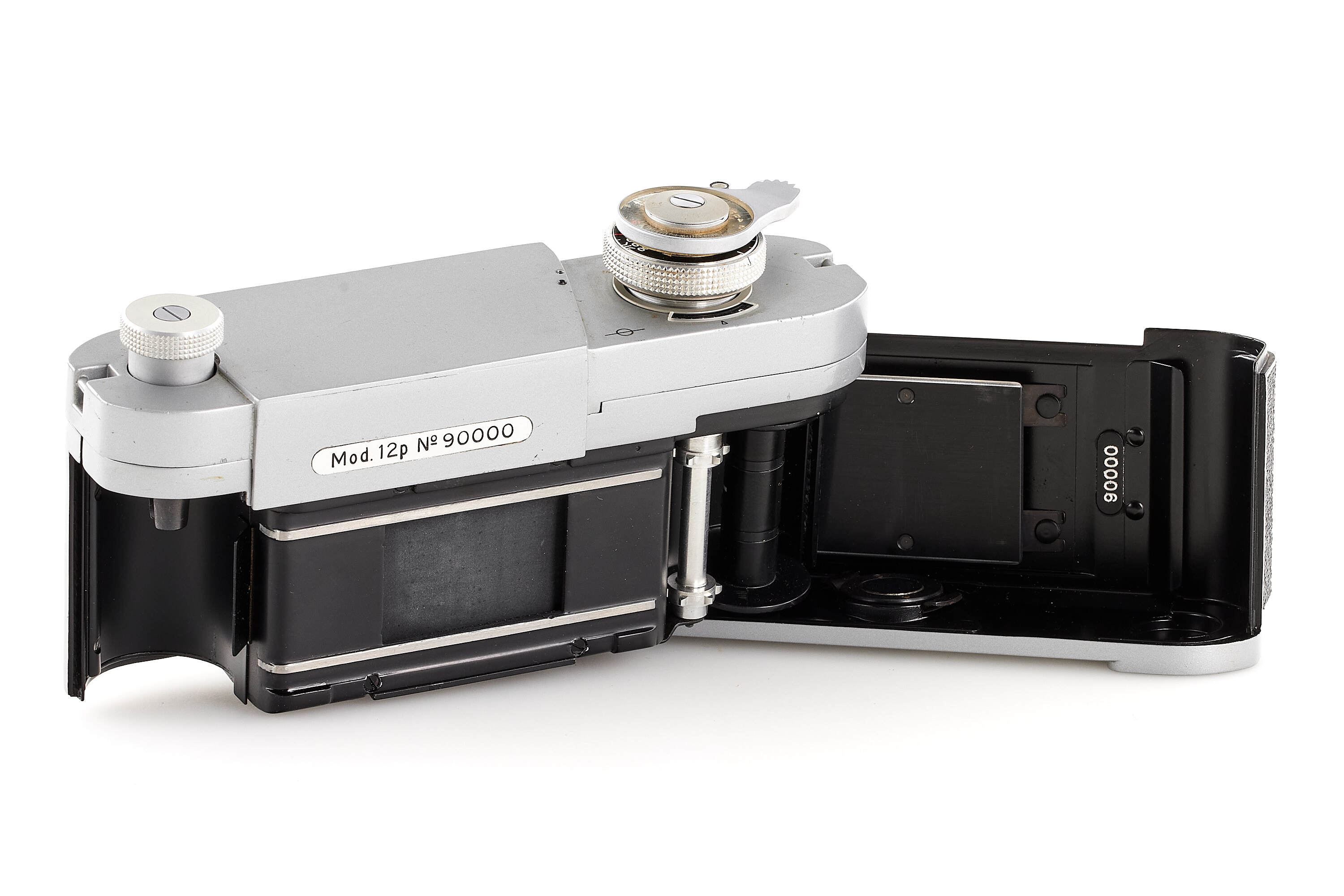 Probably a unique prototype Alpa Mod. 12p which never went into production, based on the Alpa 6c but without mirror and finder, for scientific or technical use, note the different course of the winding lever, the serial number no.90000 (might be allocated to prototype cameras), with body cap and back with matching serial number.