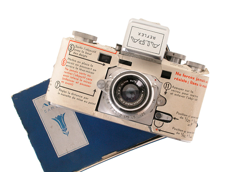Extrem seltene "Alpa im Schlafrock" mit umlegbarer Kurzbedienungsanleitung in Französisch, 2,9/50mm Angenieux Alpar Nr.72900, blaue Box, Kamera, Objektiv befinden sich in neuwertigem Zustand