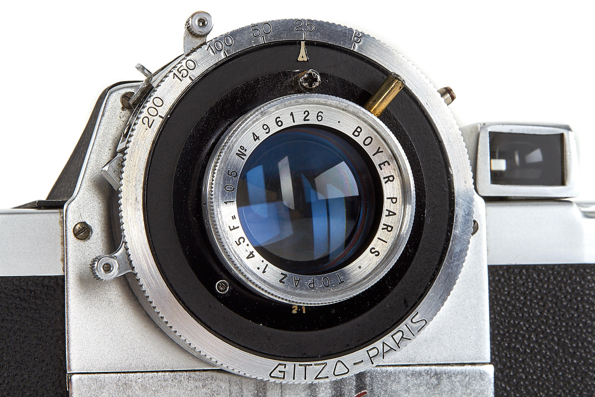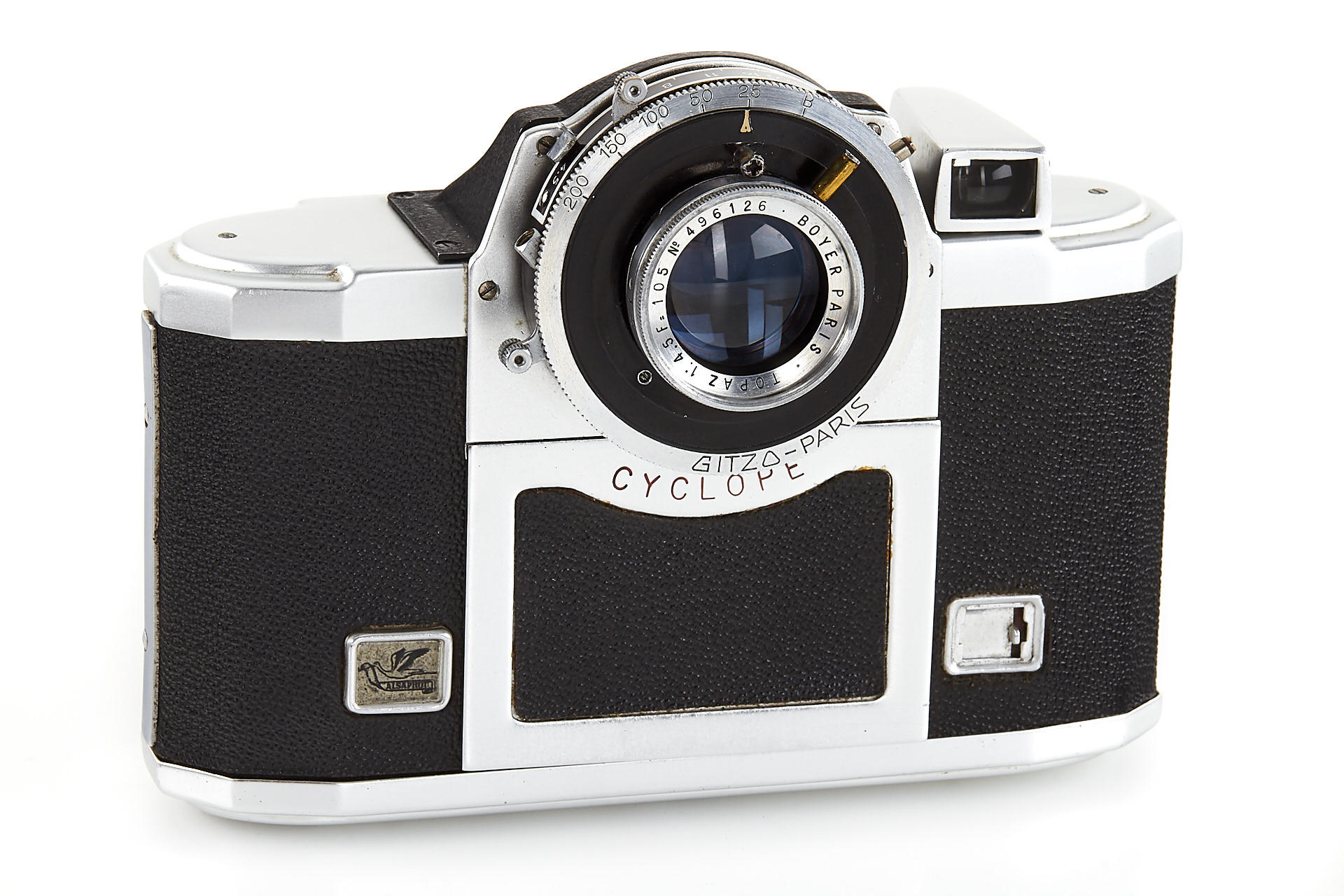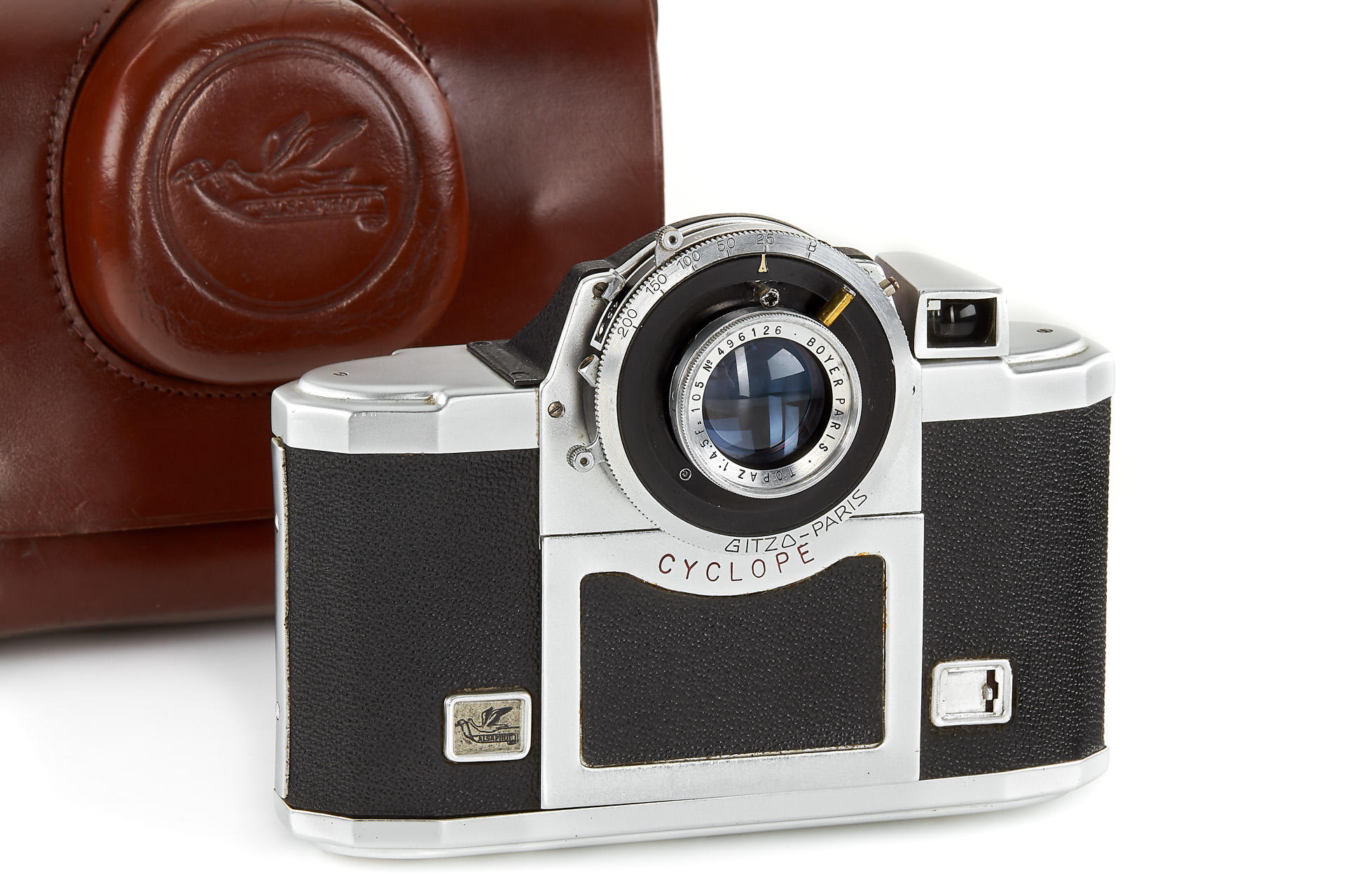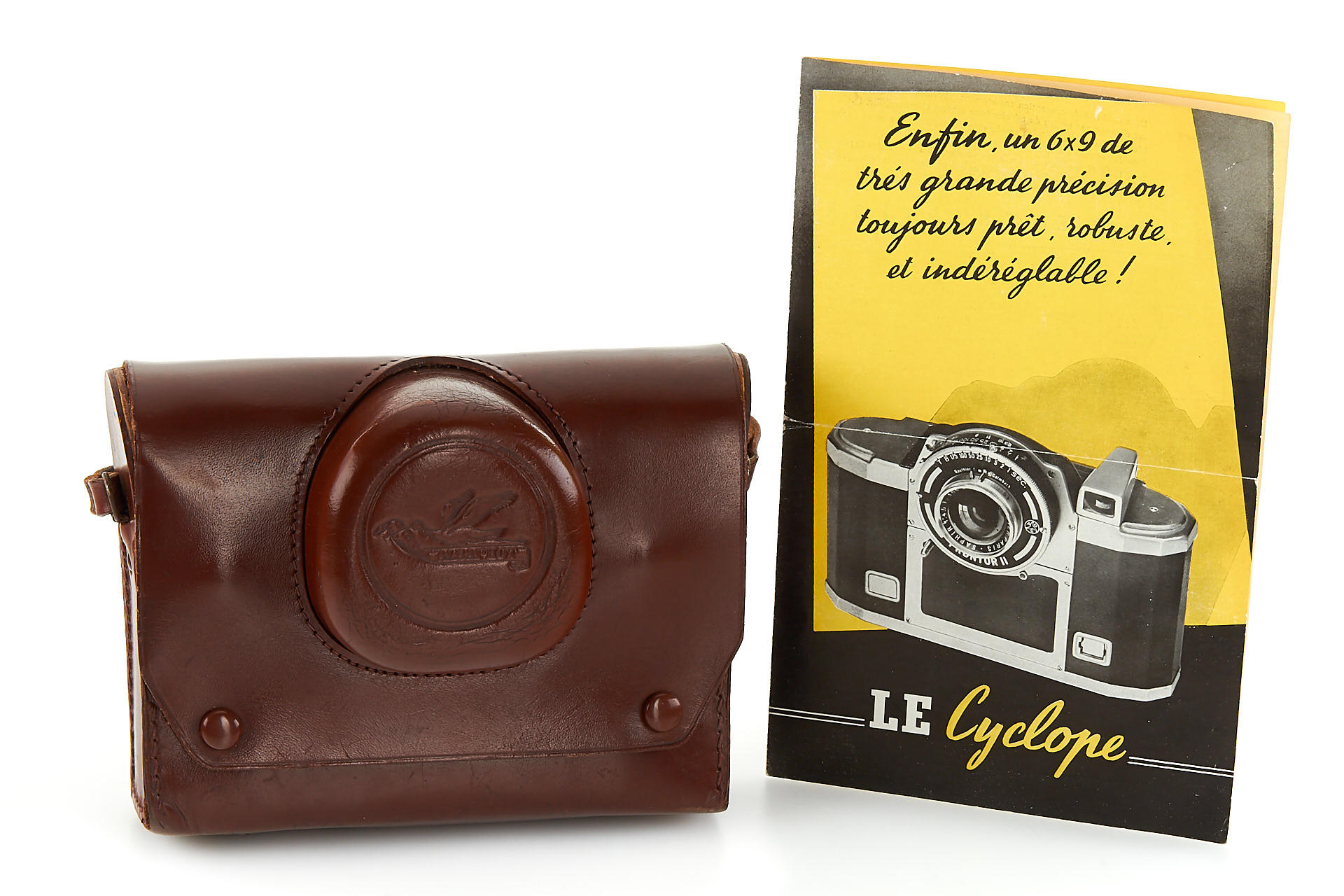 medium format viewfinder camera of unique design for 6x9cm exposures on 120 film, uncommon version with Gitzo shutter, with Topaz 4.5/105mm no.496126, in near mint condition (only the focusing pin replaced), and good working order, with rare original brochure and near-mint leather case