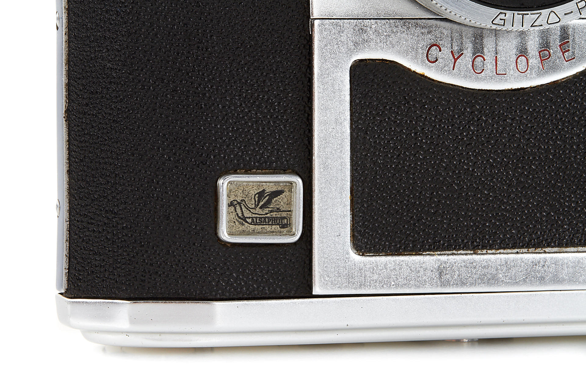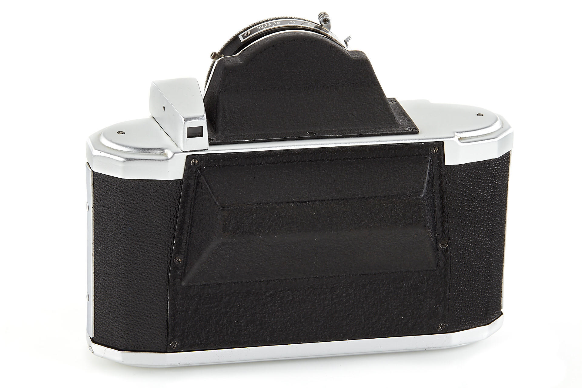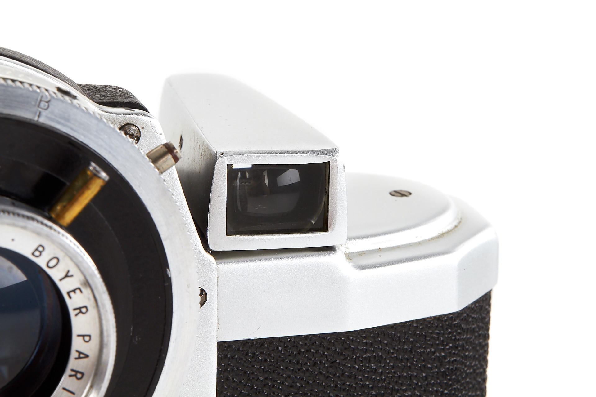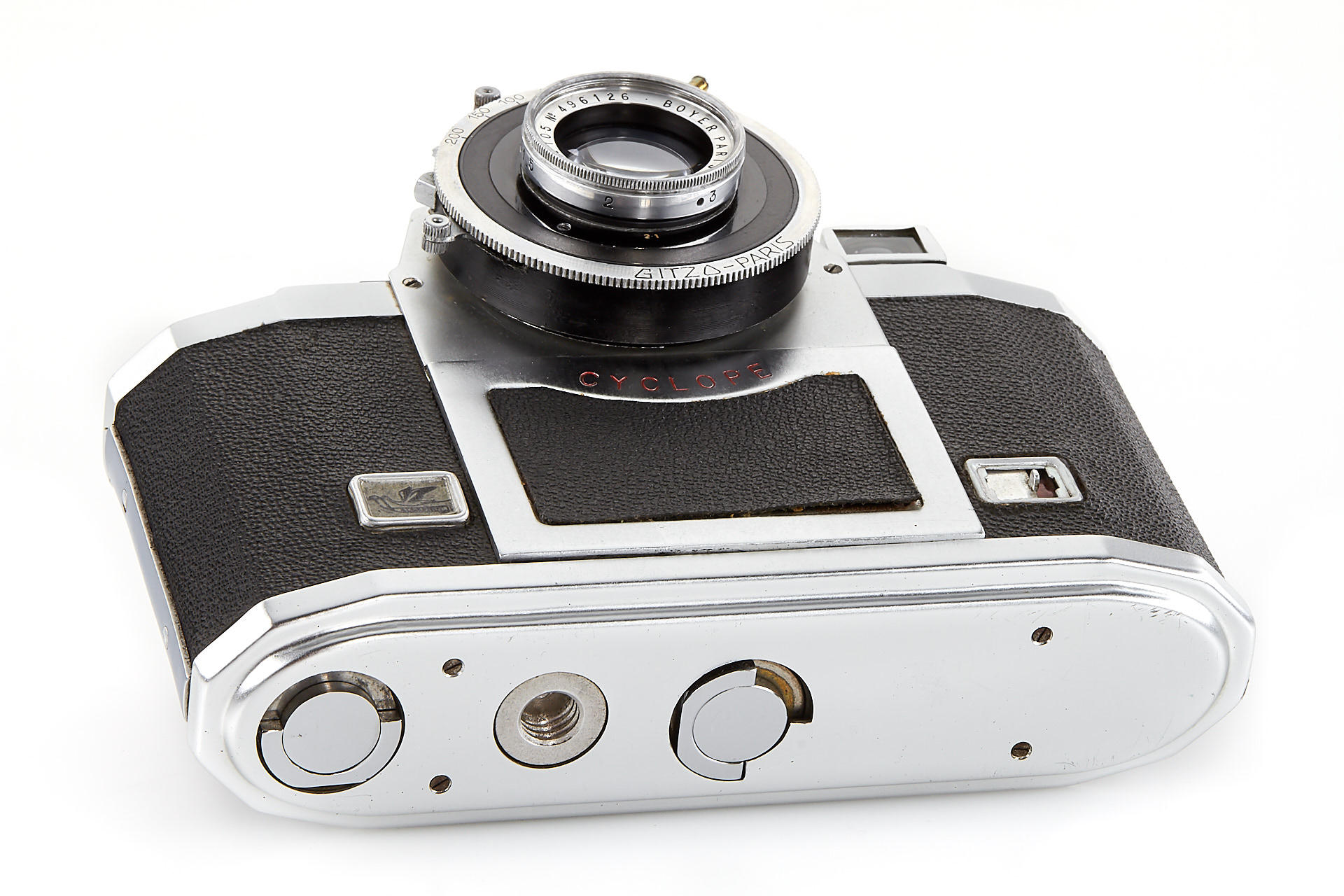 medium format viewfinder camera of unique design for 6x9cm exposures on 120 film, uncommon version with Gitzo shutter, with Topaz 4.5/105mm no.496126, in near mint condition (only the focusing pin replaced), and good working order, with rare original brochure and near-mint leather case