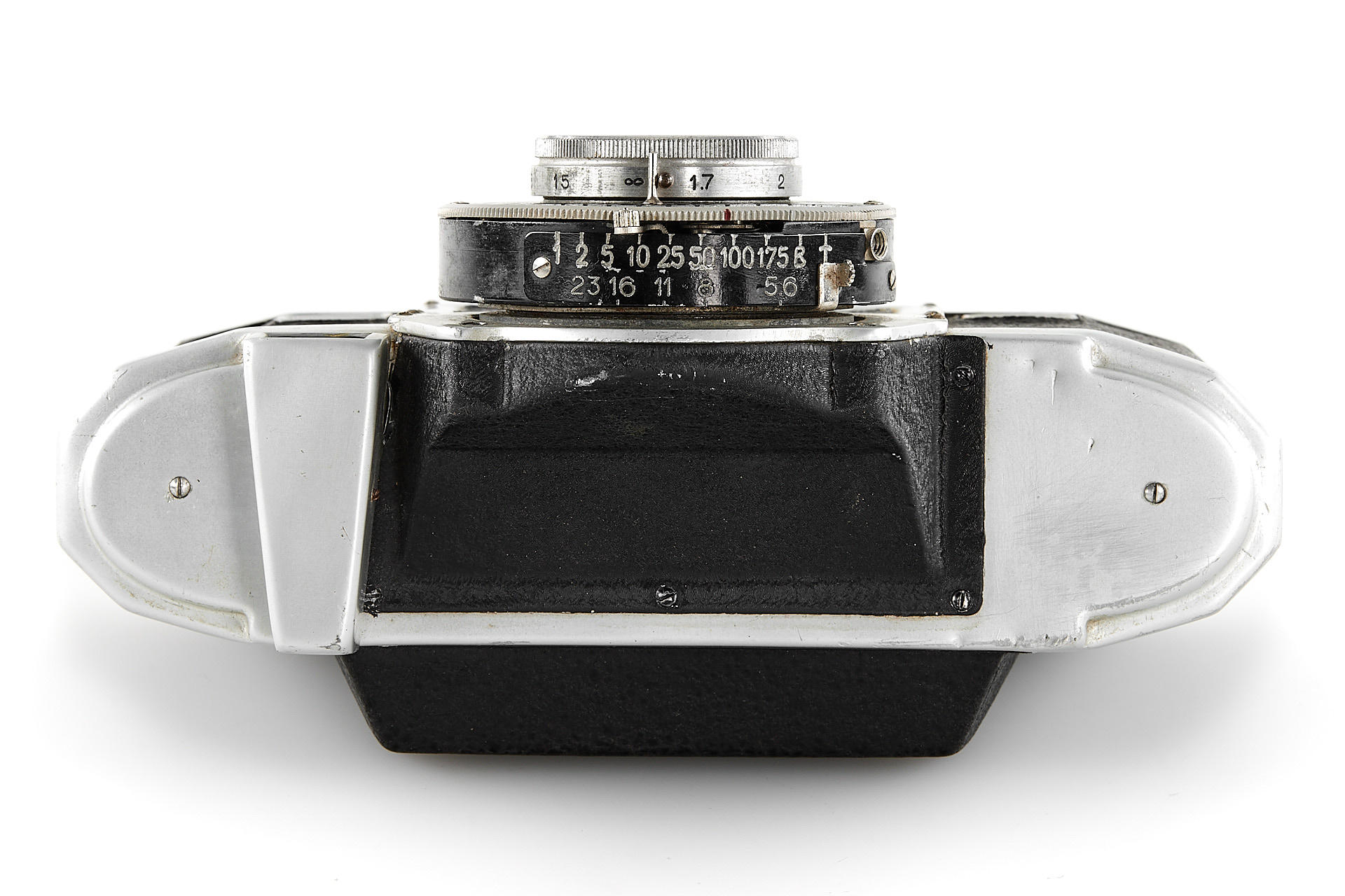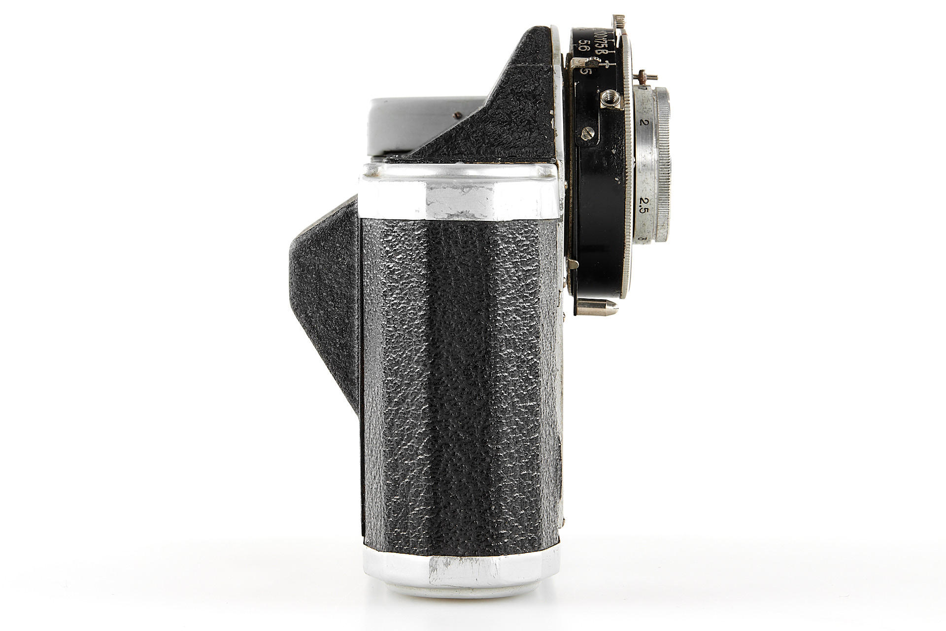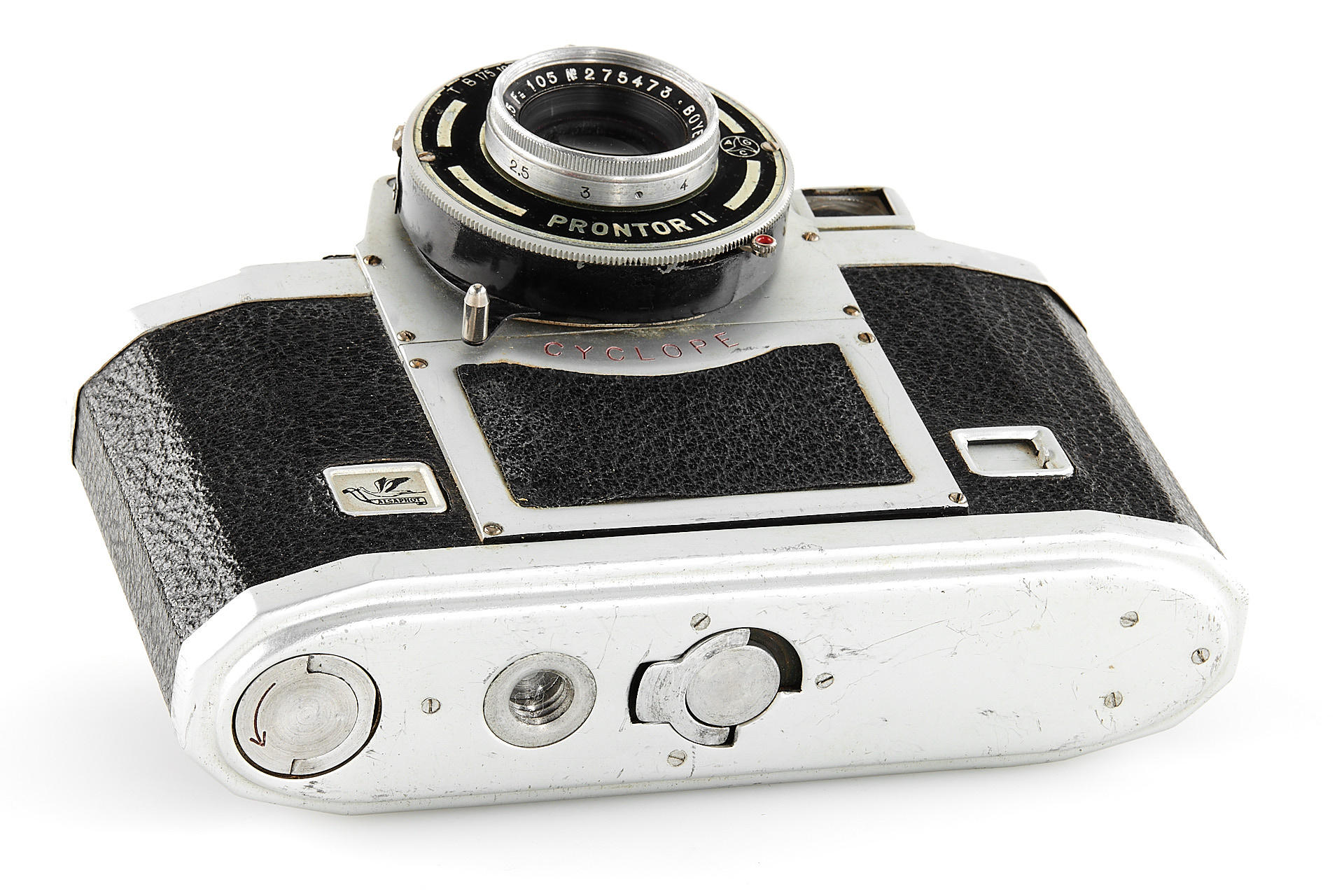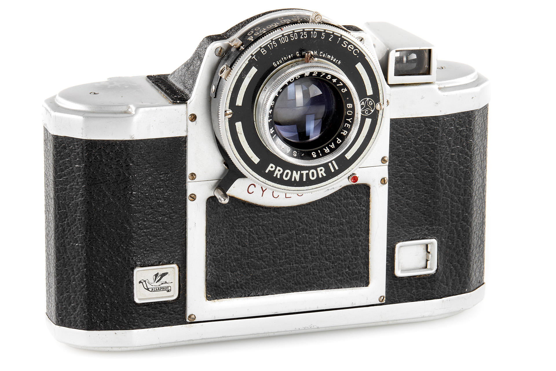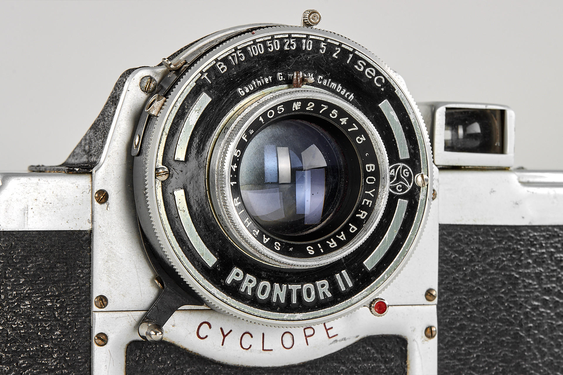 Medium format viewfinder camera in good condition and working order, for 6x9cm exposures on 120 film, unique design made in France, with Boyer Saphir 4.5/105mm no.275473 housed in Prontor II shutter