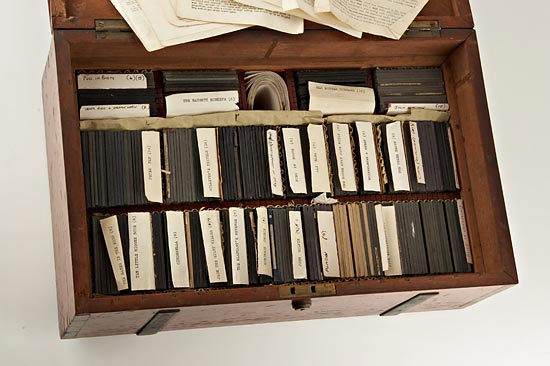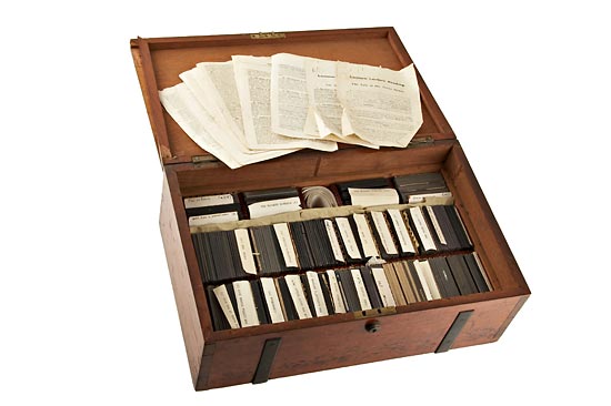 English, all chromolithographed, 3 1/4 x 3 1/4", comprising sets of children's stories such as Peter Pan, John Gilpin, Dick Whittington, Alice in Wonderland, The House that Jack Built, Gulliver's Travels, Robinson Crusoe, and others, most complete and many with original printed lecture notes. In mahogany case. Judging from the notes included, these sets of slides were entertaining children at the Parish Church of St. Bartholomew until at least the 1940's. Ex Spira Collection.