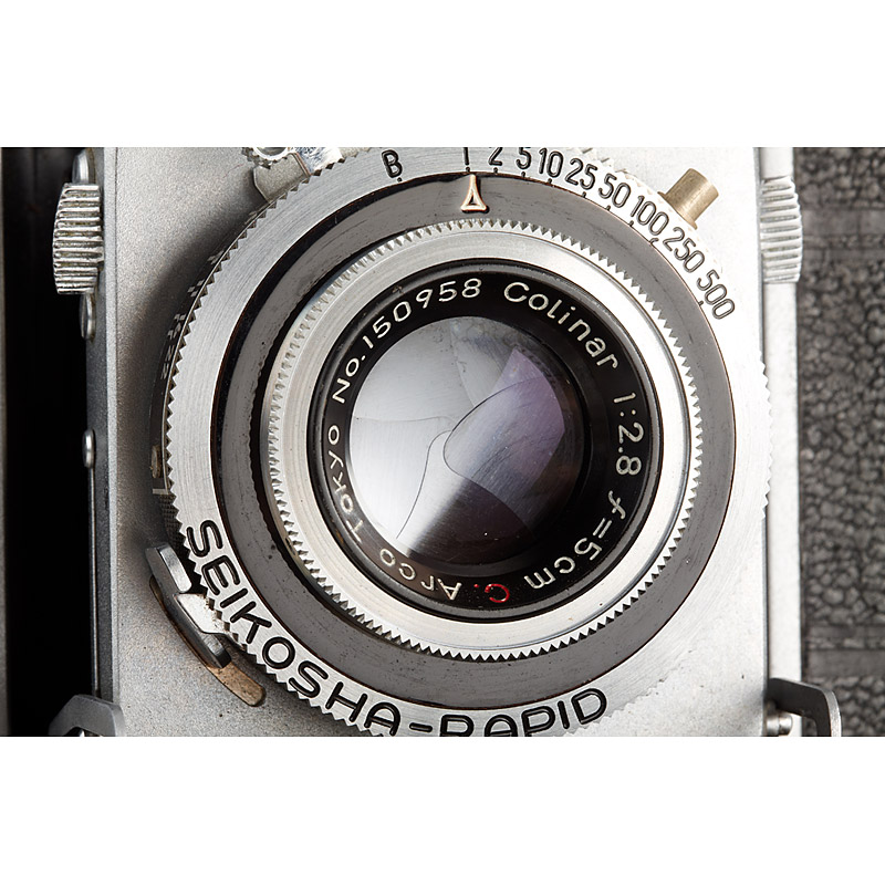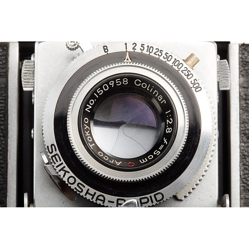 35mm folding bed camera with Colinar 2.8/5cm no.150958, cap, View-Arco reflex finder with View-Colinar 2.8/5cm no.468 for use as a twin-lens reflex camera, 5cm finder, hood with filter, all with matching cases, camera and reflex finder with original maker's boxes - a very rare set in near mint condition