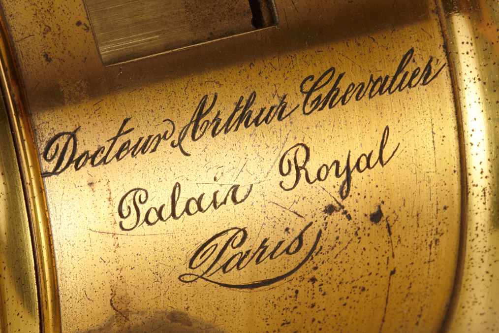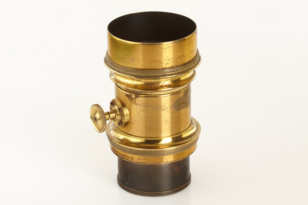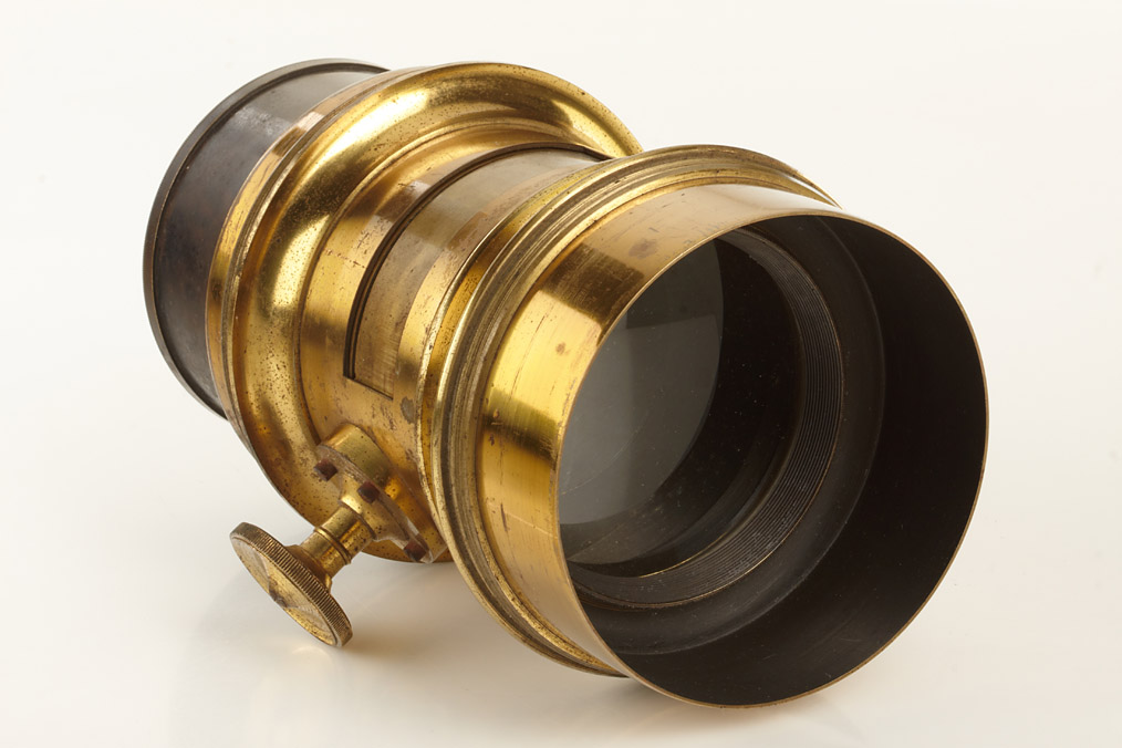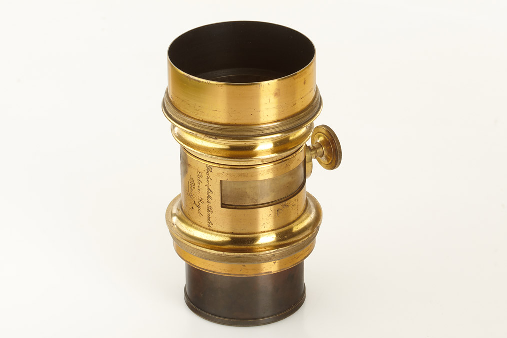 interesting portrait brass lens in good condition with radial drive rack-and-pinion focus by the well known French optician and lens designer engraved: DOCTEUR ARTHUR CHEVALIER PALAIS ROYAL PARIS, approx. 42cm focal length, rear and front lens diameter c. 7.5cm, opening for water house stops, hood, total height: 21cm, shutter cap, in the original wooden box. The most common construction for Petzval lenses featured the so called tangent rack-and-pinion mechanism - lenses with a radial drive are quite rare since the mechanism was only utilized over a short period of time - from about 1850 to the mid 1870's.