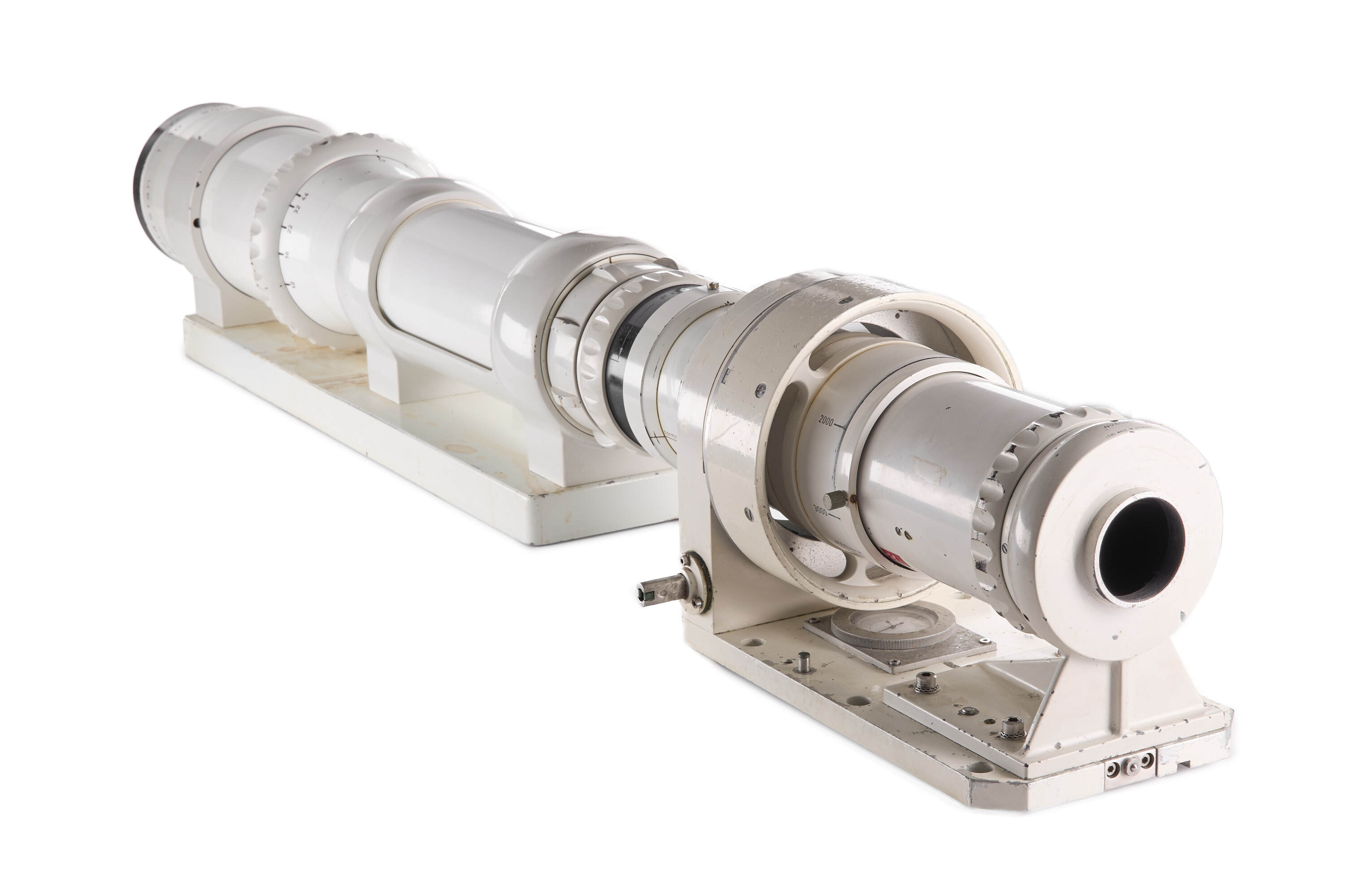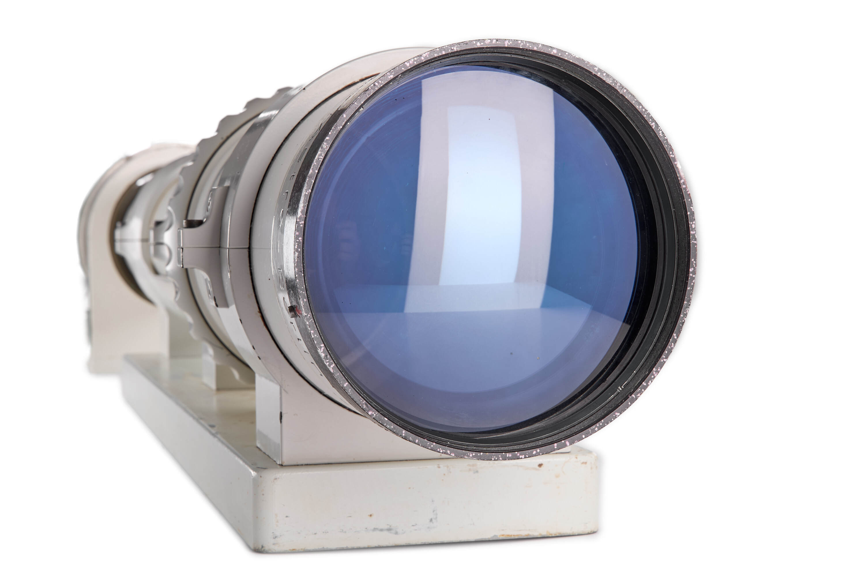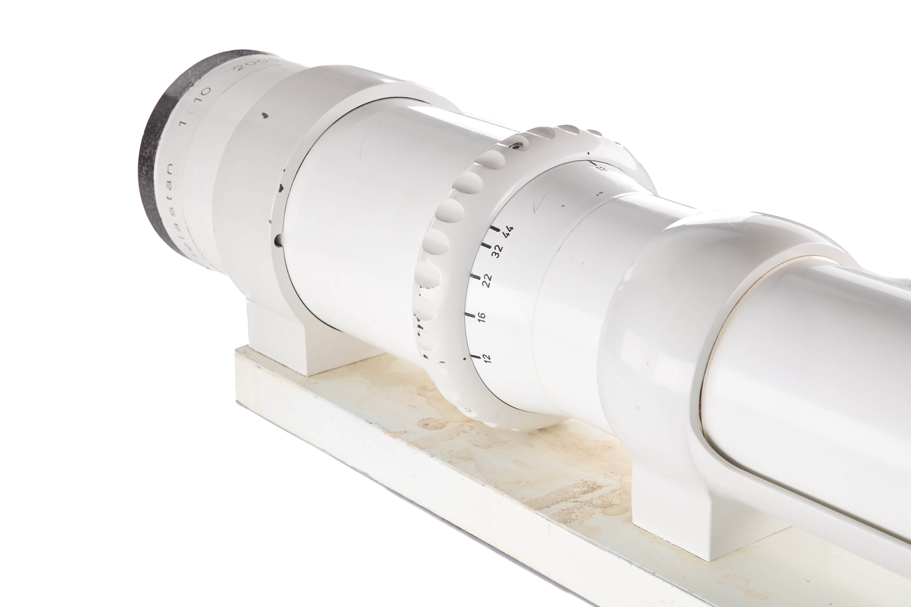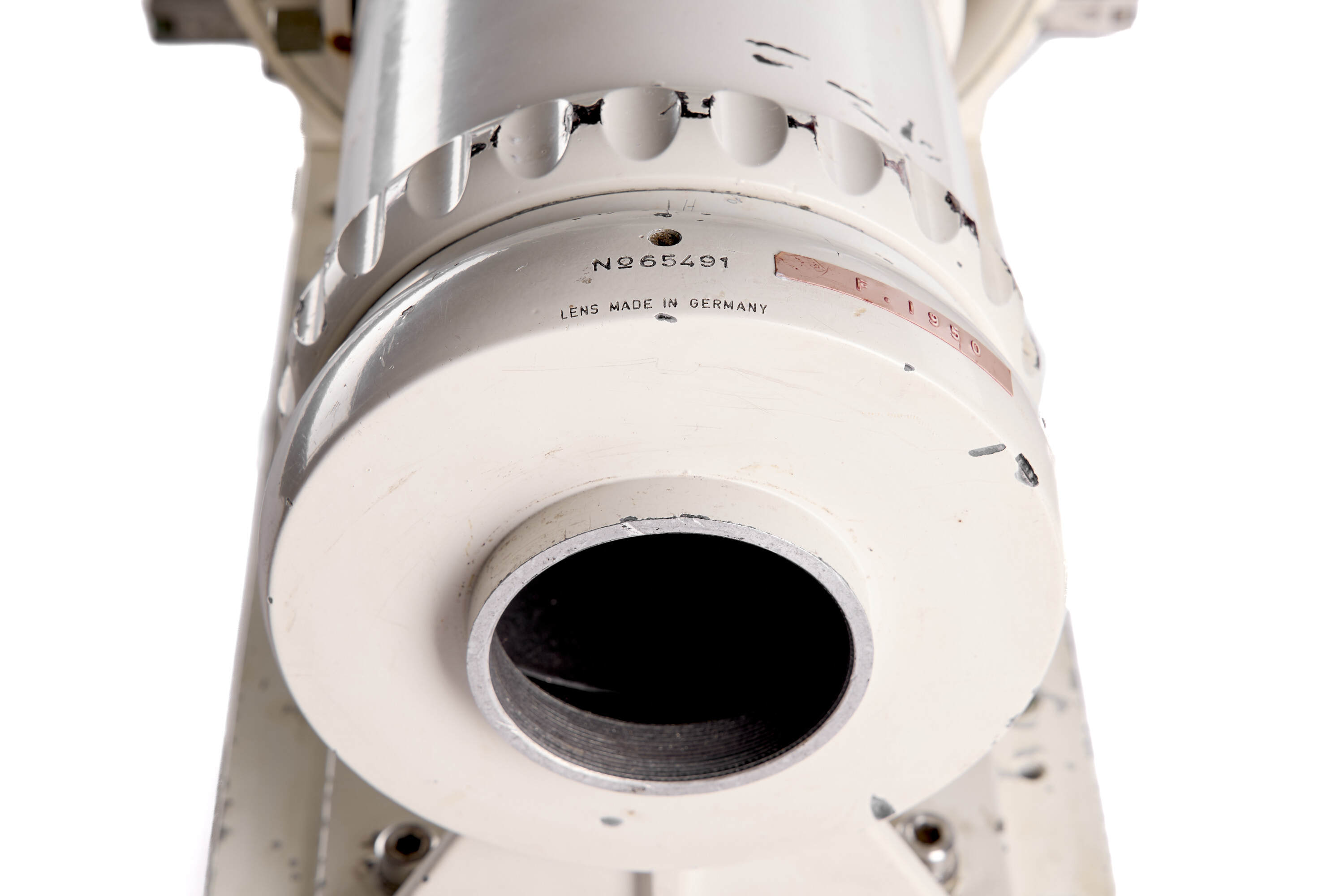 A huge military lens used for missile tracking on battleships, covering 70mm film format, white painted, 157cm total length, filter slot, adjustable aperture F:10 to F:44, very rare - the lens was only made for the military to special order. In good condition.