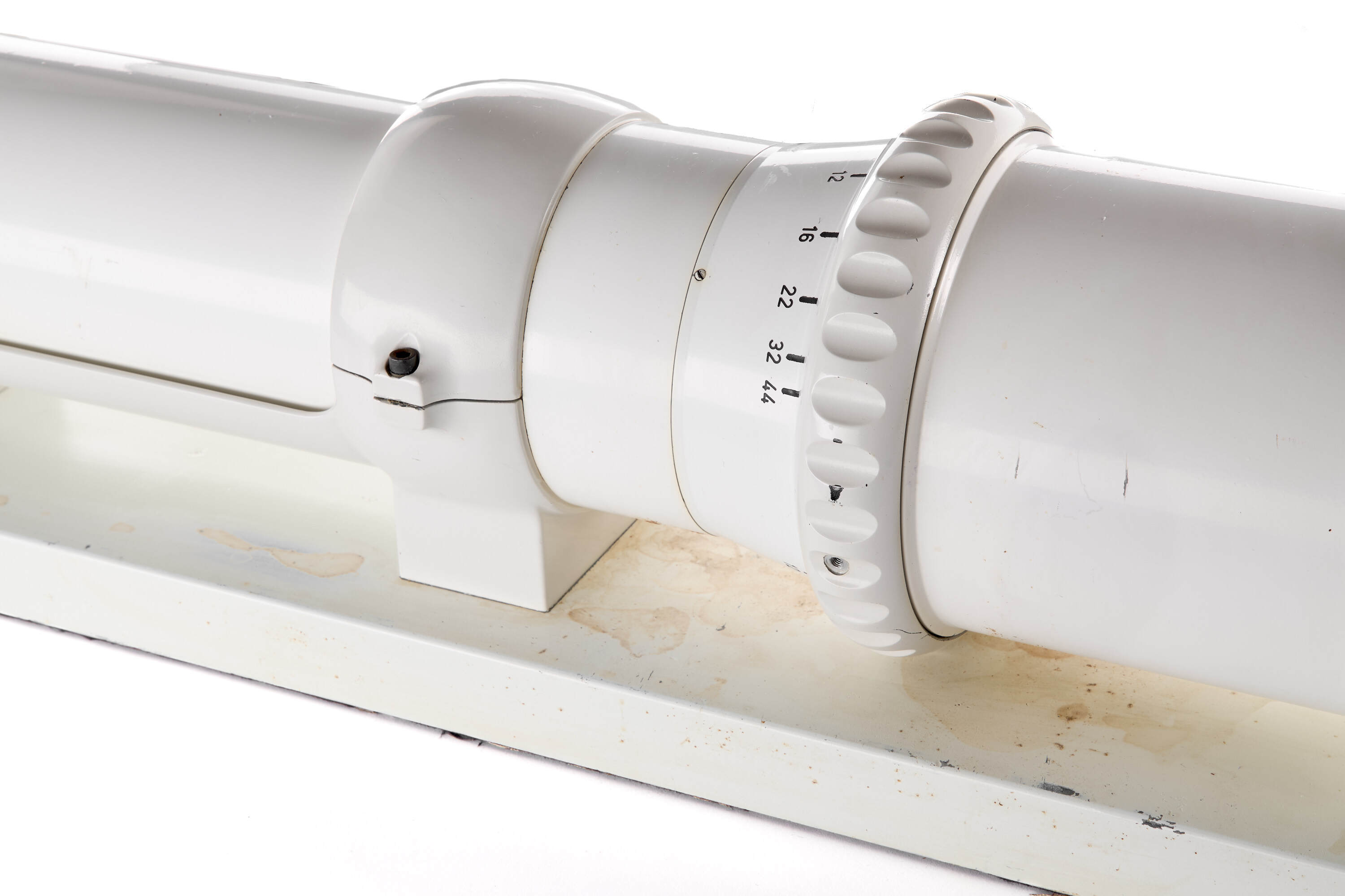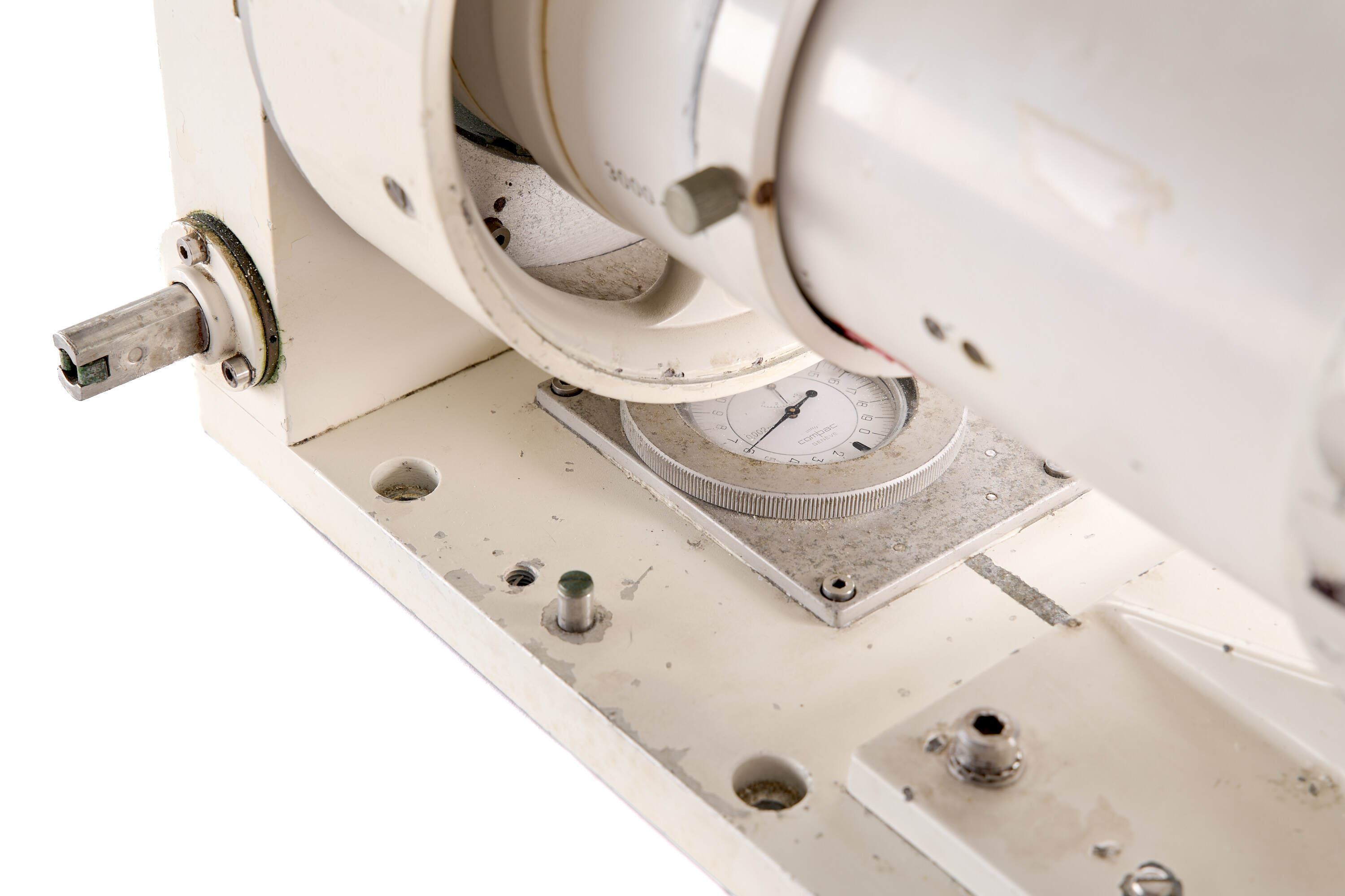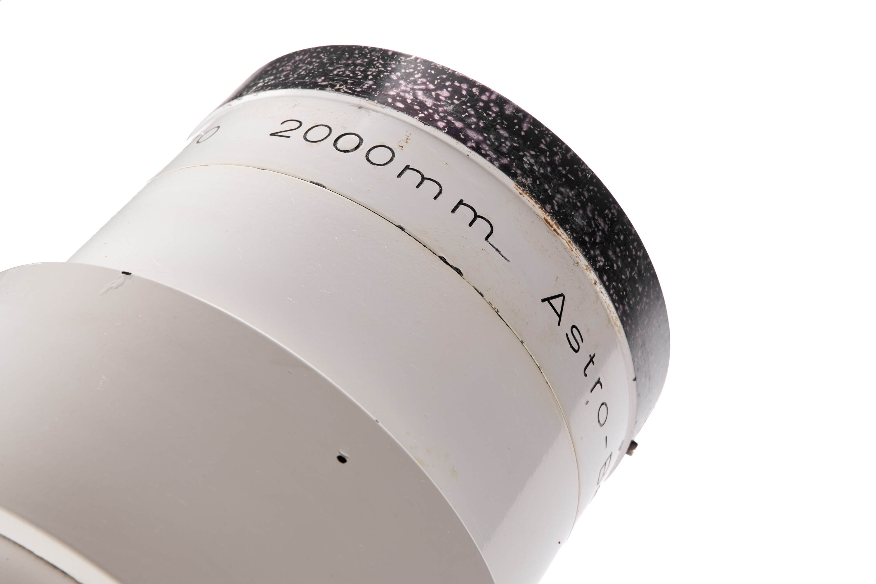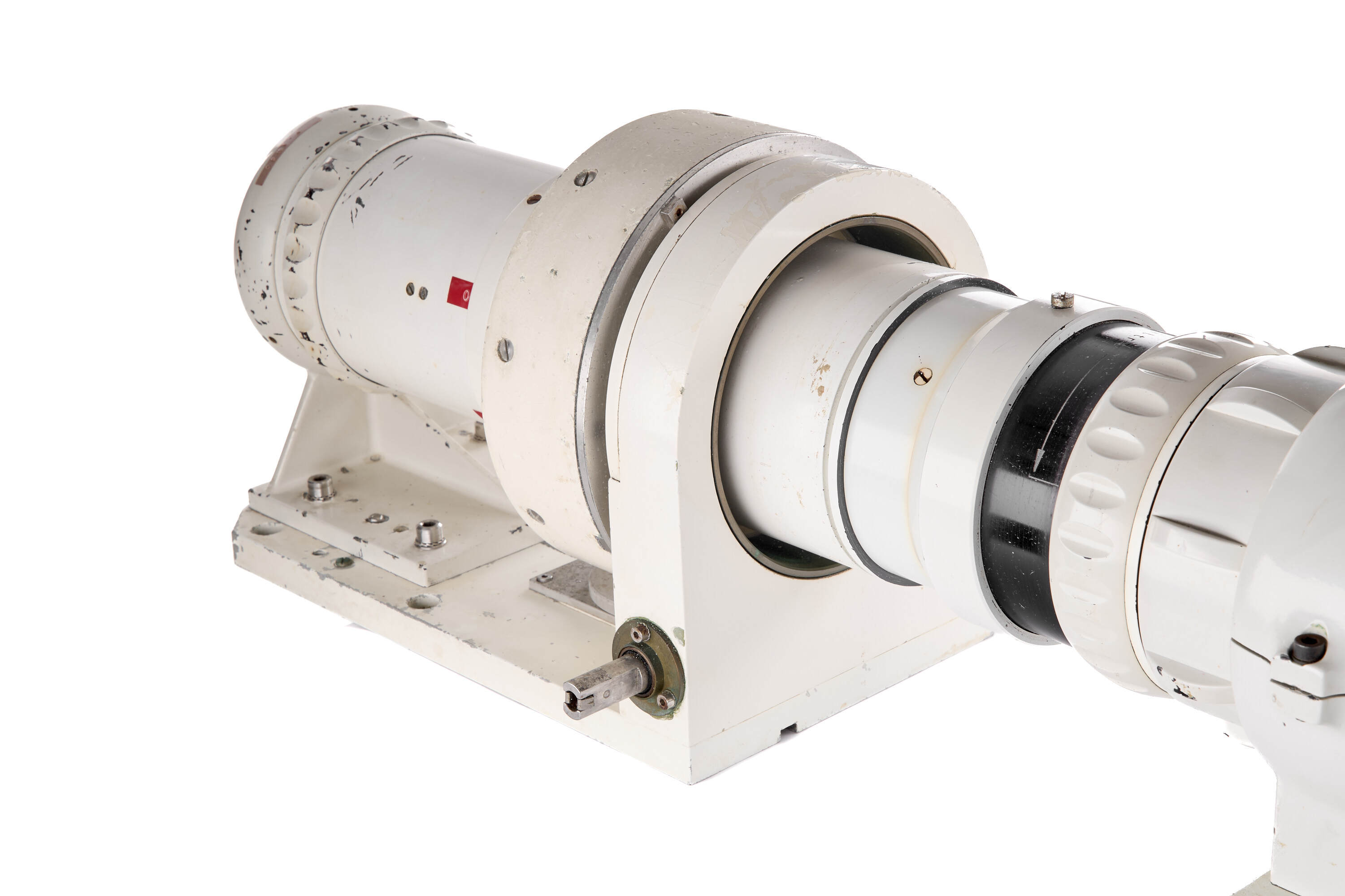 A huge military lens used for missile tracking on battleships, covering 70mm film format, white painted, 157cm total length, filter slot, adjustable aperture F:10 to F:44, very rare - the lens was only made for the military to special order. In good condition.
