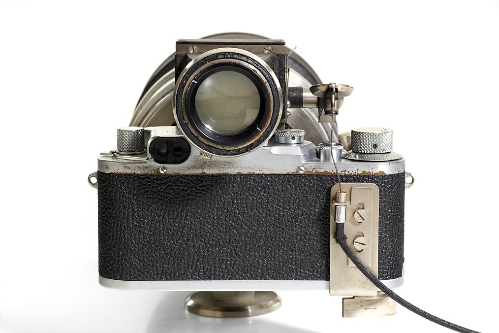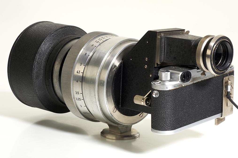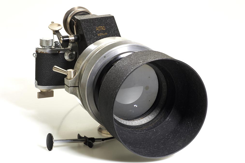 very rare and fast Astro Berlin Portrait lens with Astro Identoskop reflex housing no.36385 in excellent original condition, clean lenses, hood, for M39 screw-mount, with Leica IIIc no.511060 and special cable release mechanism