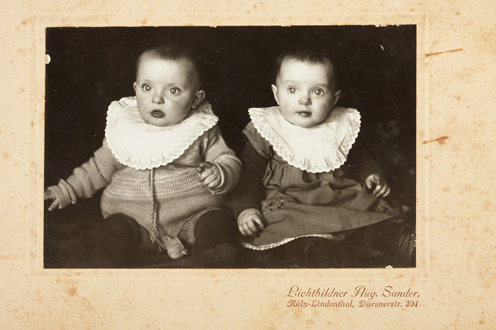 original vintage print of two young children (twins), format 10x6.5cm, mounted on cardboard, stamped: Lichtbildner Aug.Sander, Köln-Lindenthal, Dürenstrasse 201