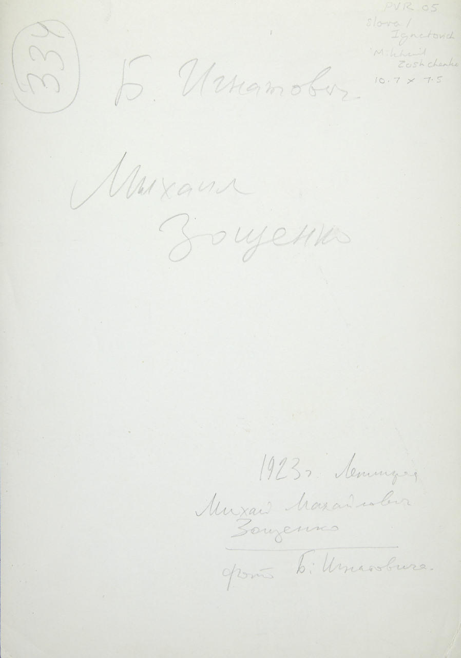 Gelatin silver print, printed in the 1960s 26,9 x 19 cm Annotated “B. Ignatovich. Mikhail Zoshchenko” (Cyrillic) in an unidentified hand in pencil, annotated “1923. Leningrad. Mikhail Mikhailovich Zoshchenko. Photo by B. Ignatovich” (Cyrillic) in another unidentified hand in pencil on the reverse PROVENANCE Howard Schickler Fine Art, New York